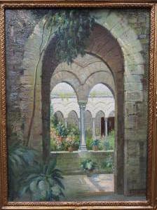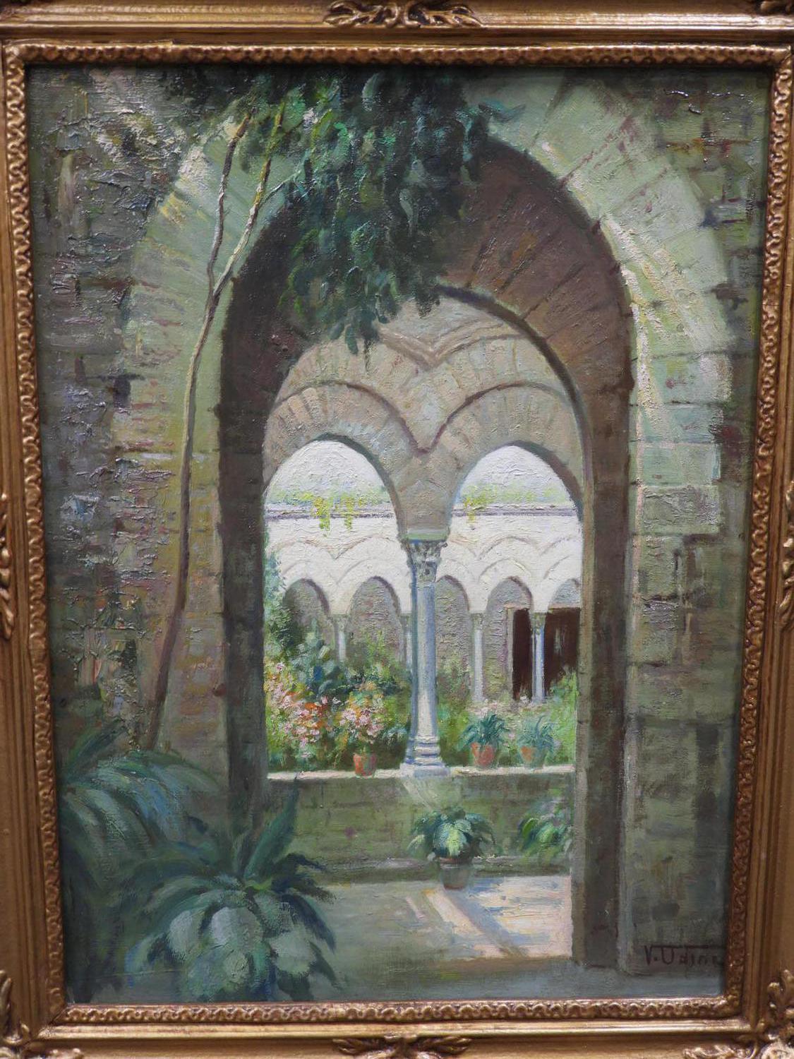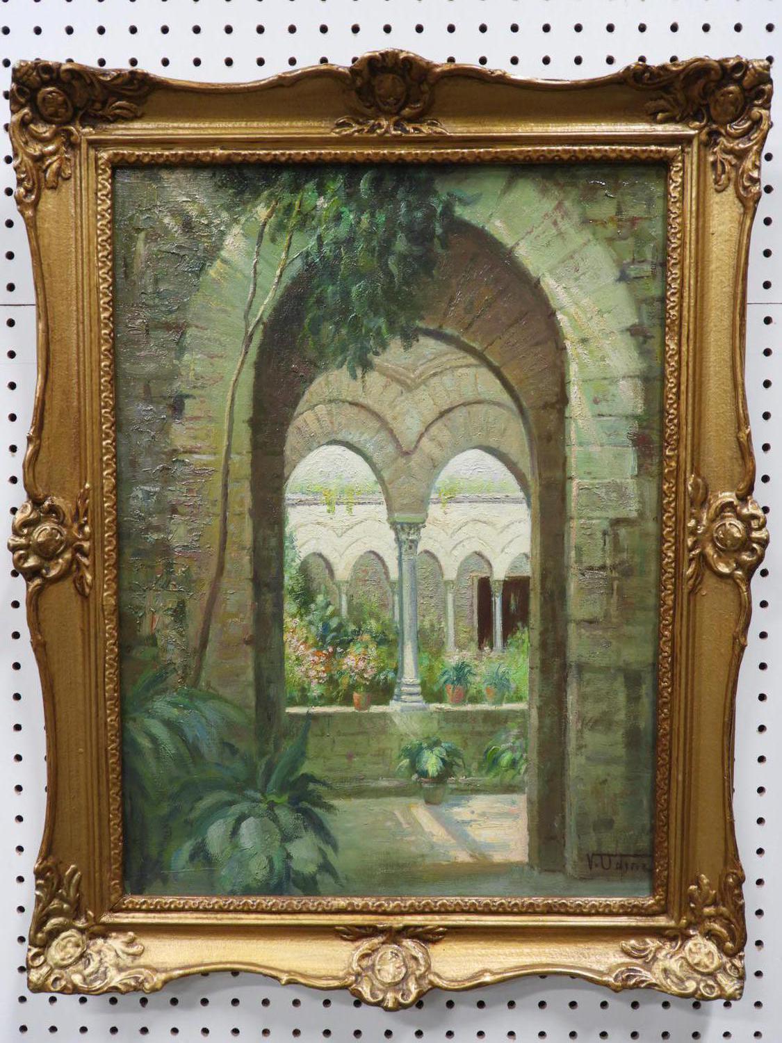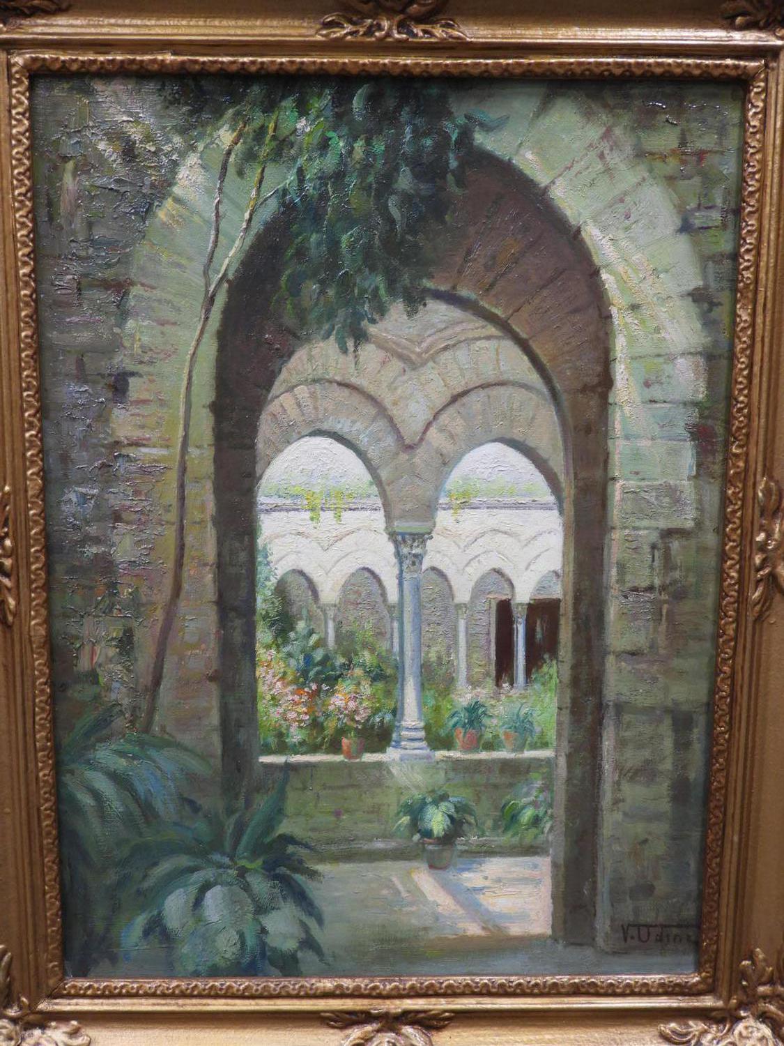 vincenzo udine (1898-1981), oil on board, 23" x 17", "untitled - view from a court yard"