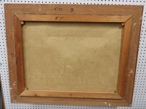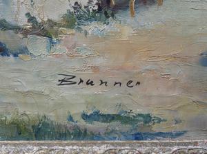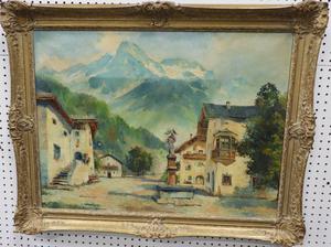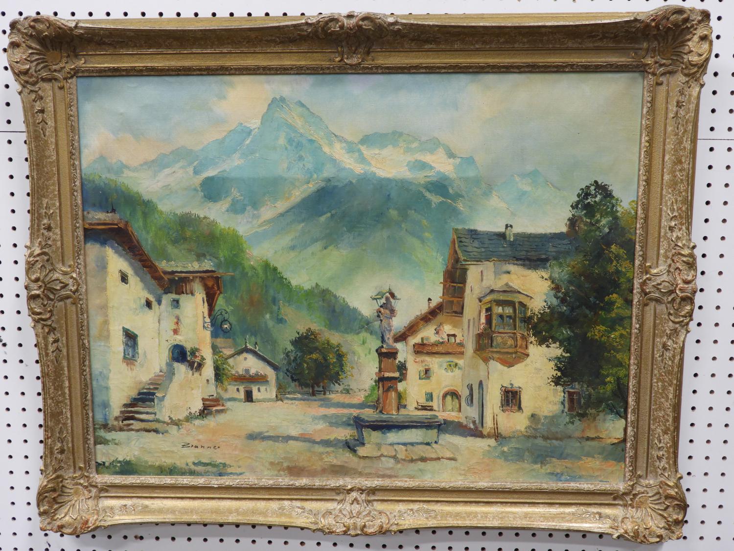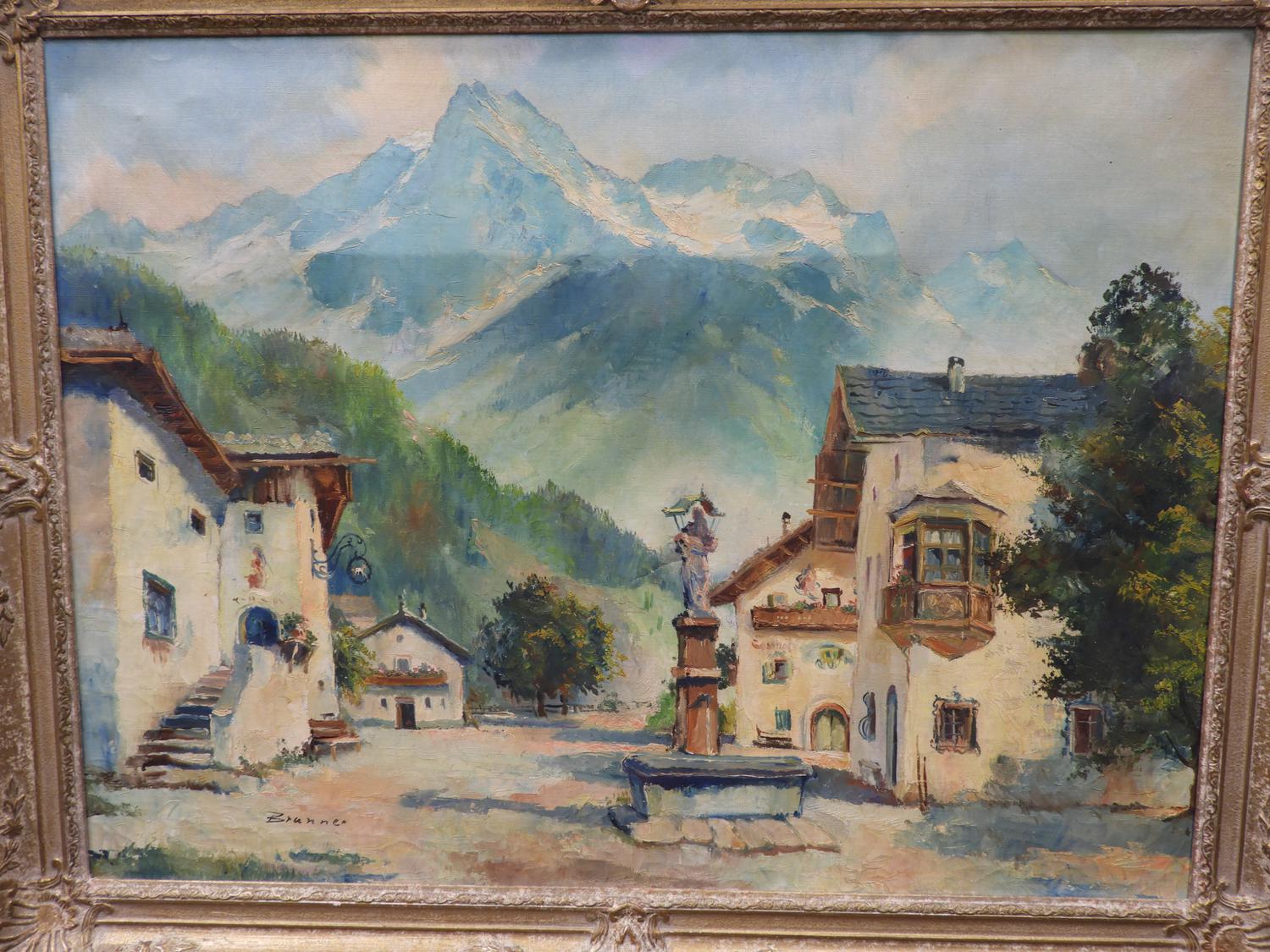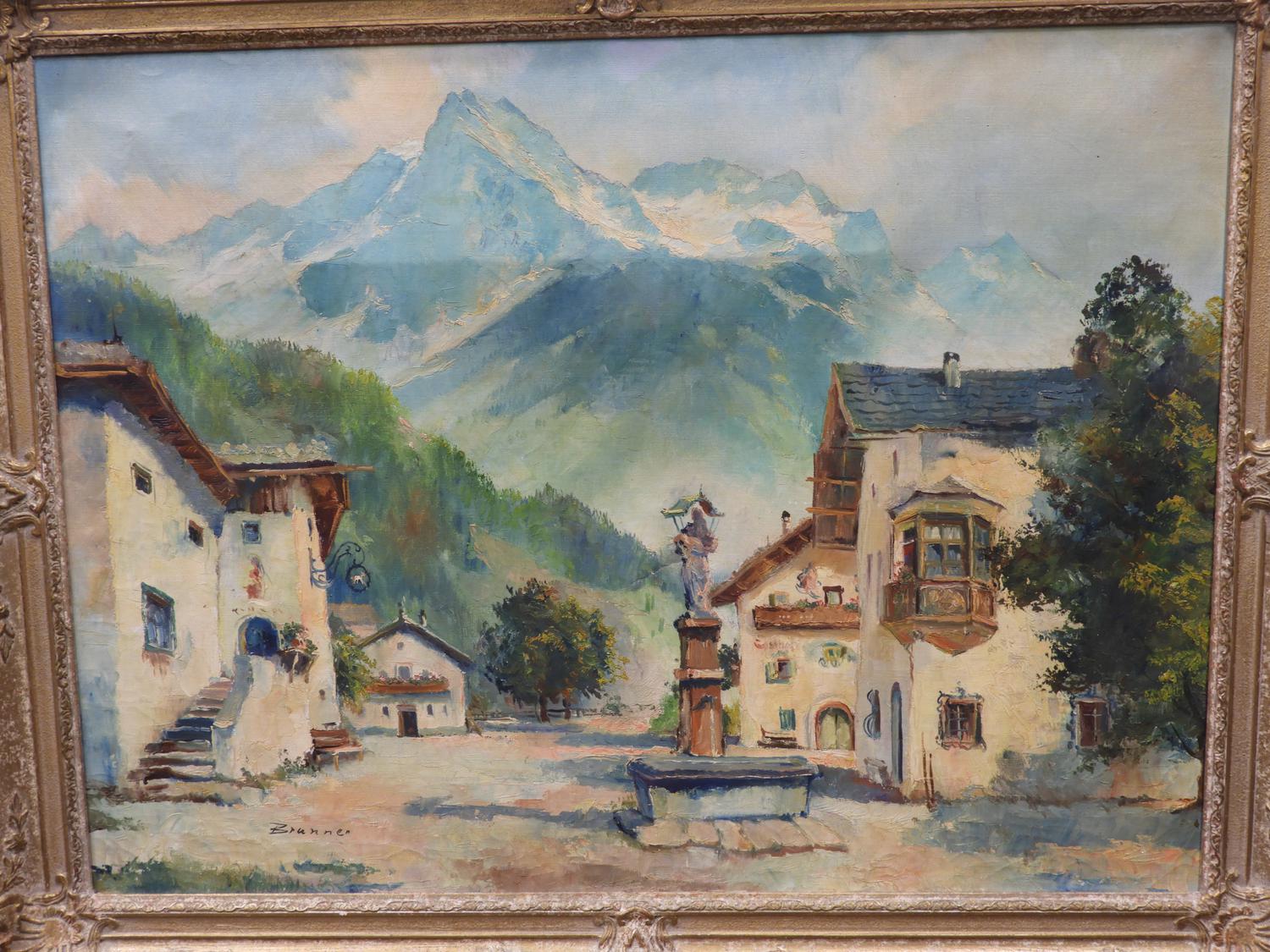 indistinctly signed "brunner", oil on canvas, 24" x 32", "village square - mountain landscape"