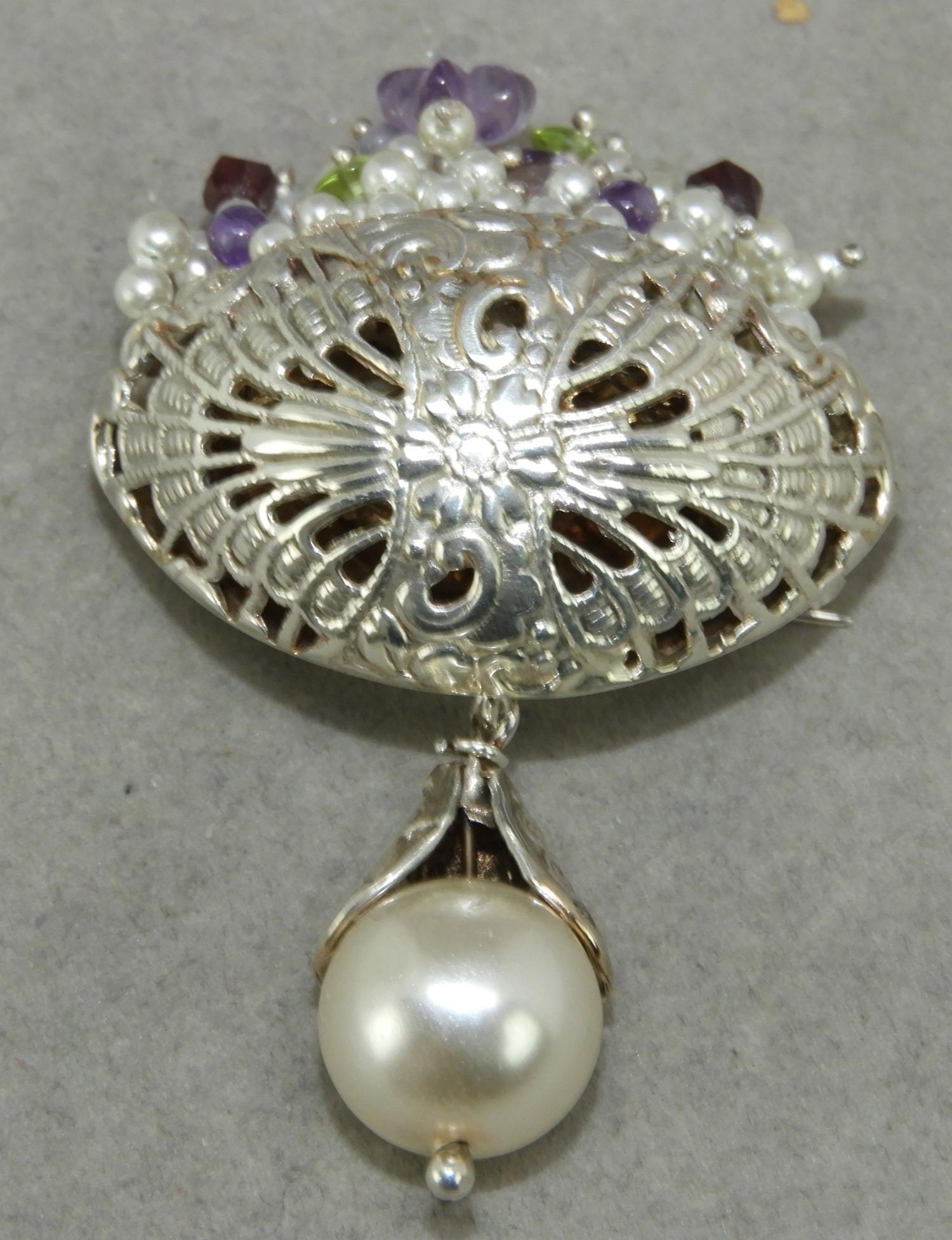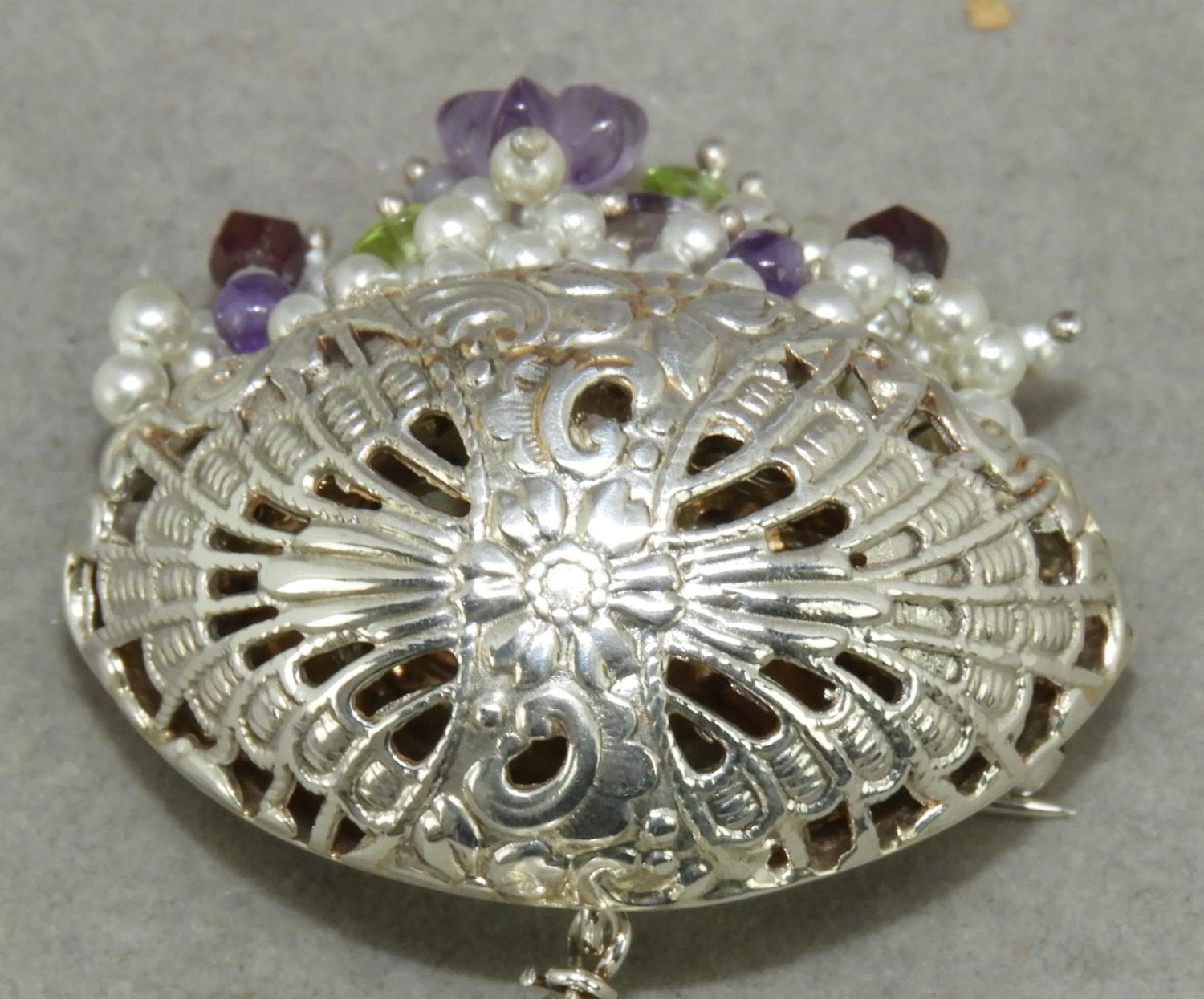 sterling silver tumbled gemstone flower brooch