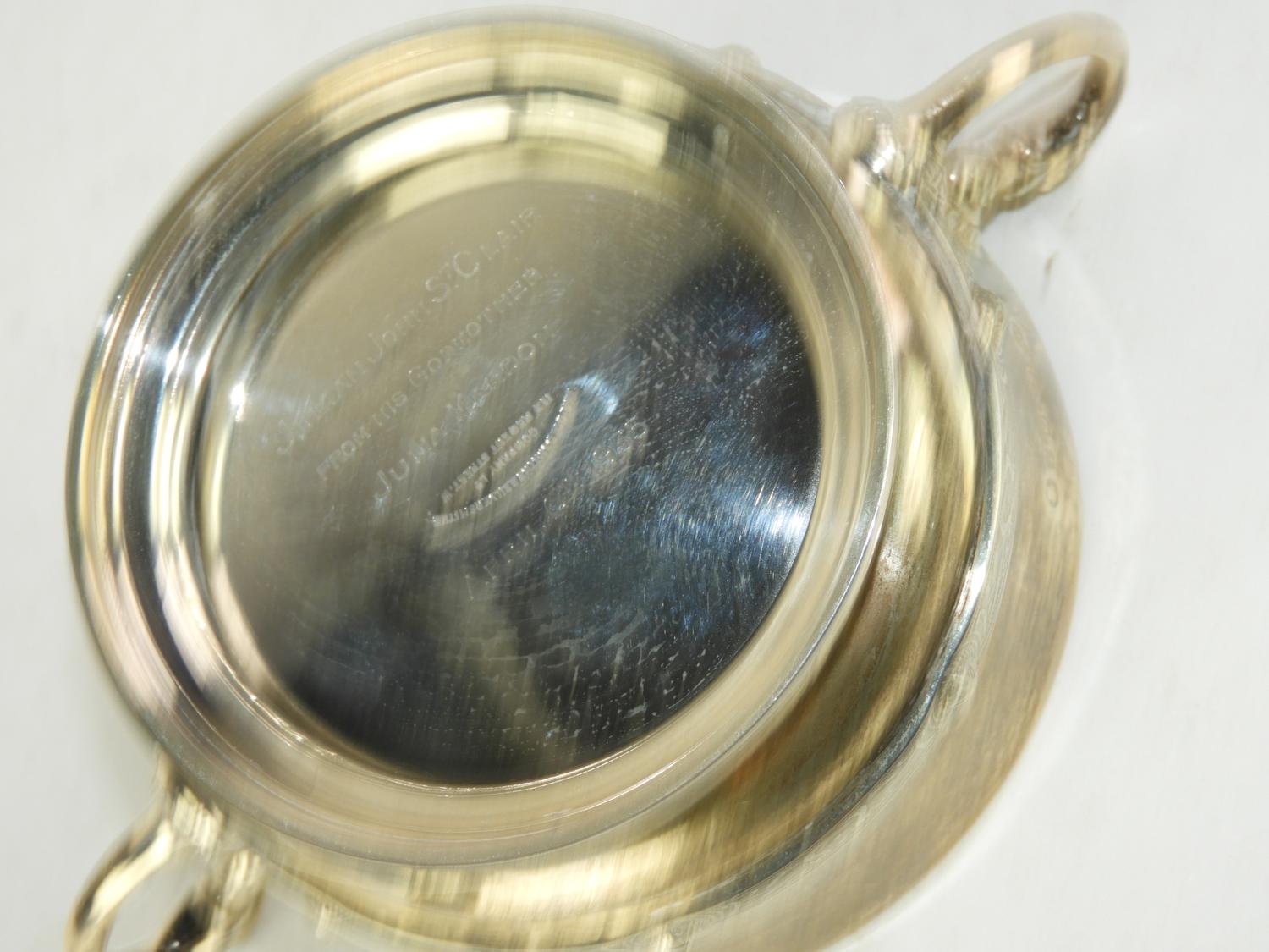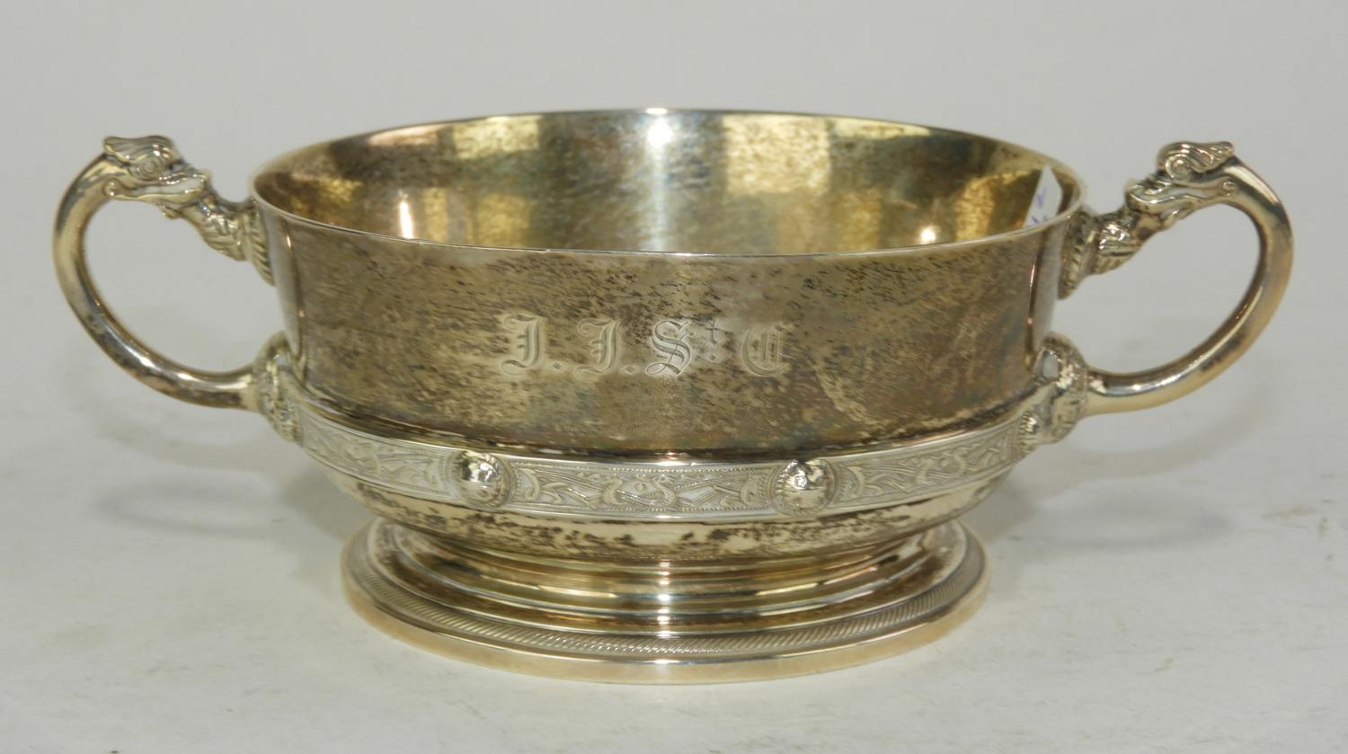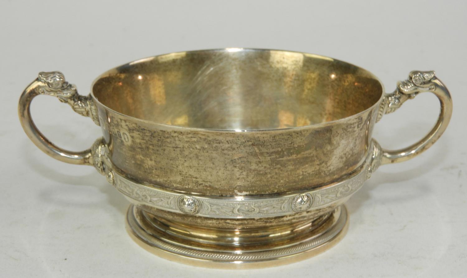 hallmarked sterling silver 2 handled cup with celtic decoration, 274 grams 2" in height, 4 1/4" in diameter