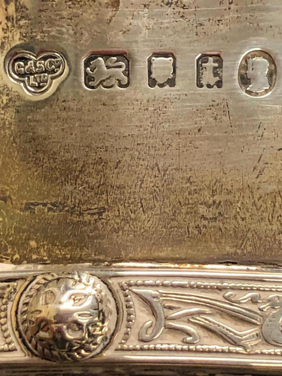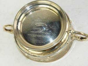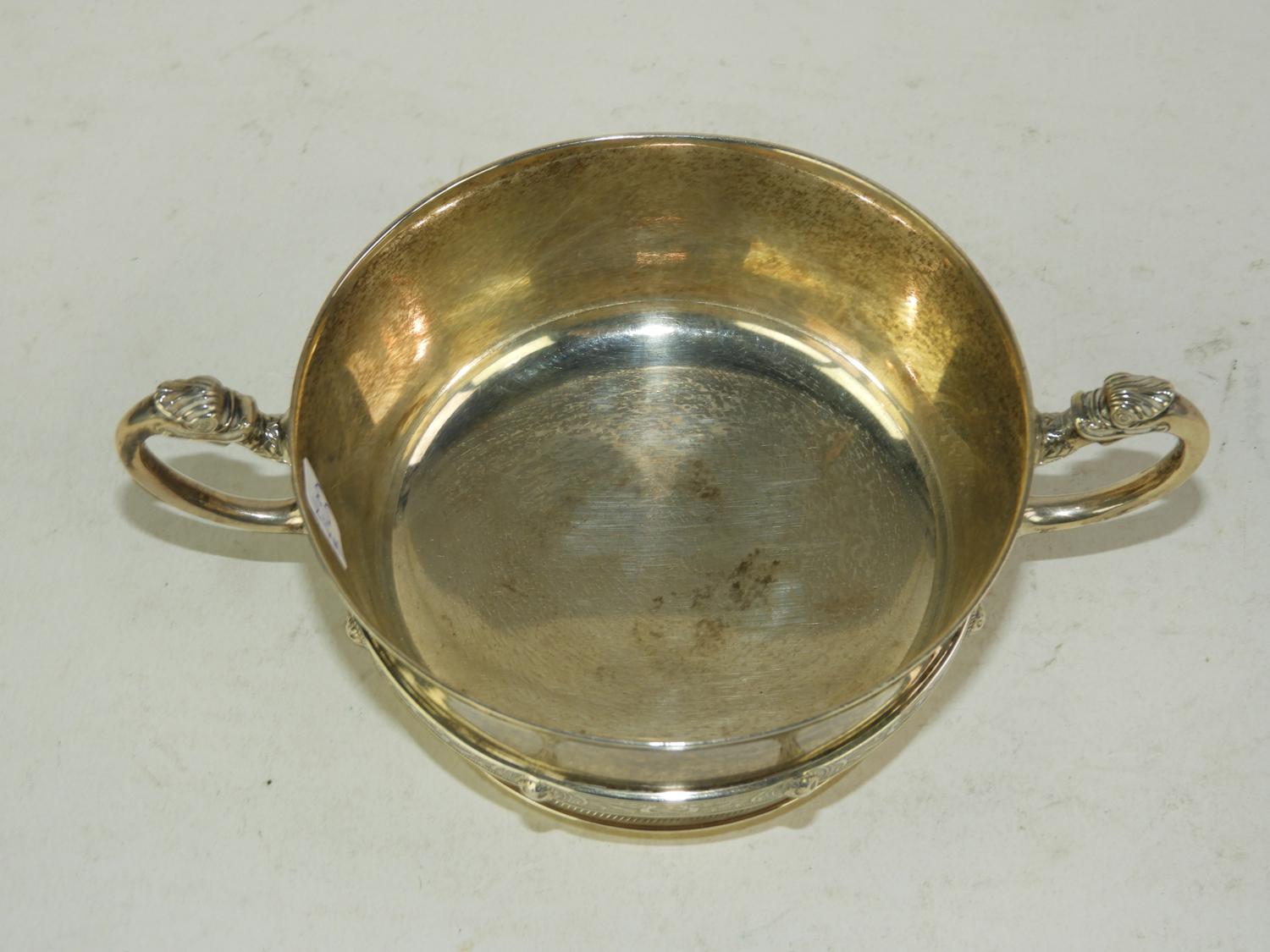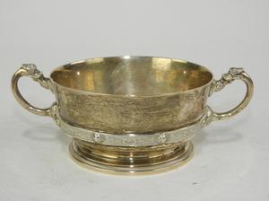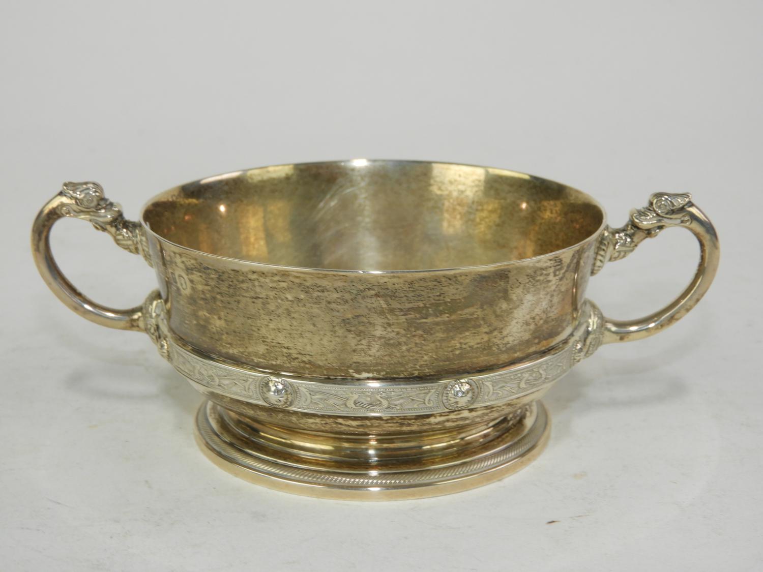 hallmarked sterling silver 2 handled cup with celtic decoration, 274 grams 2" in height, 4 1/4" in diameter