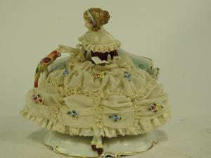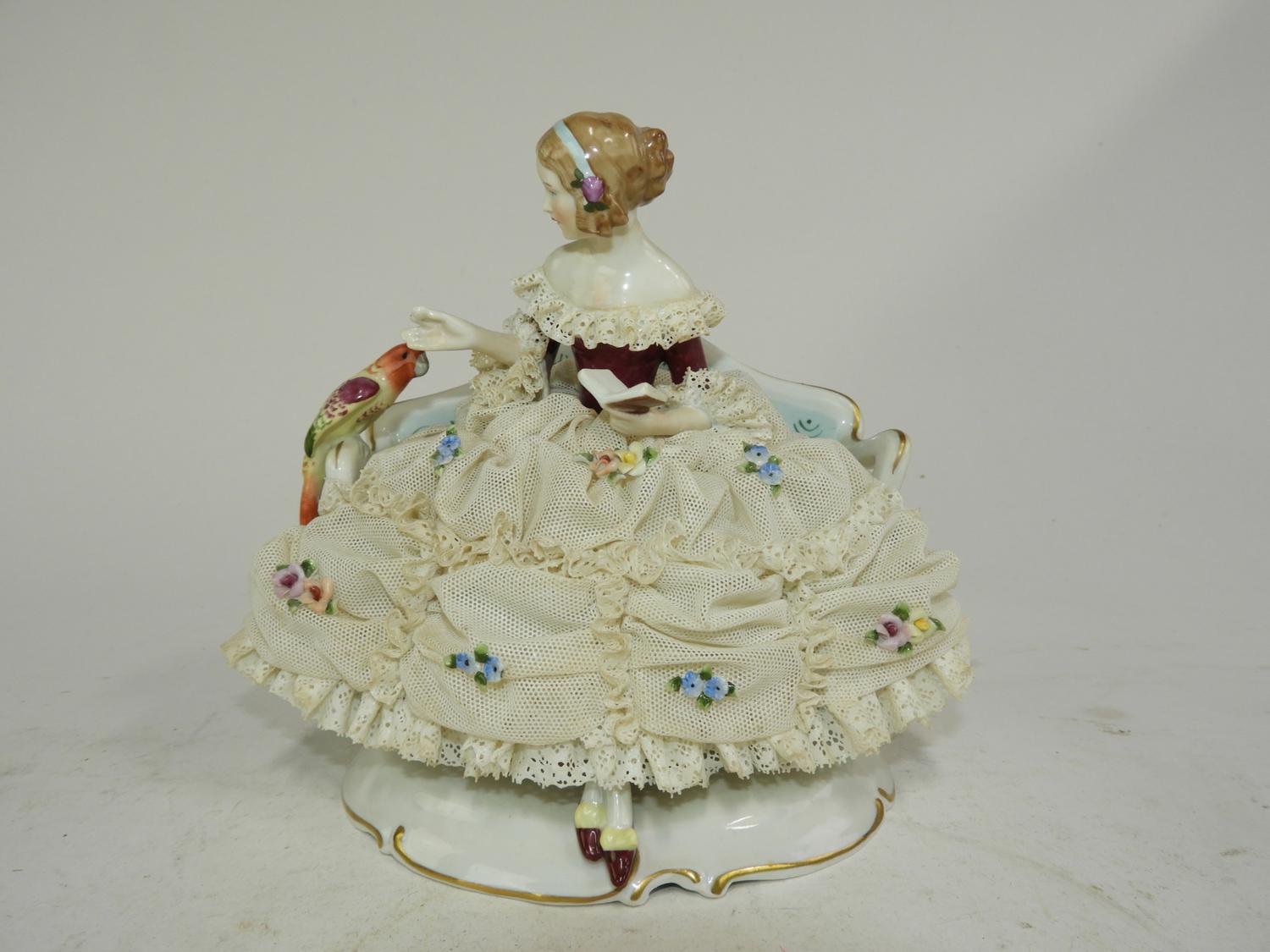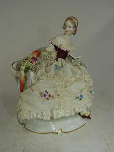 german figure of a seated girl feeding bird, 7 1/2" x 8" x 4"