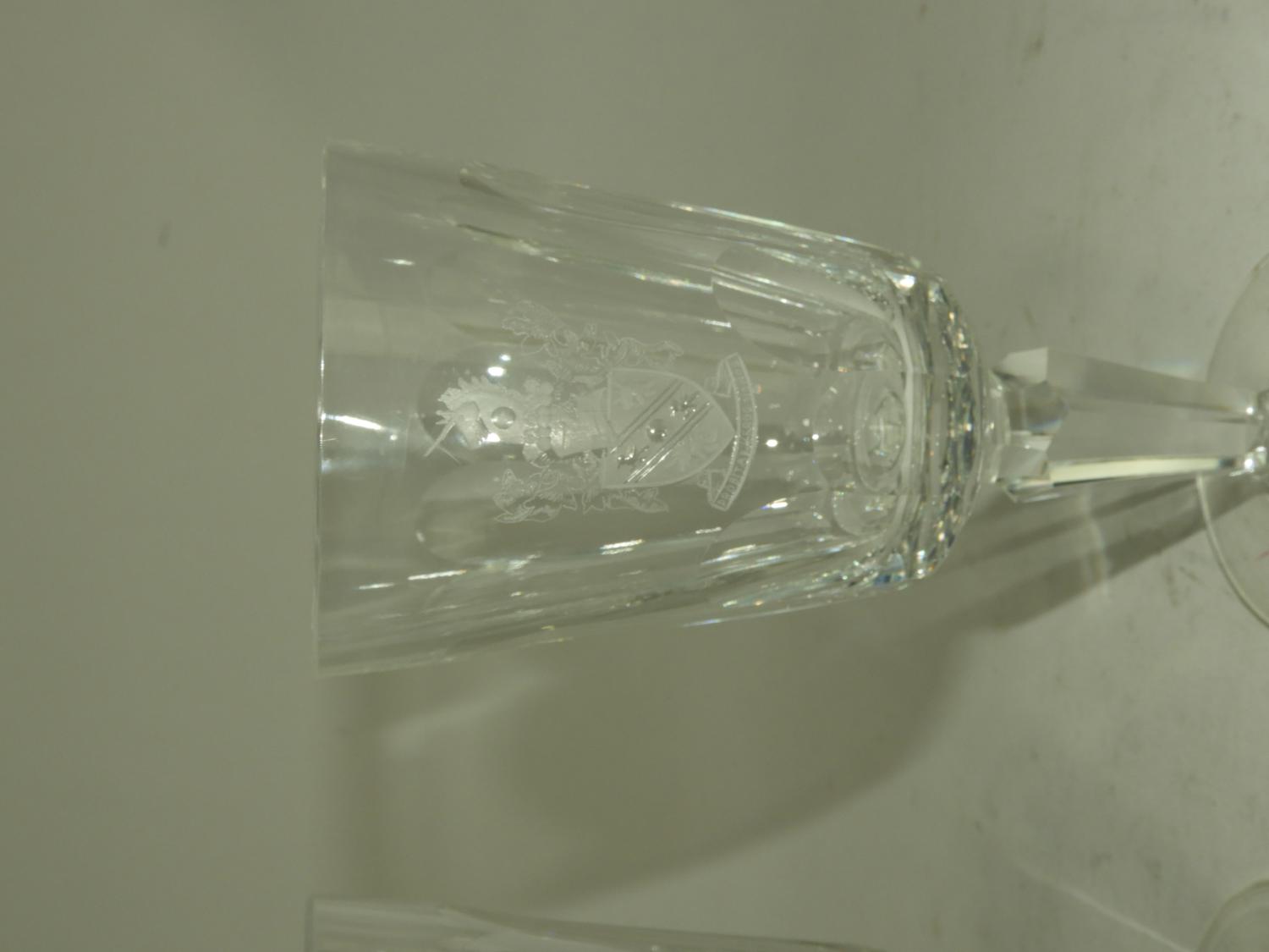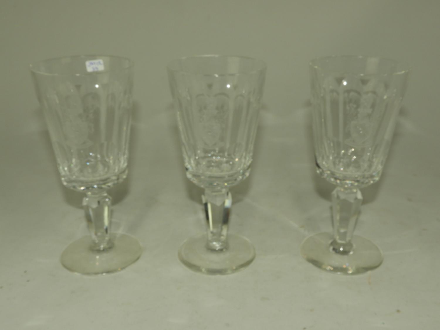 three waterford stem glasses bearing etched military crest, ht 7 1/4"