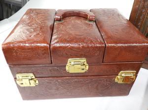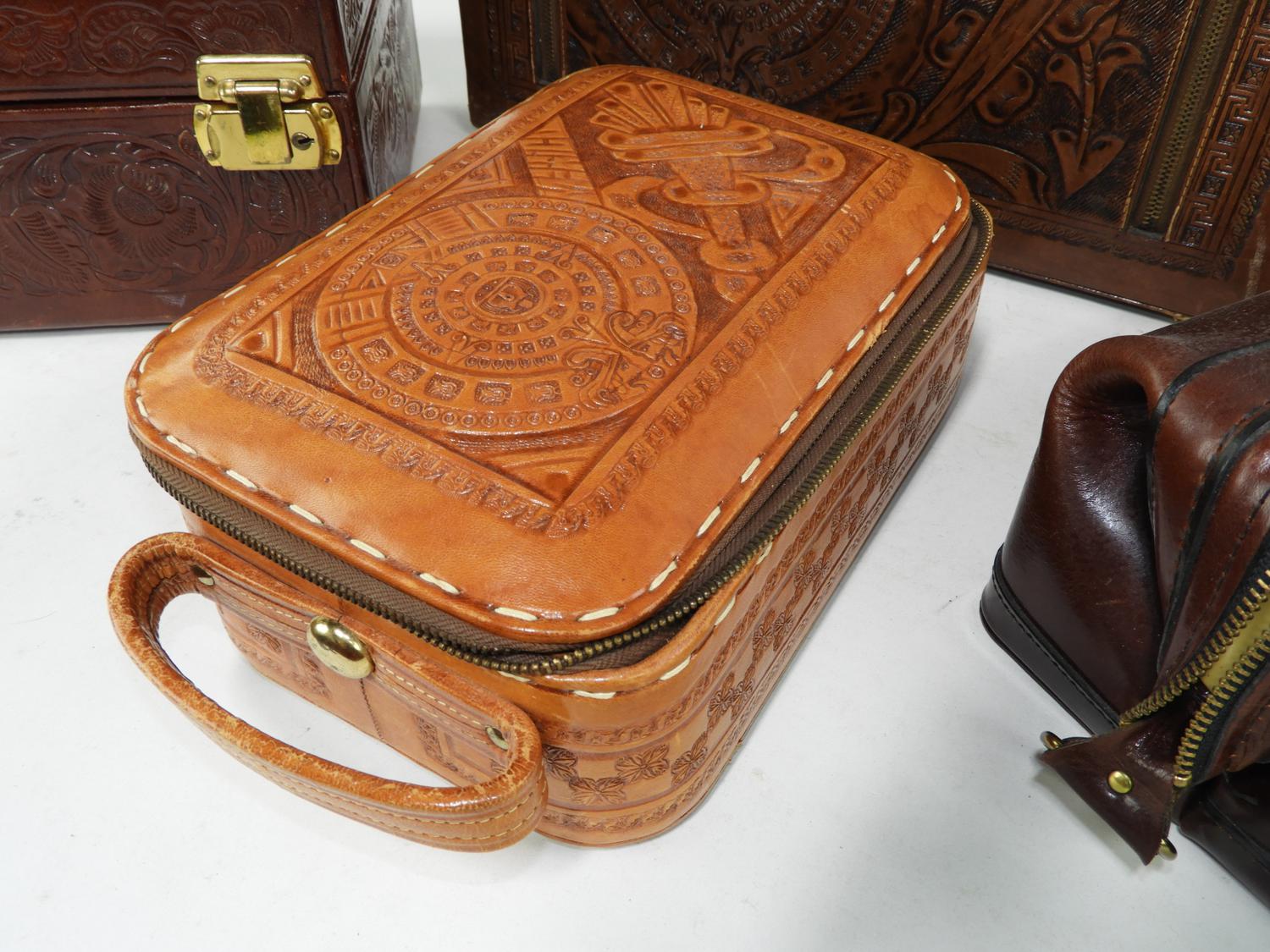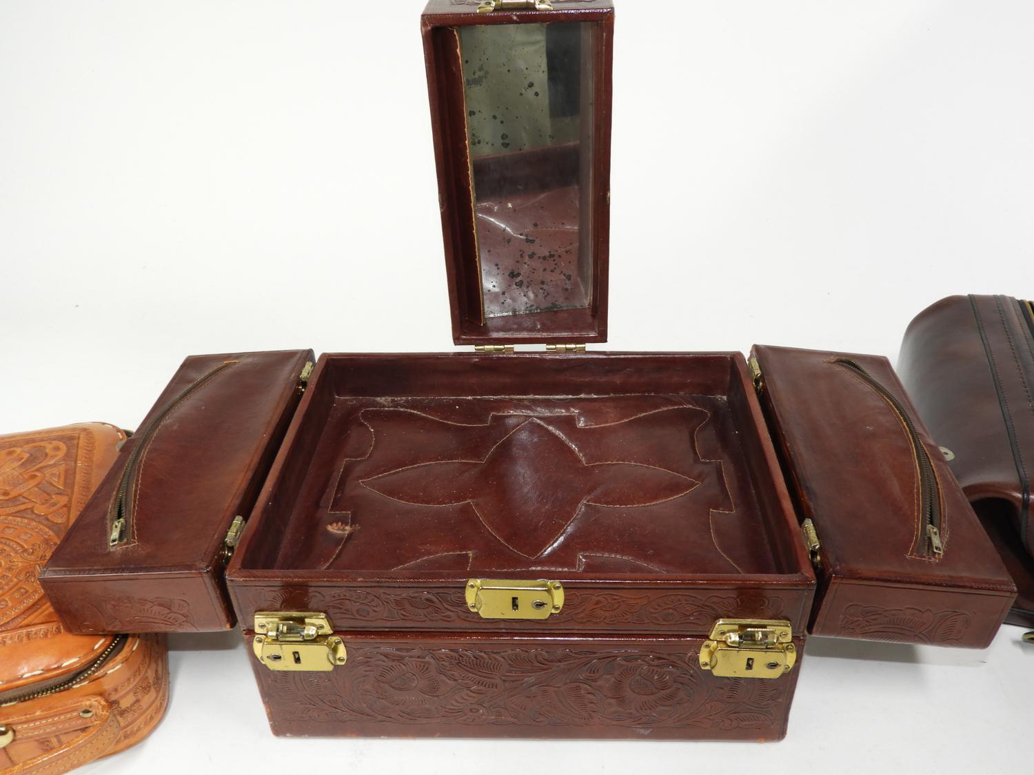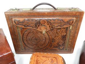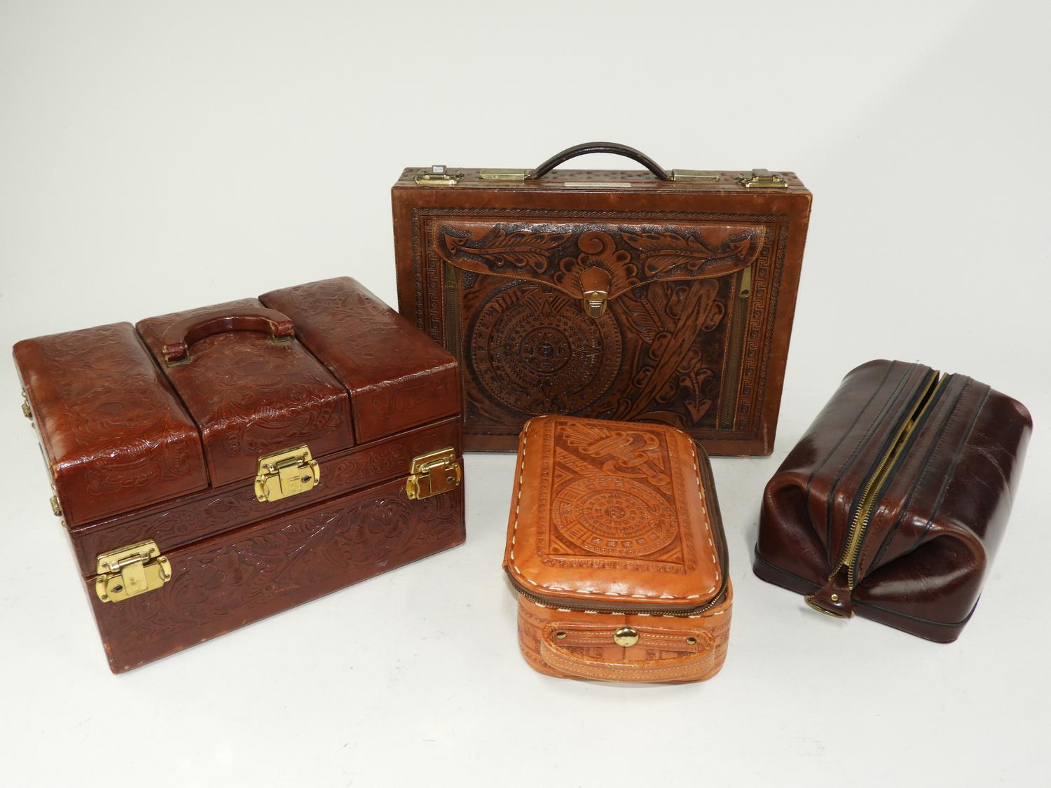 four pieces of tooled leather, briefcase, jewelry box and two bags