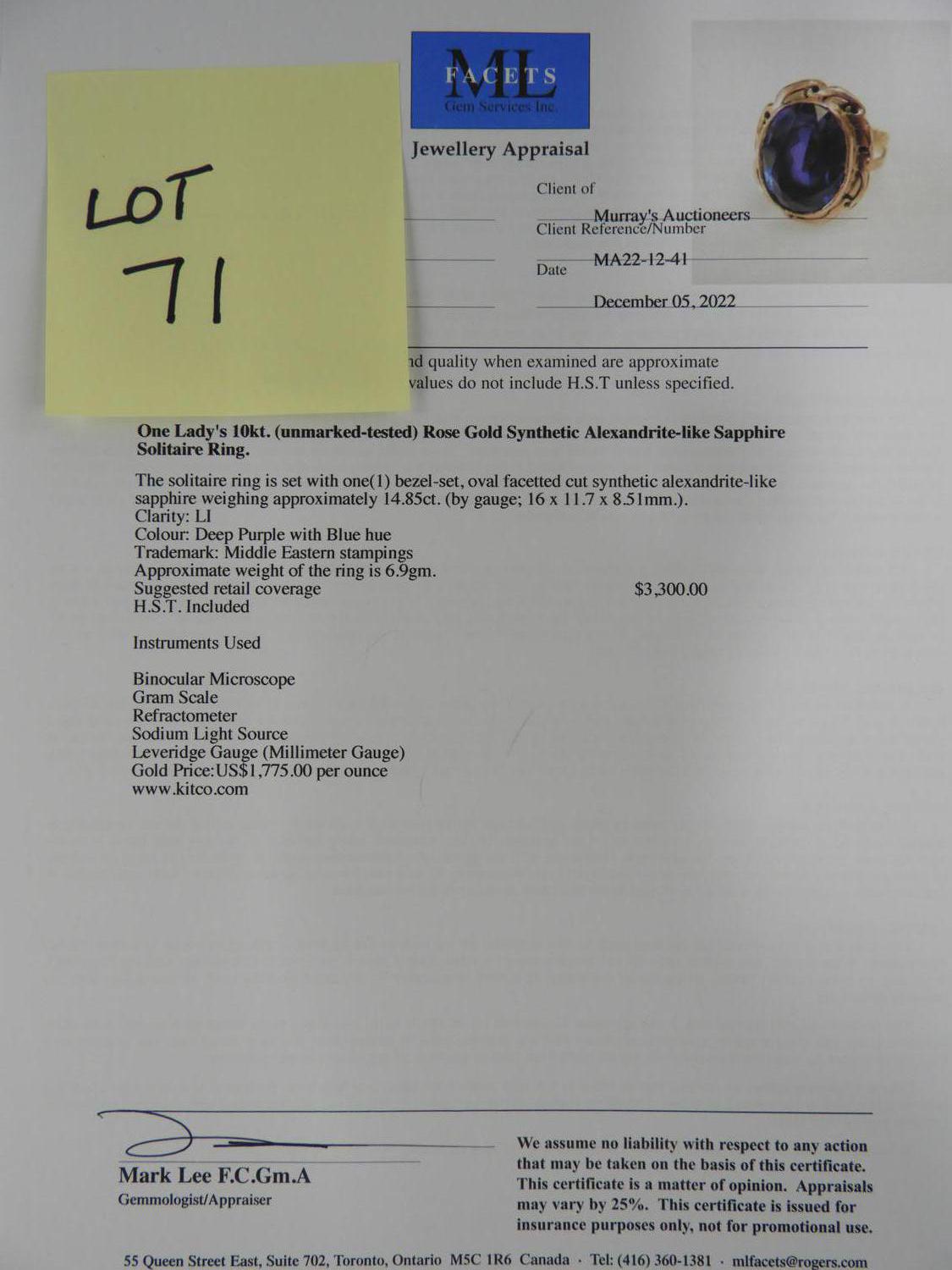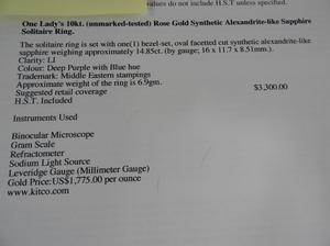 10k rose gold synthetic alexandrite ring, with appraisal
