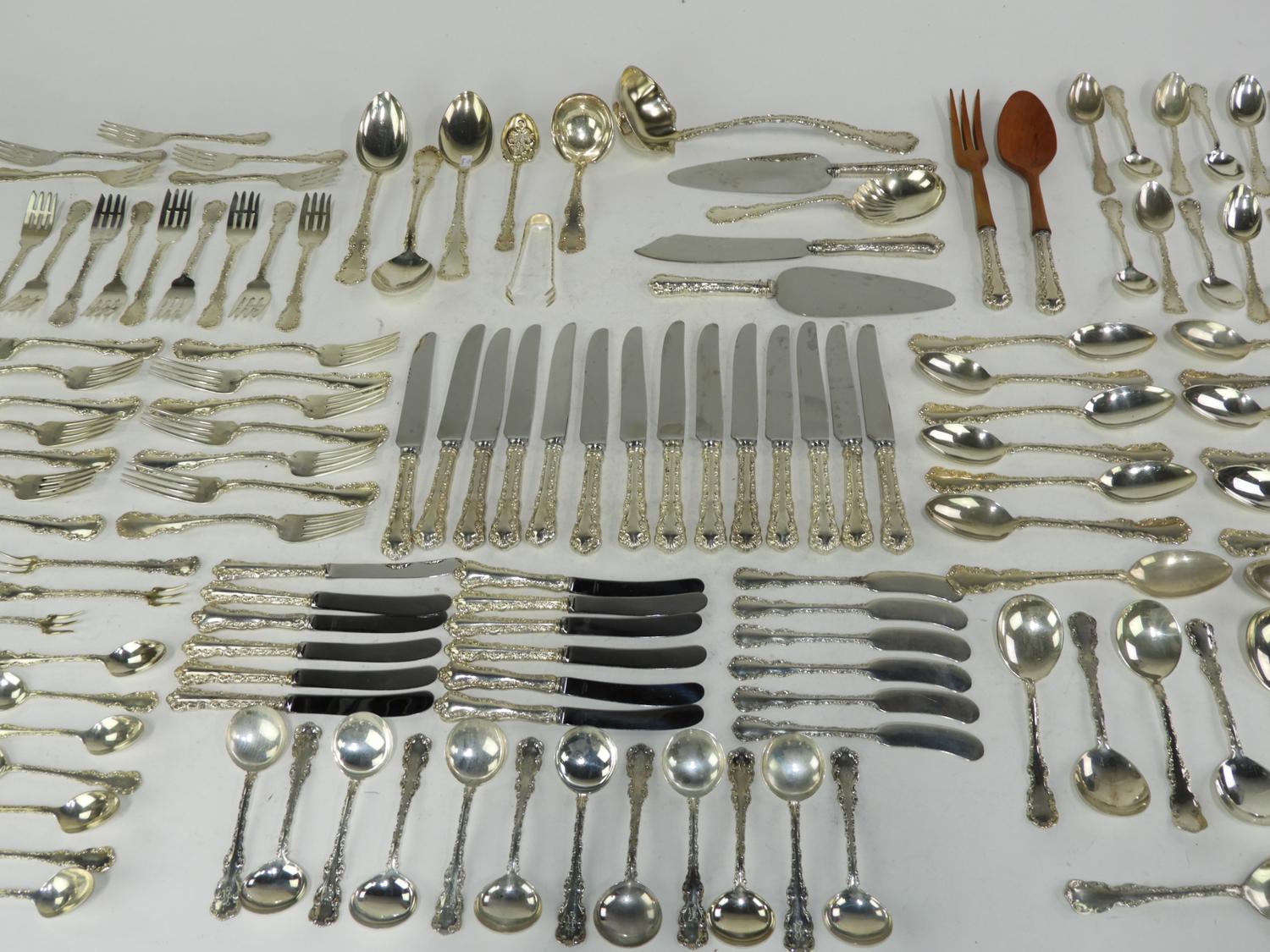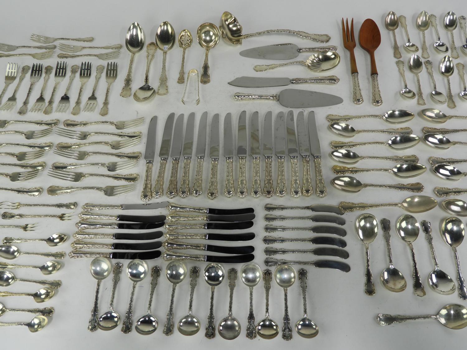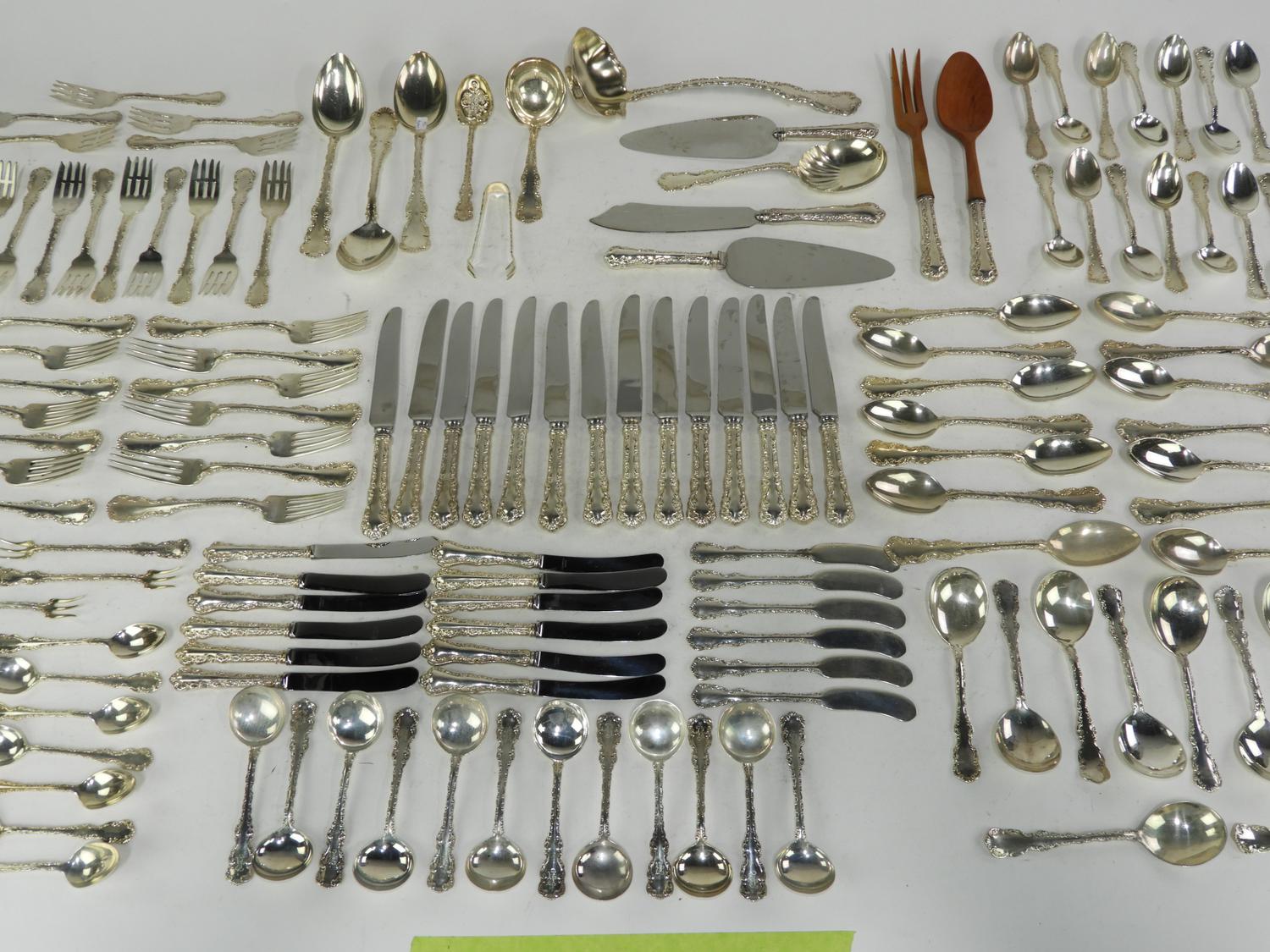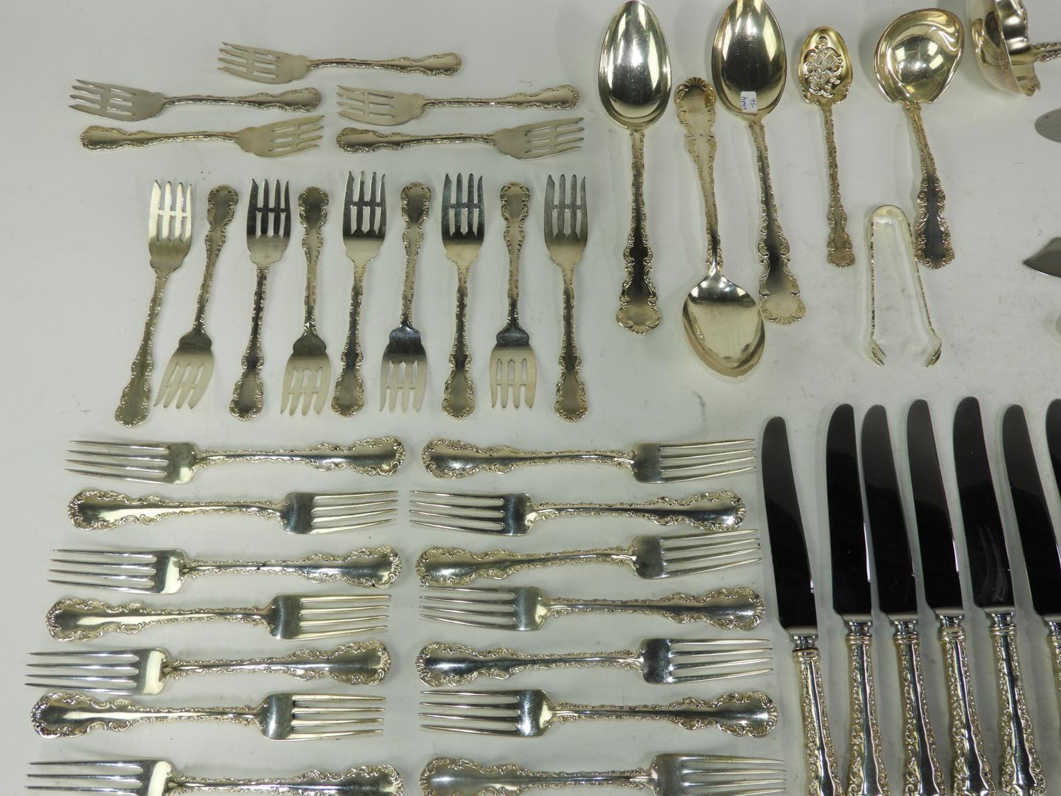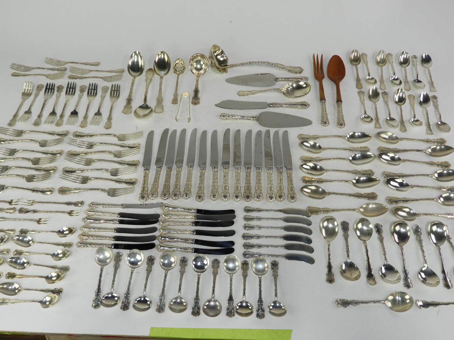 plus 12 butter knives, 14 dinner knives, 2pc salad servers, 2 cake lifters and one cake knife with sterling silver handles