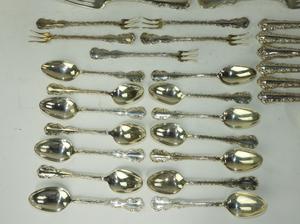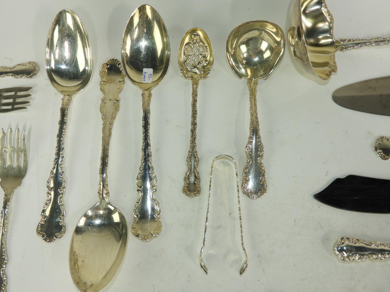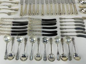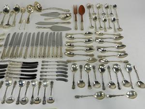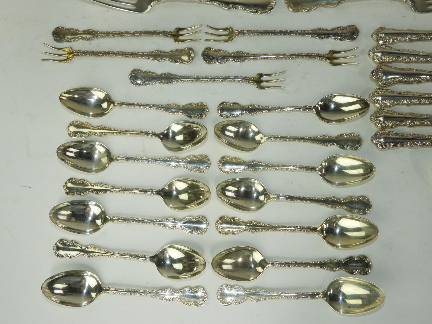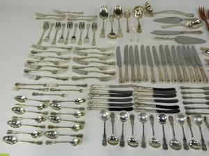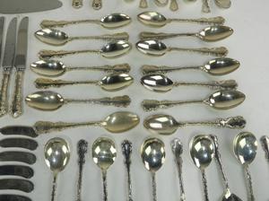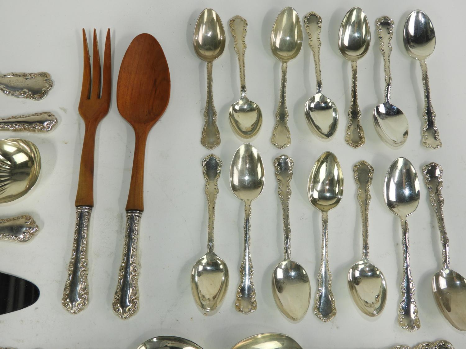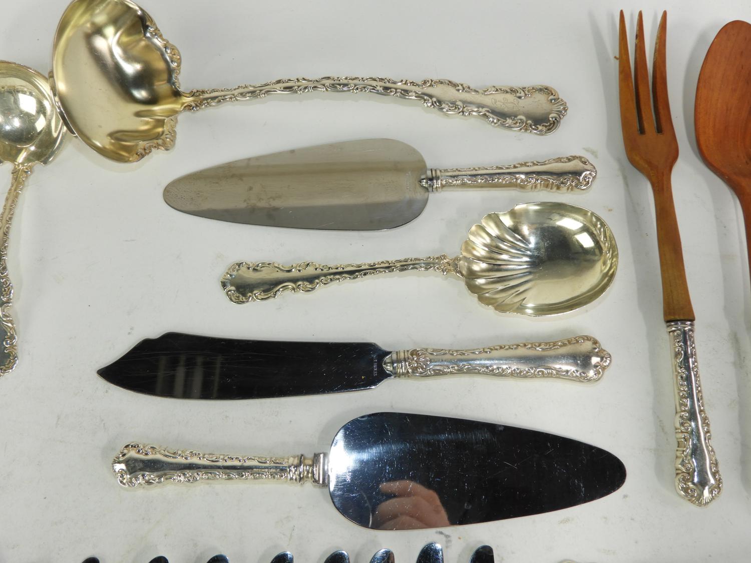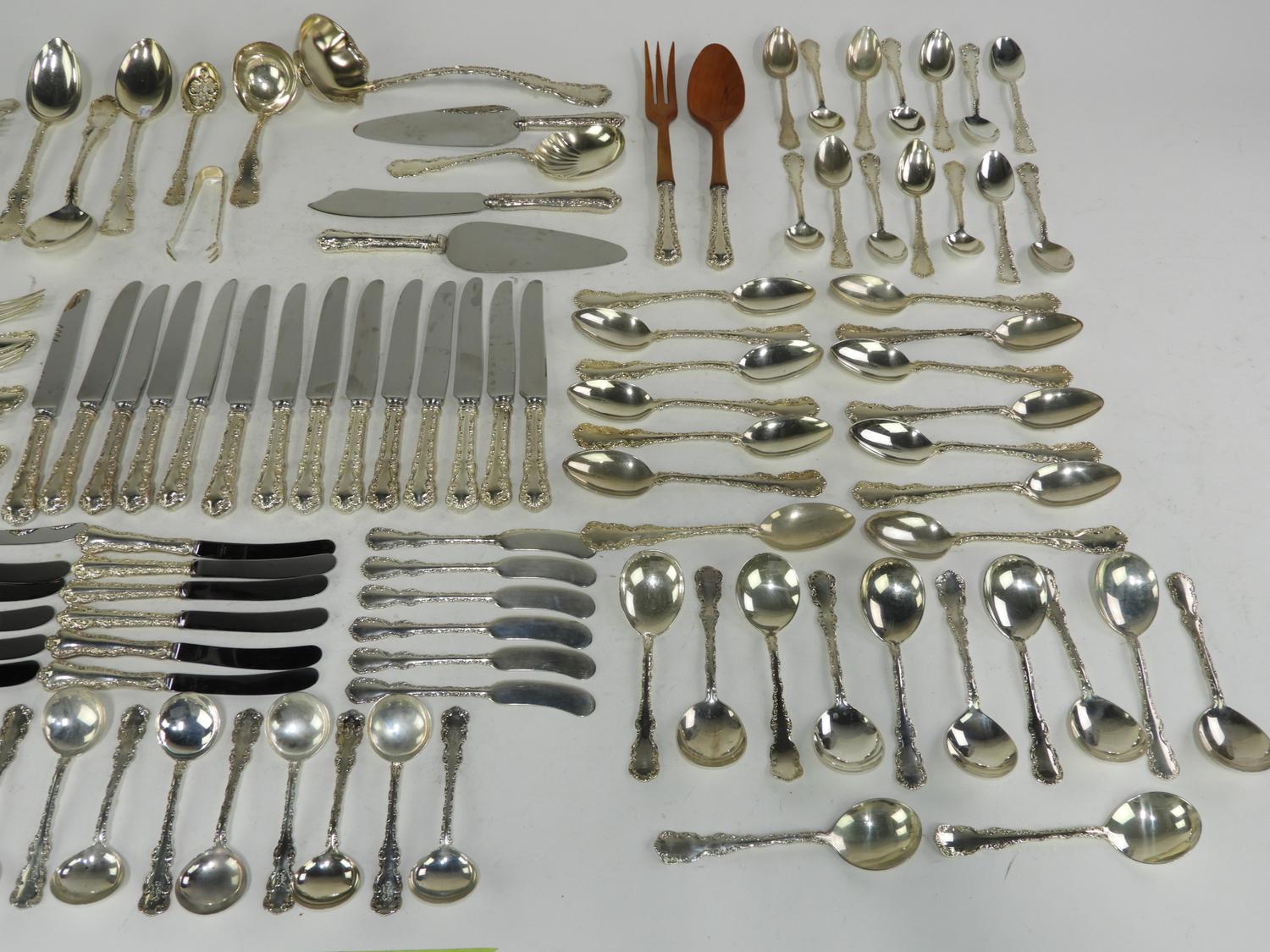 plus 12 butter knives, 14 dinner knives, 2pc salad servers, 2 cake lifters and one cake knife with sterling silver handles