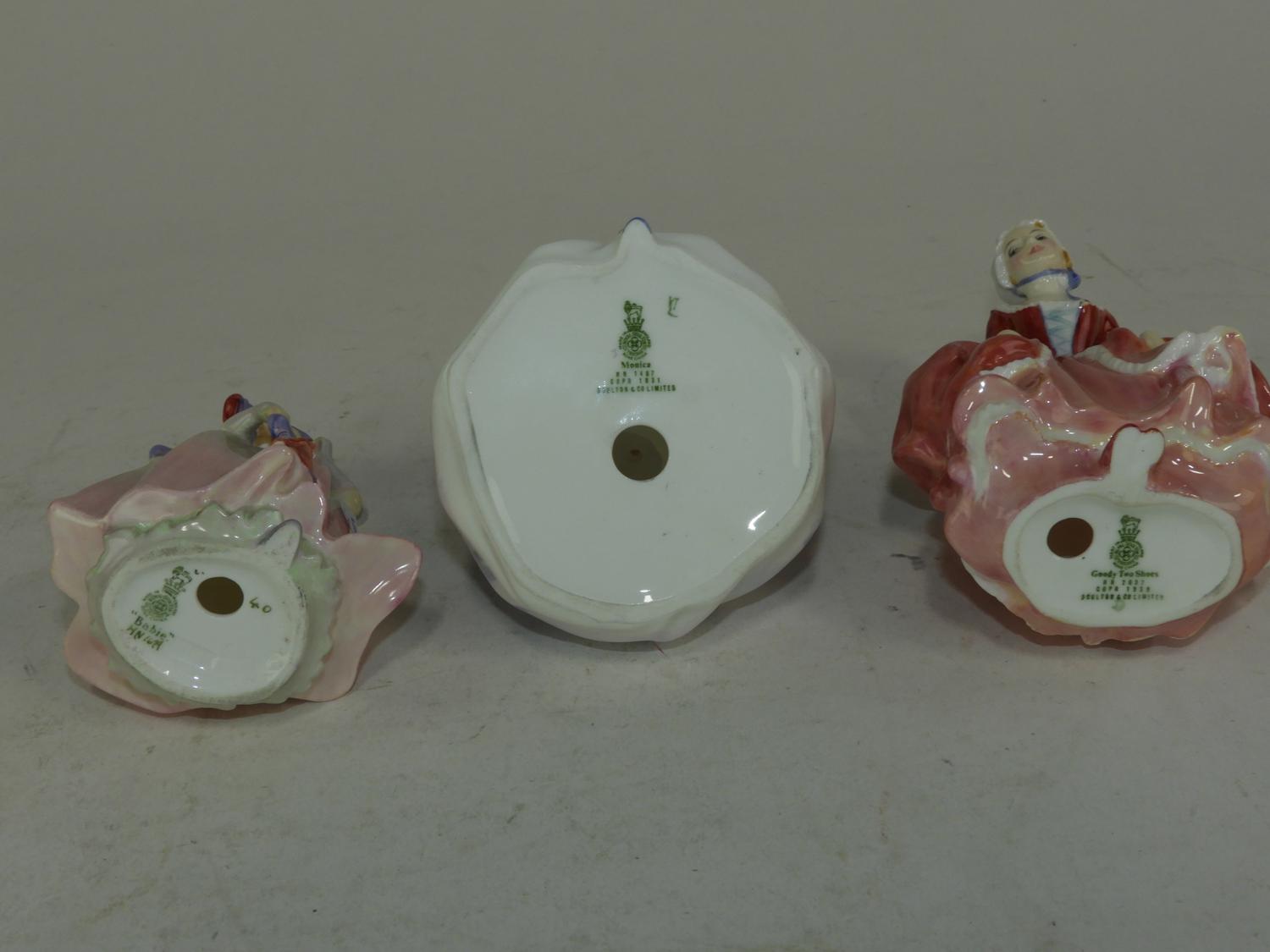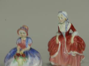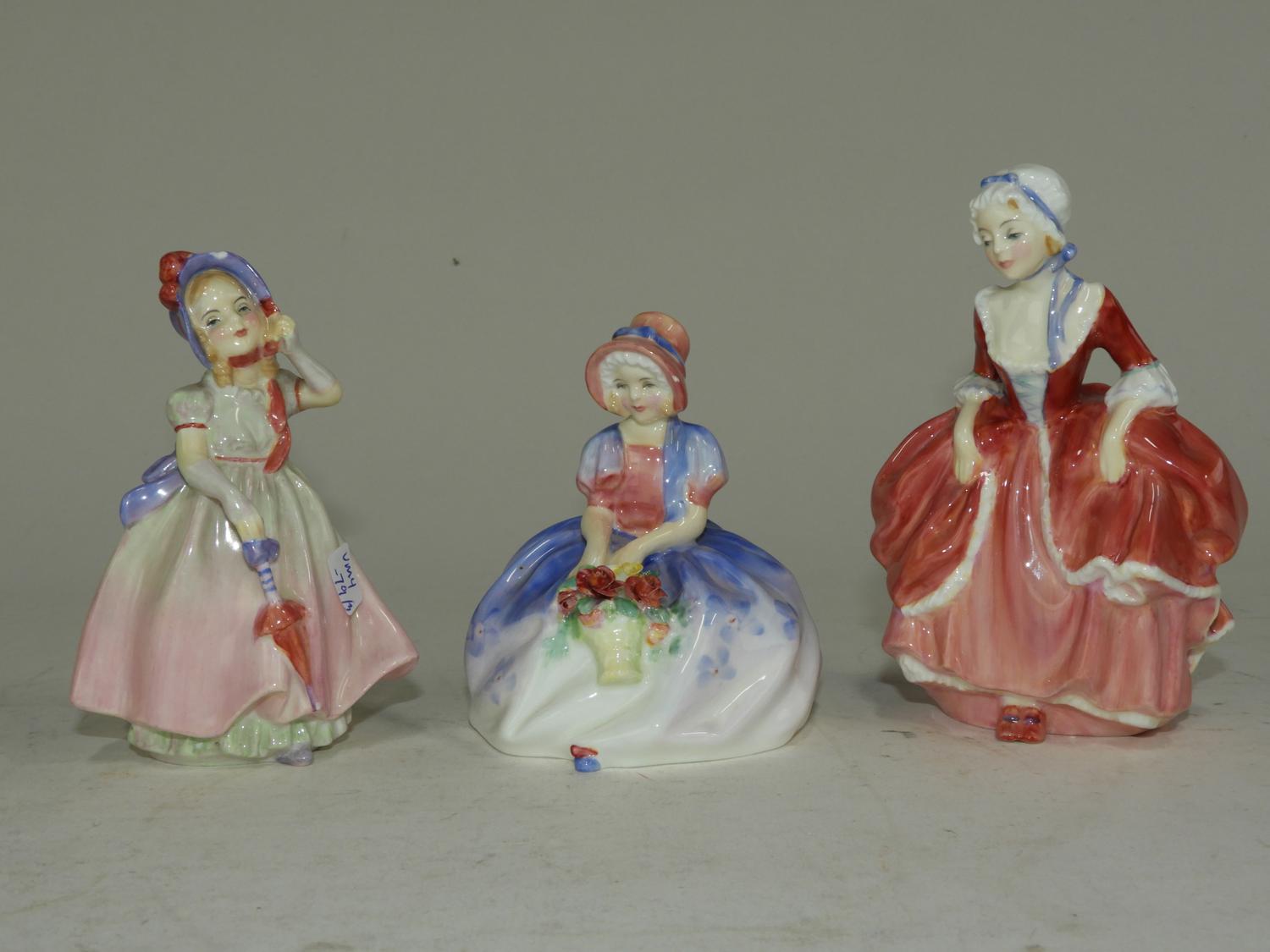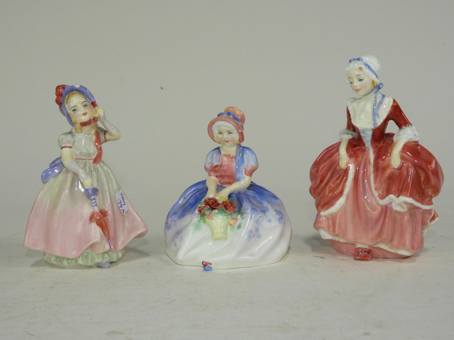 three royal doulton figurines "babie", "monica" and "goody two shoes"