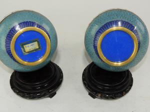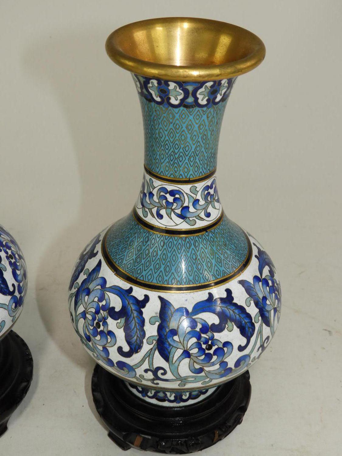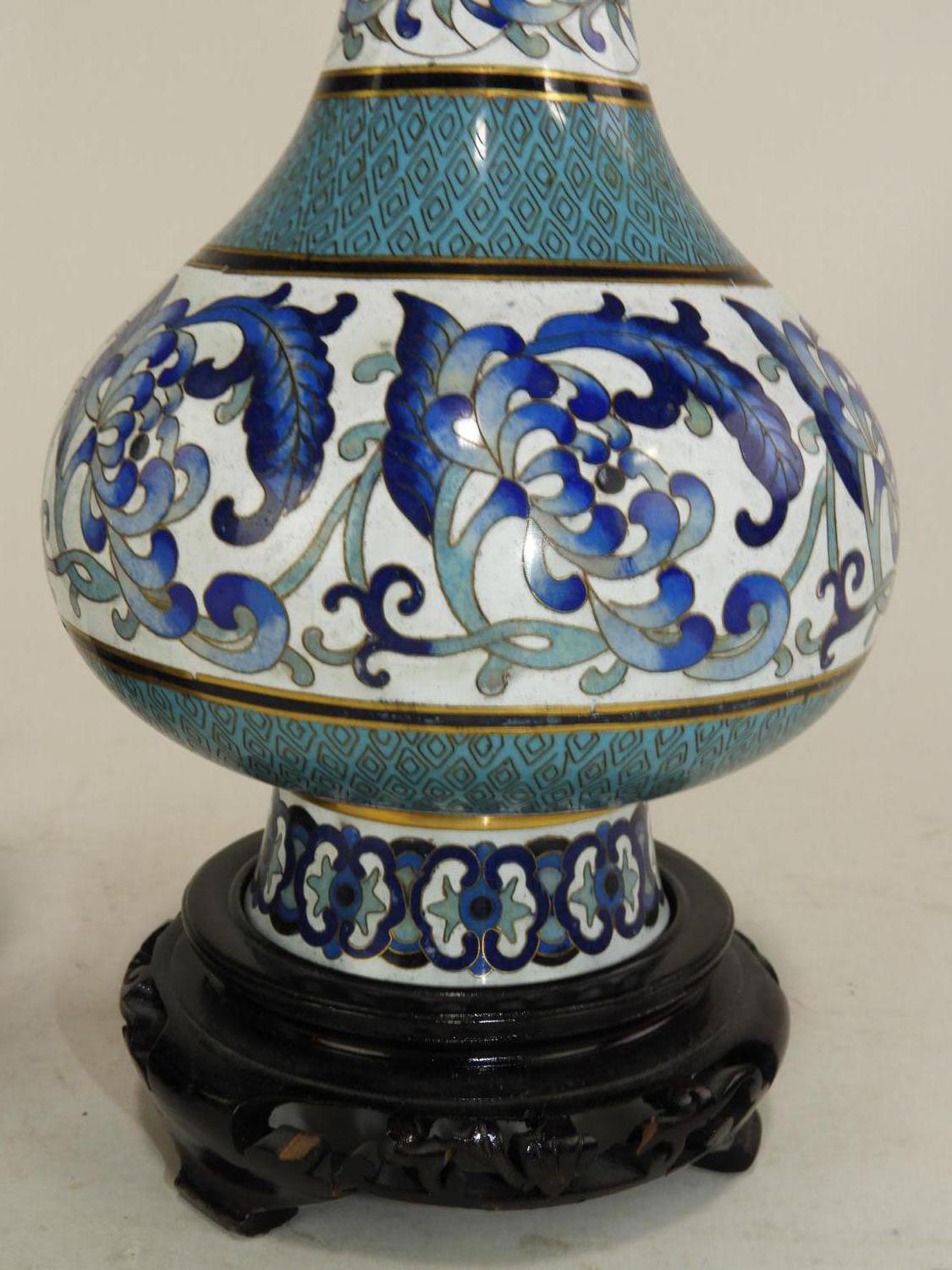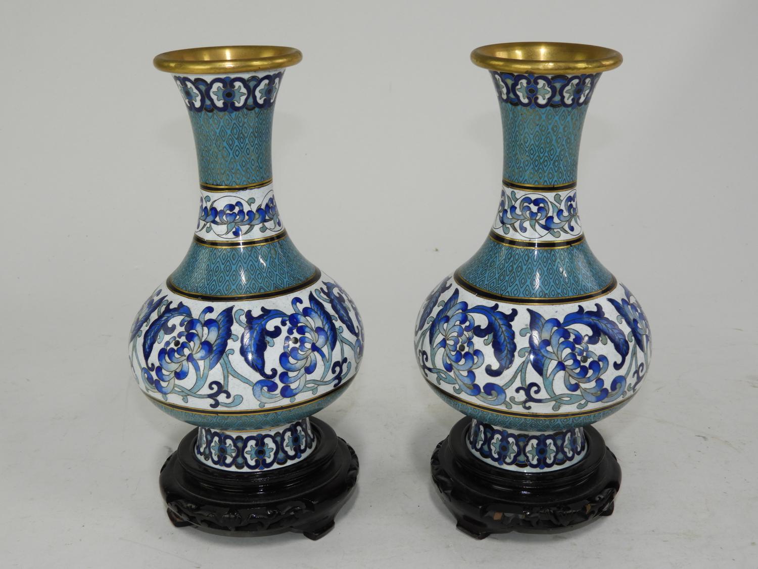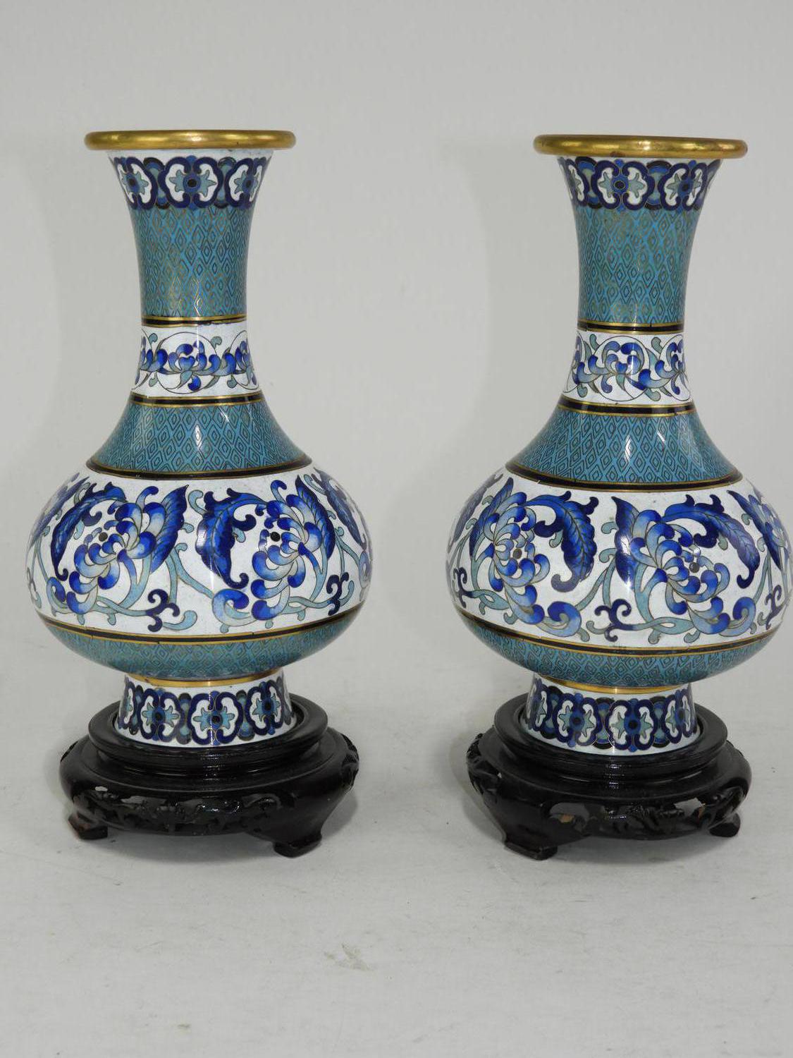 pair of cloisonne enamel vases on stand, ht. 10 1/2"