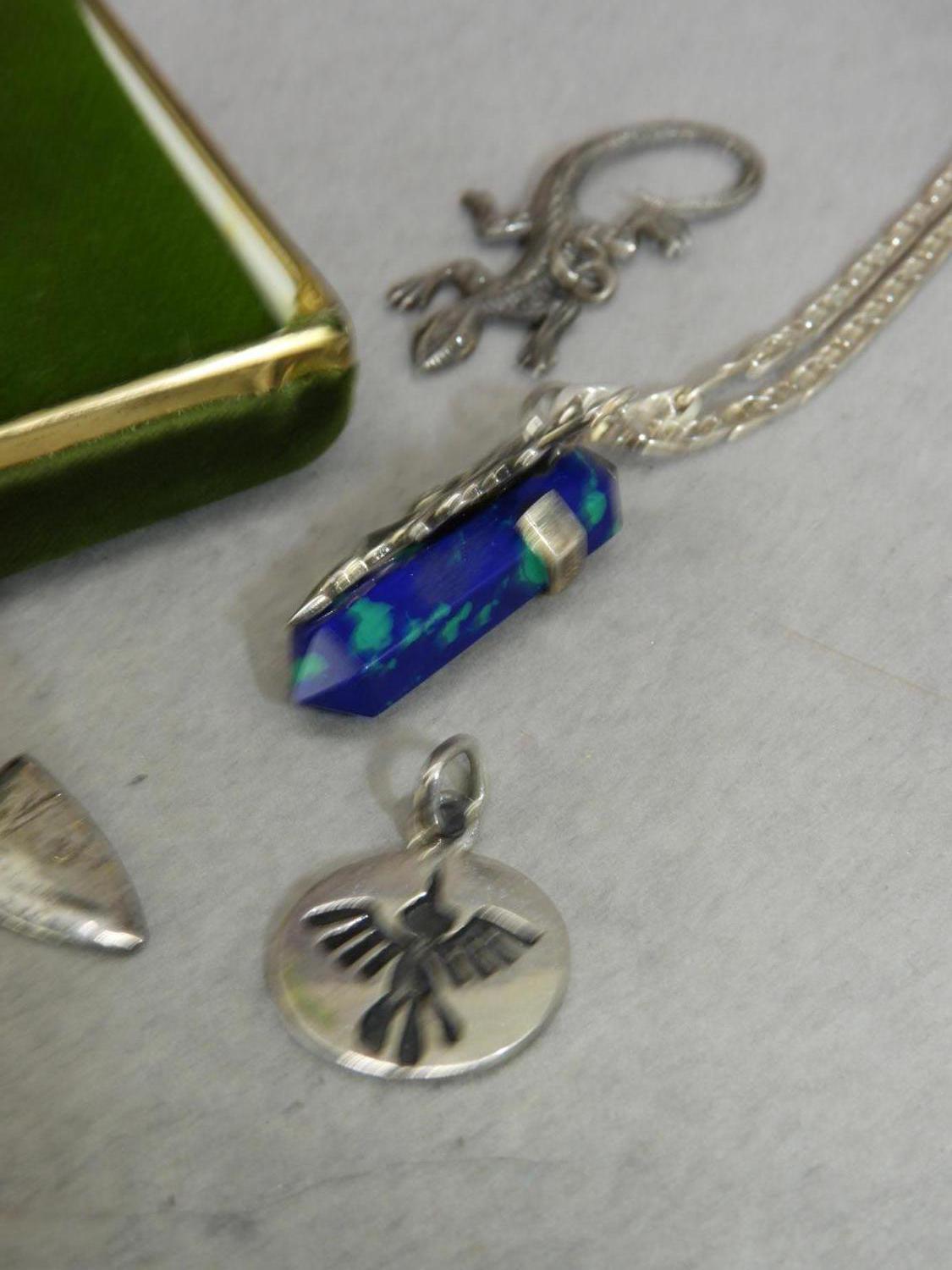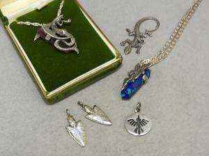 lot of silver jewelry including dragon pendants, arrow pendants etc.