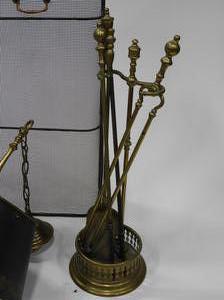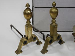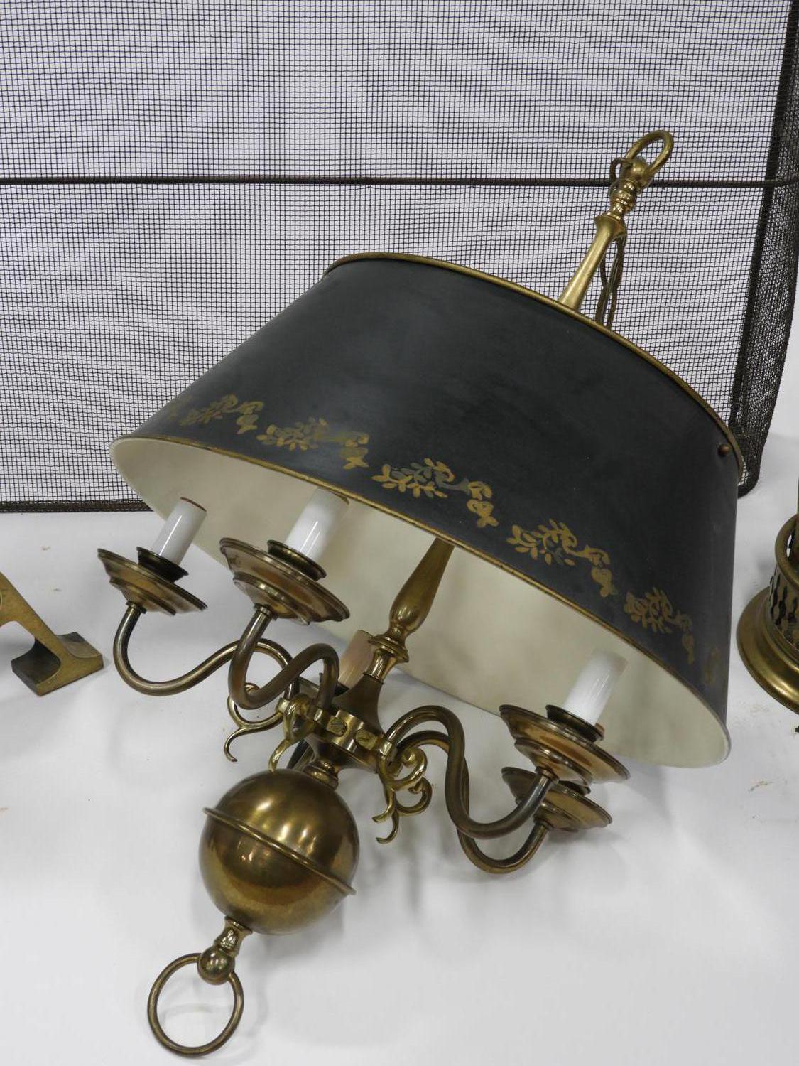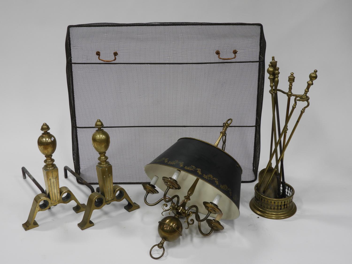 pair of art deco heavy brass andirons, firescreen, fire tools on stand and a brass and tole hanging light fixture