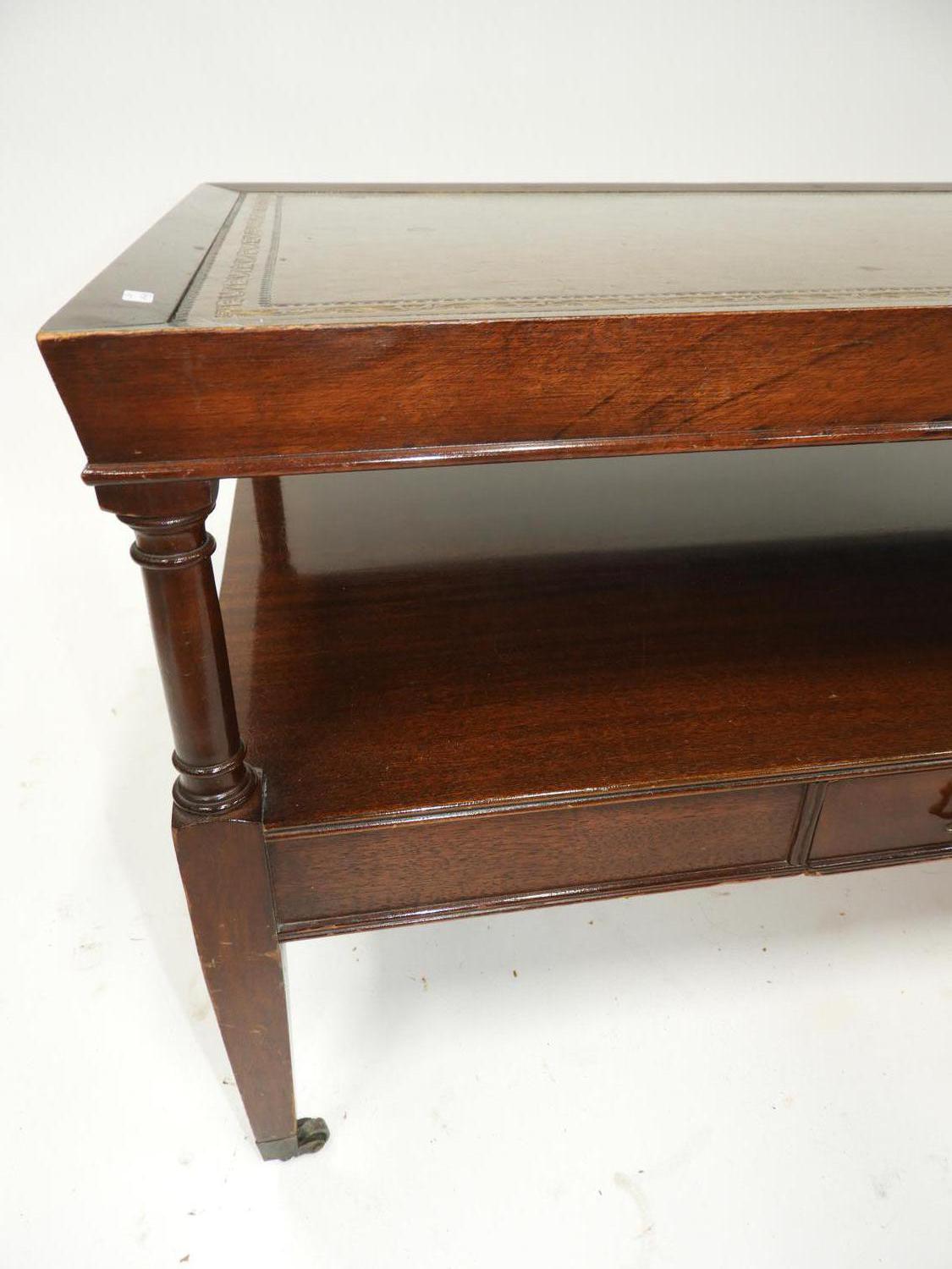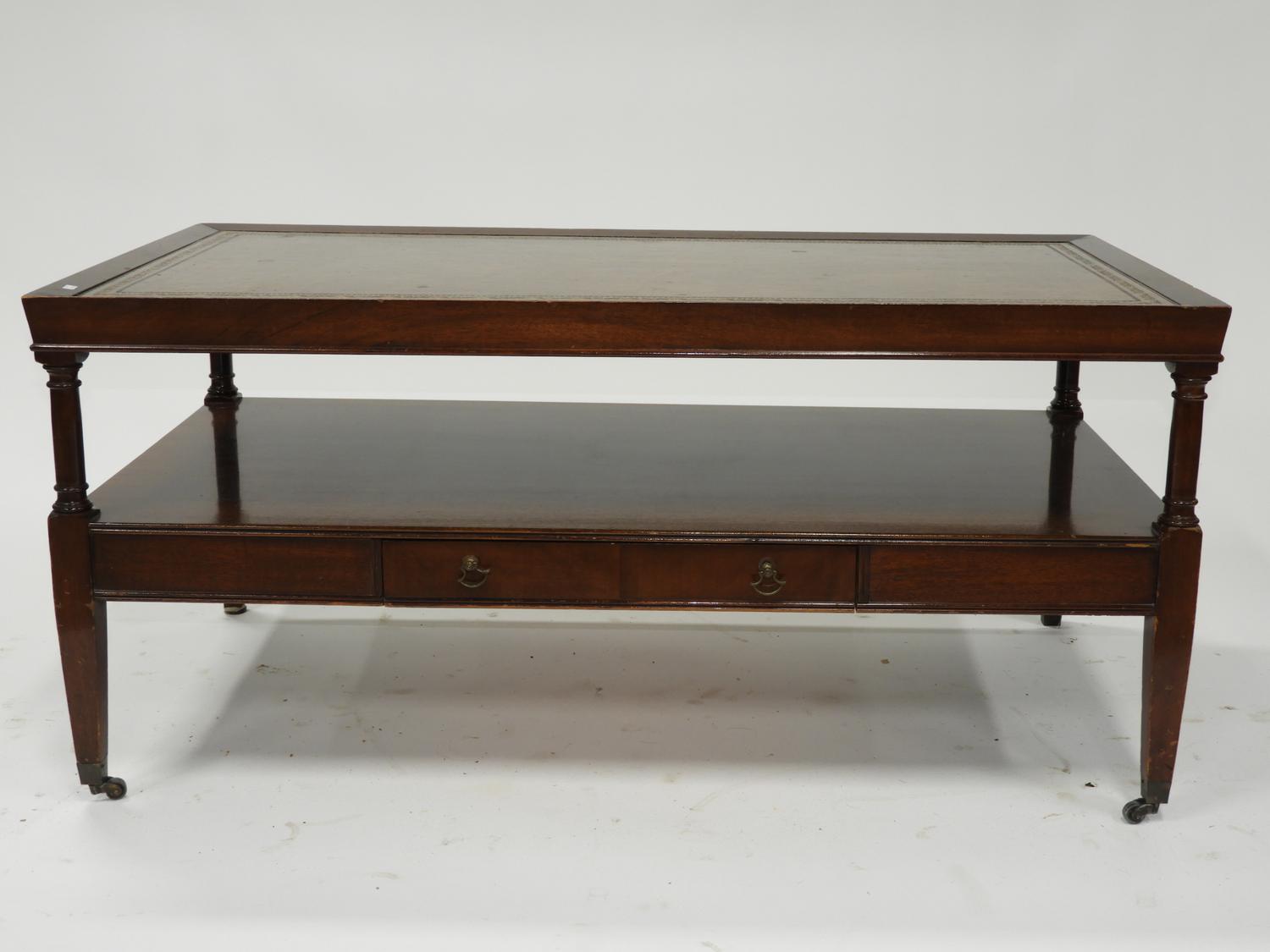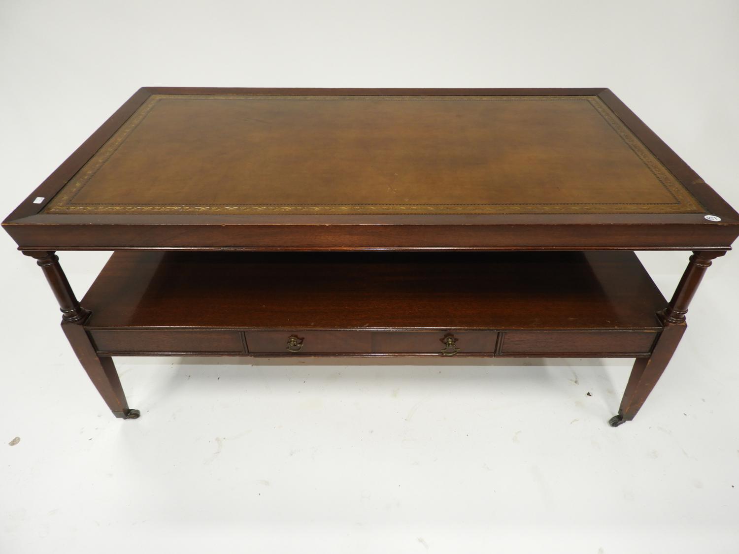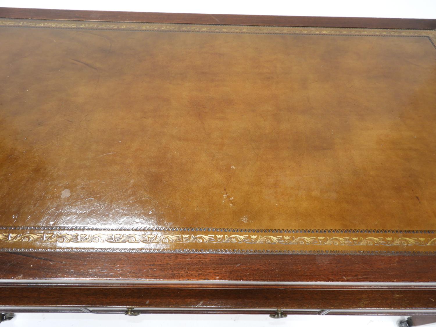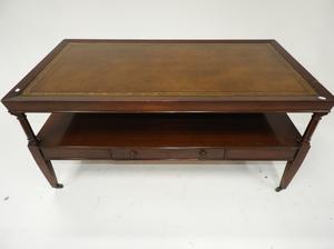 mahogany coffee table with gilt tooled leather inset top, english mid 20th century, 18 1/2" x 39" x 21"