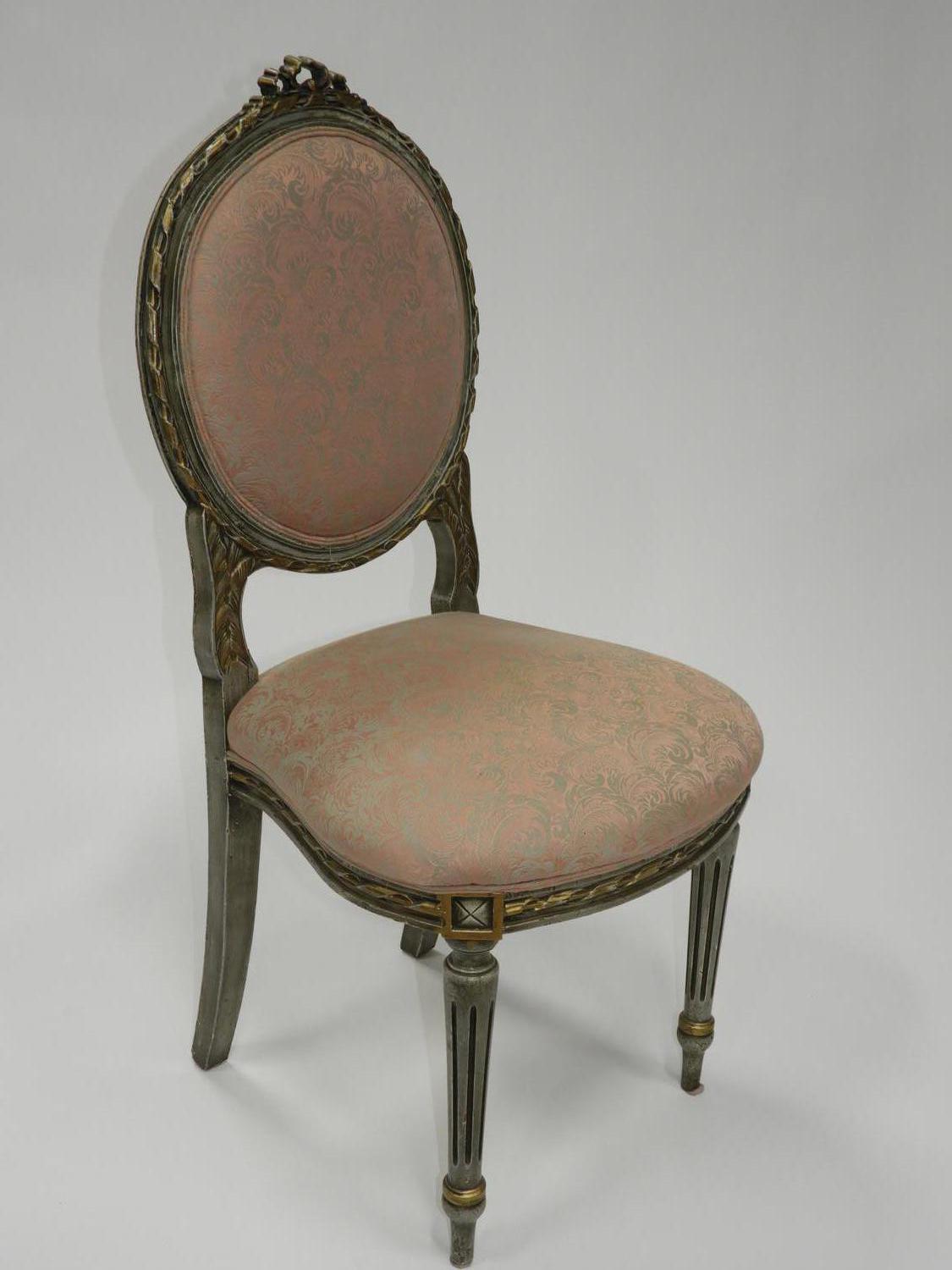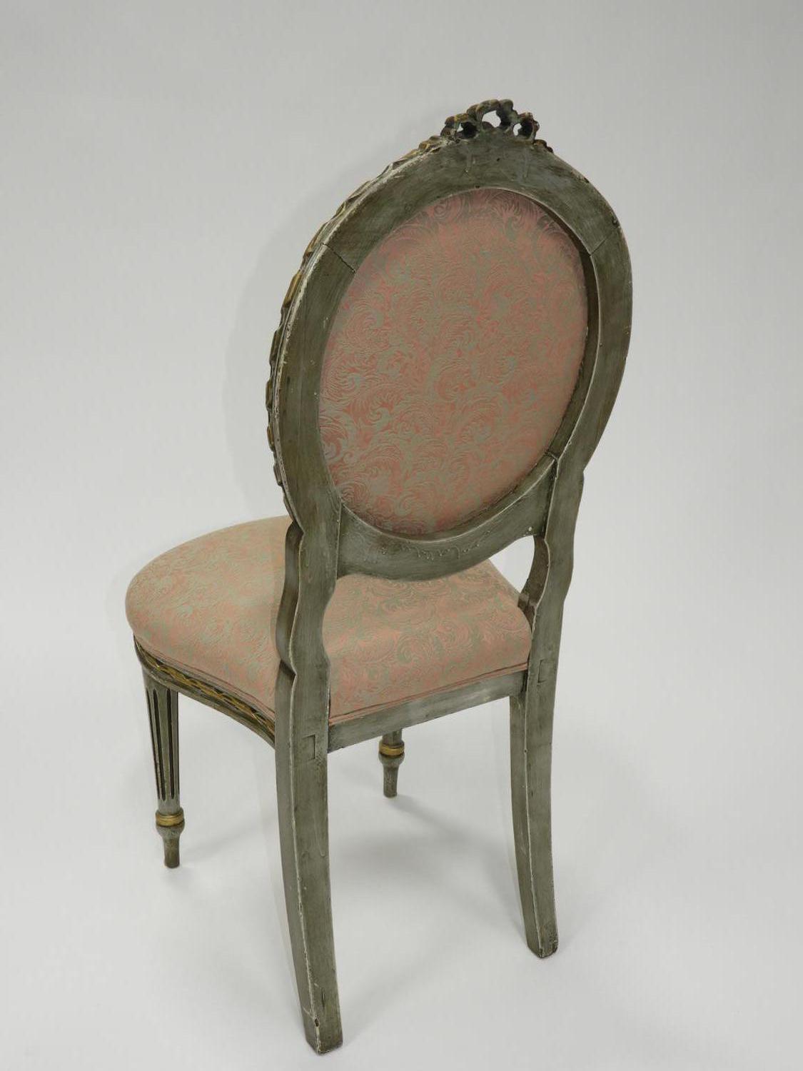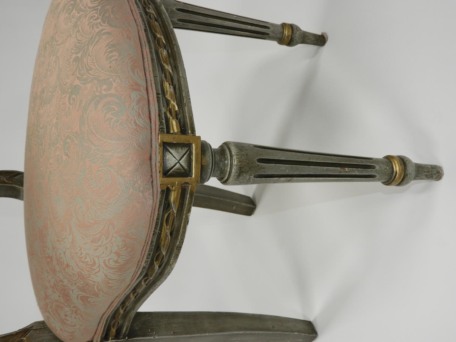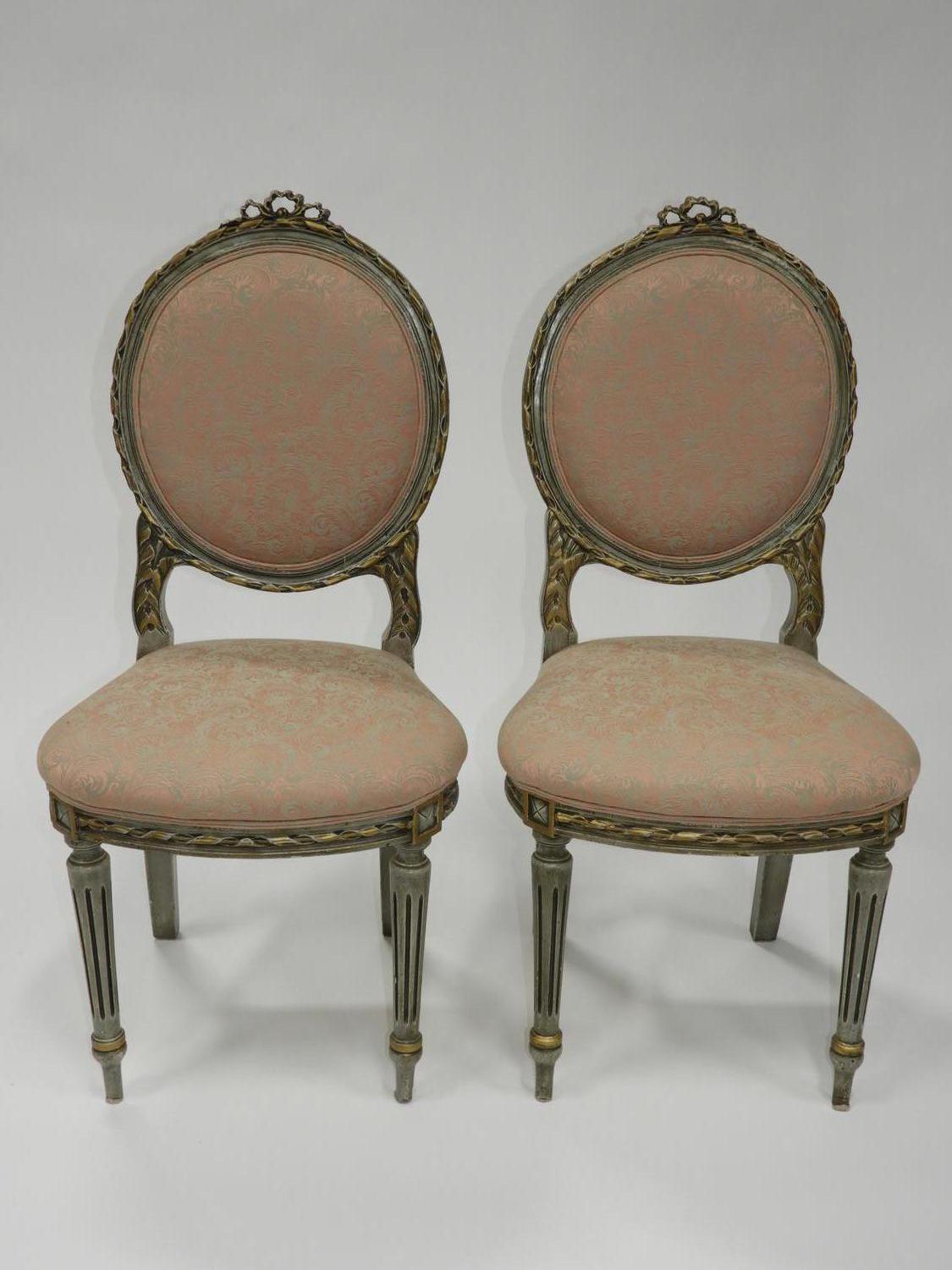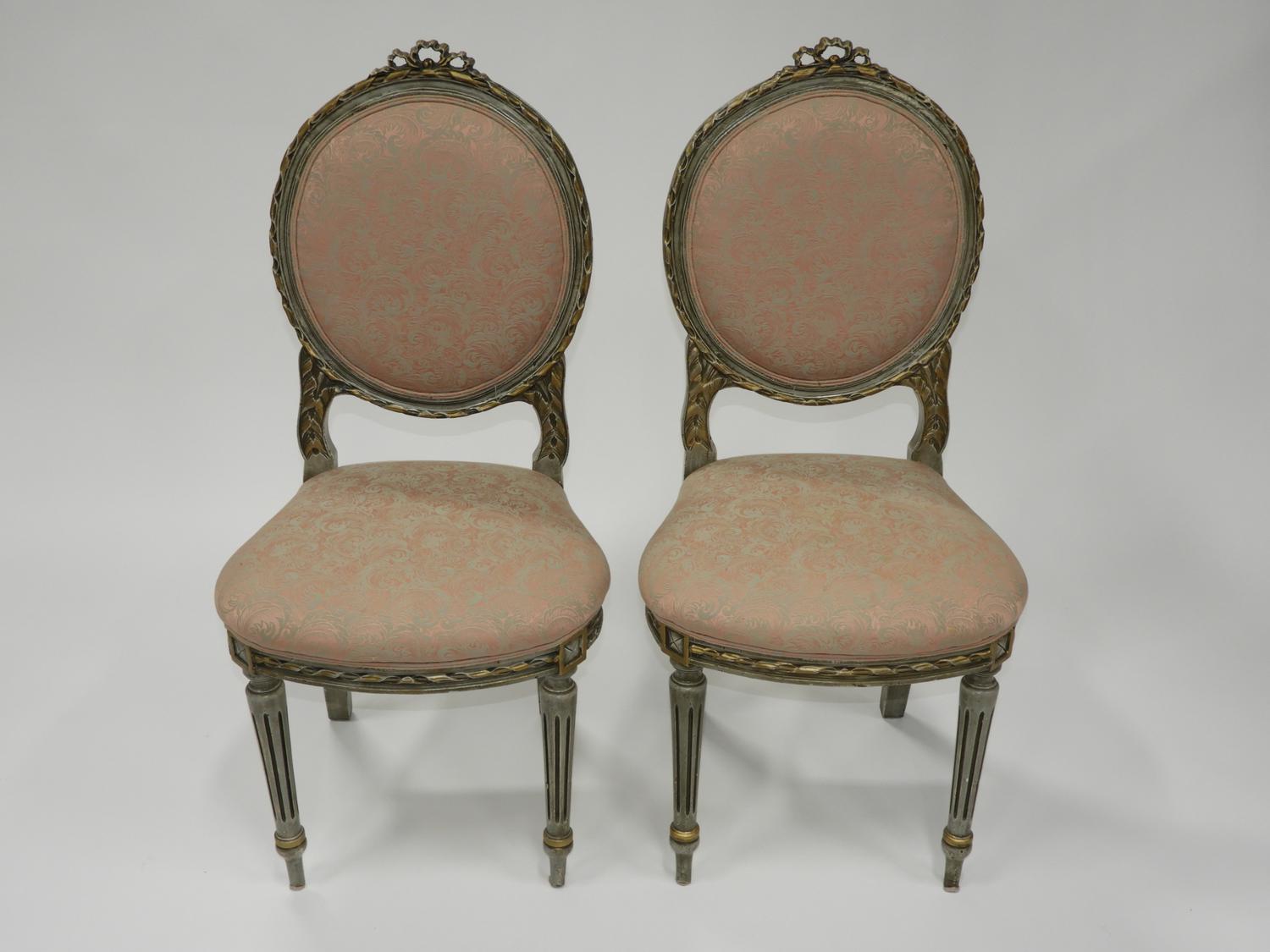 pair of louis xvi style painted upholstered cameo back side chairs, mid 20th century, 38 1/2" x 18" x 18"