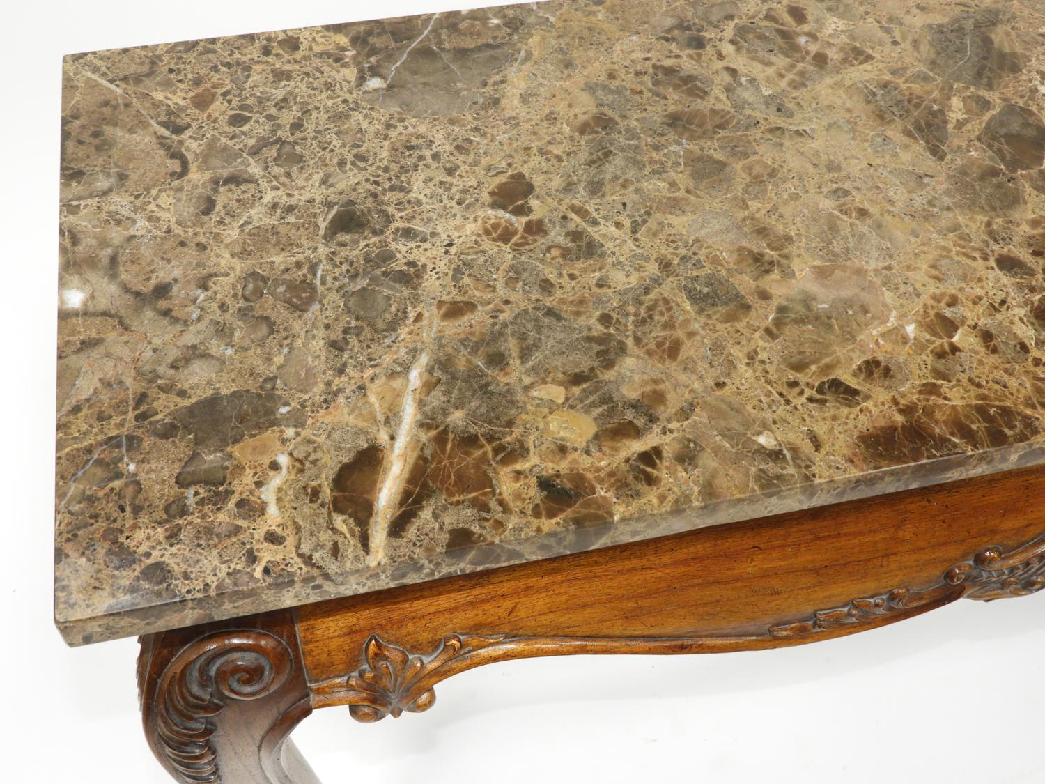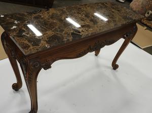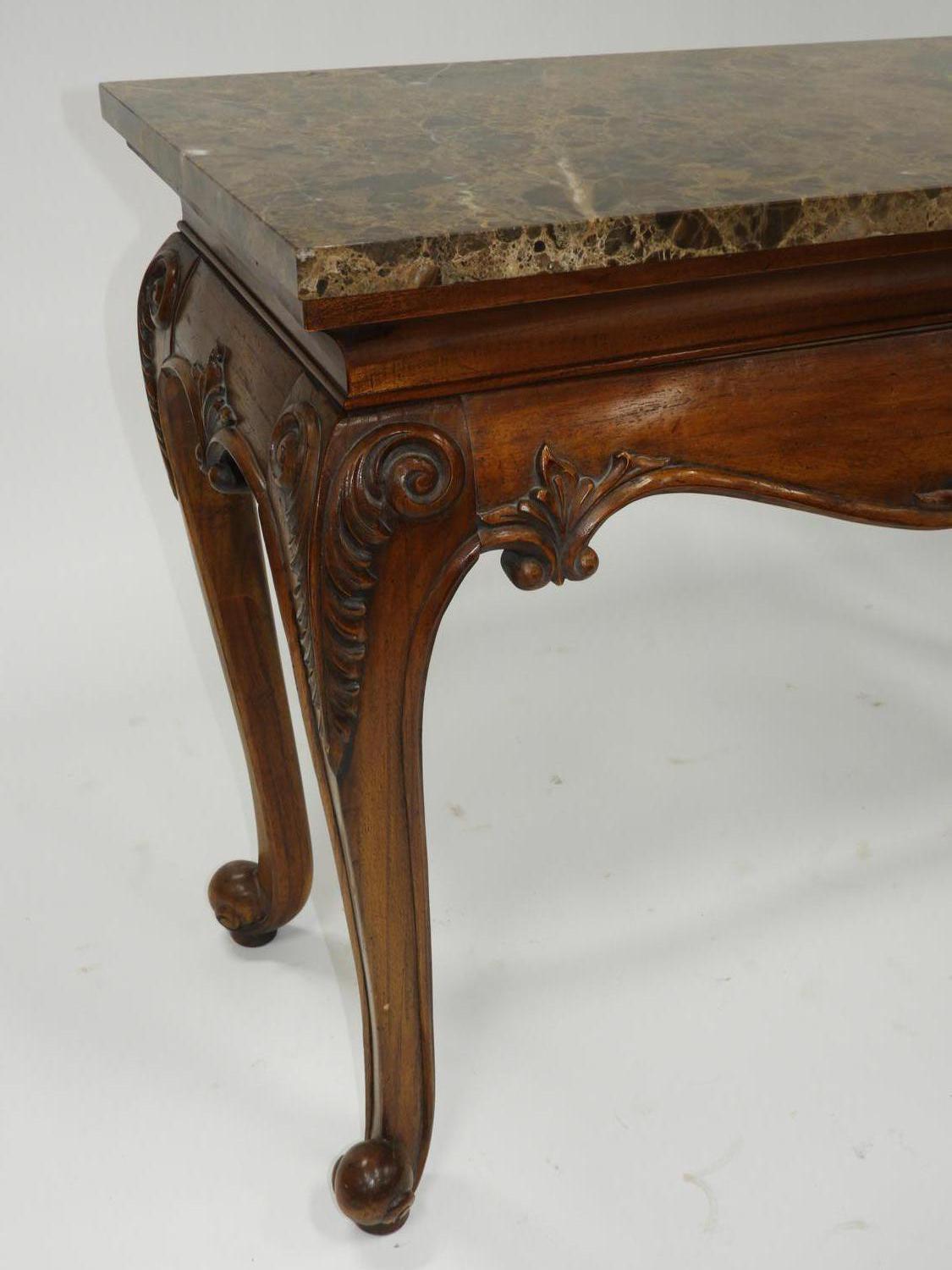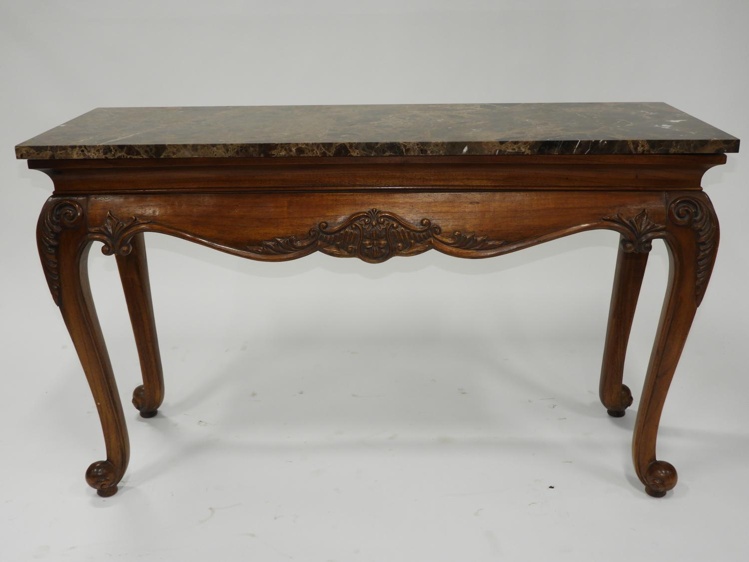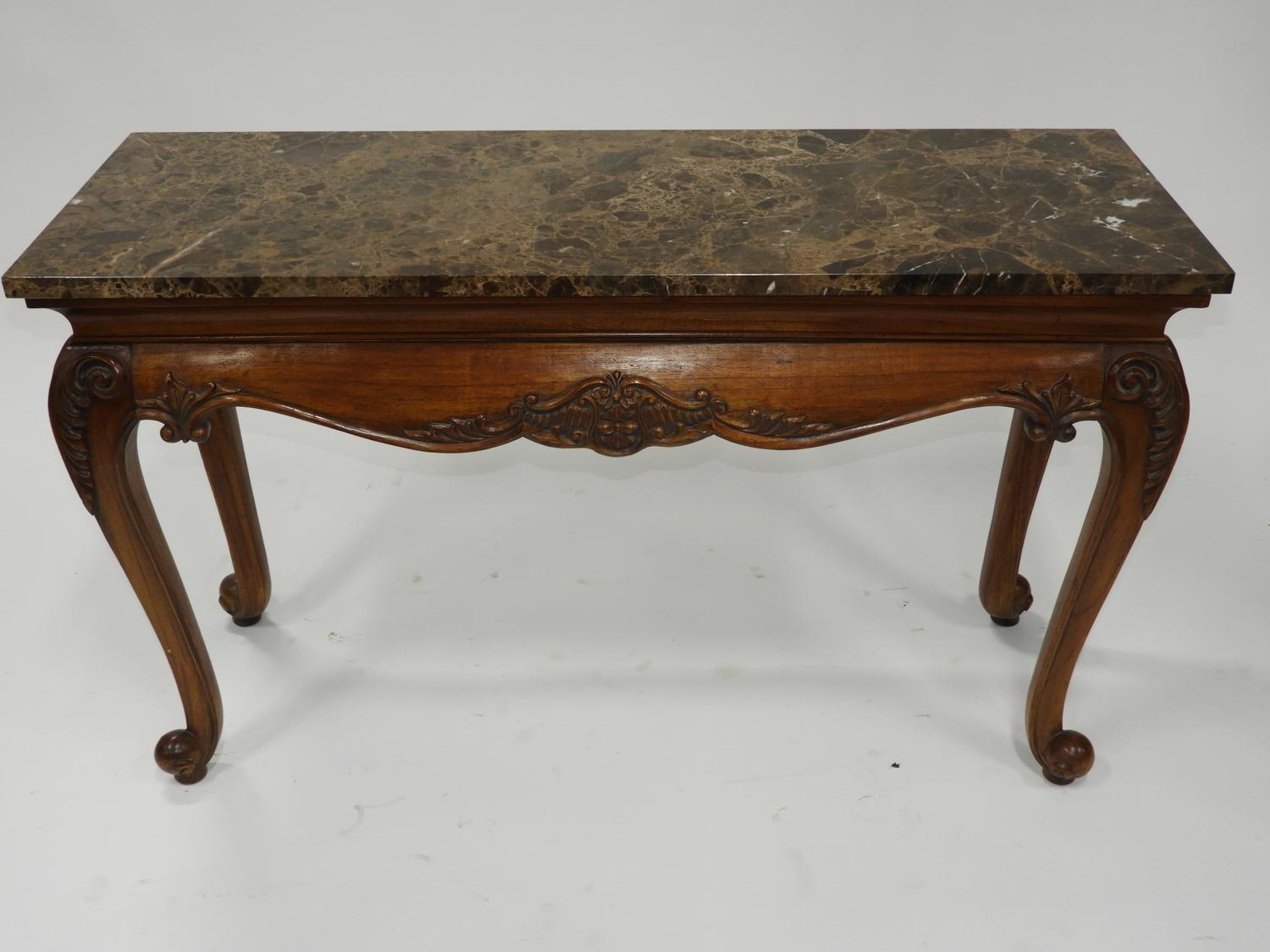 walnut finish marble top console table, late 20th century, 30 1/2" x 50 1/2" x 18 1/2"