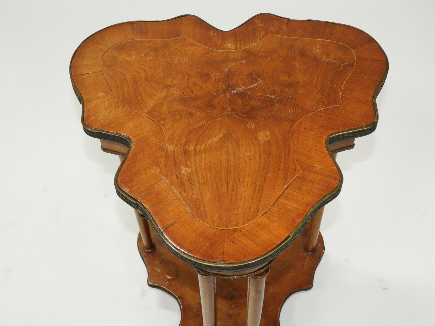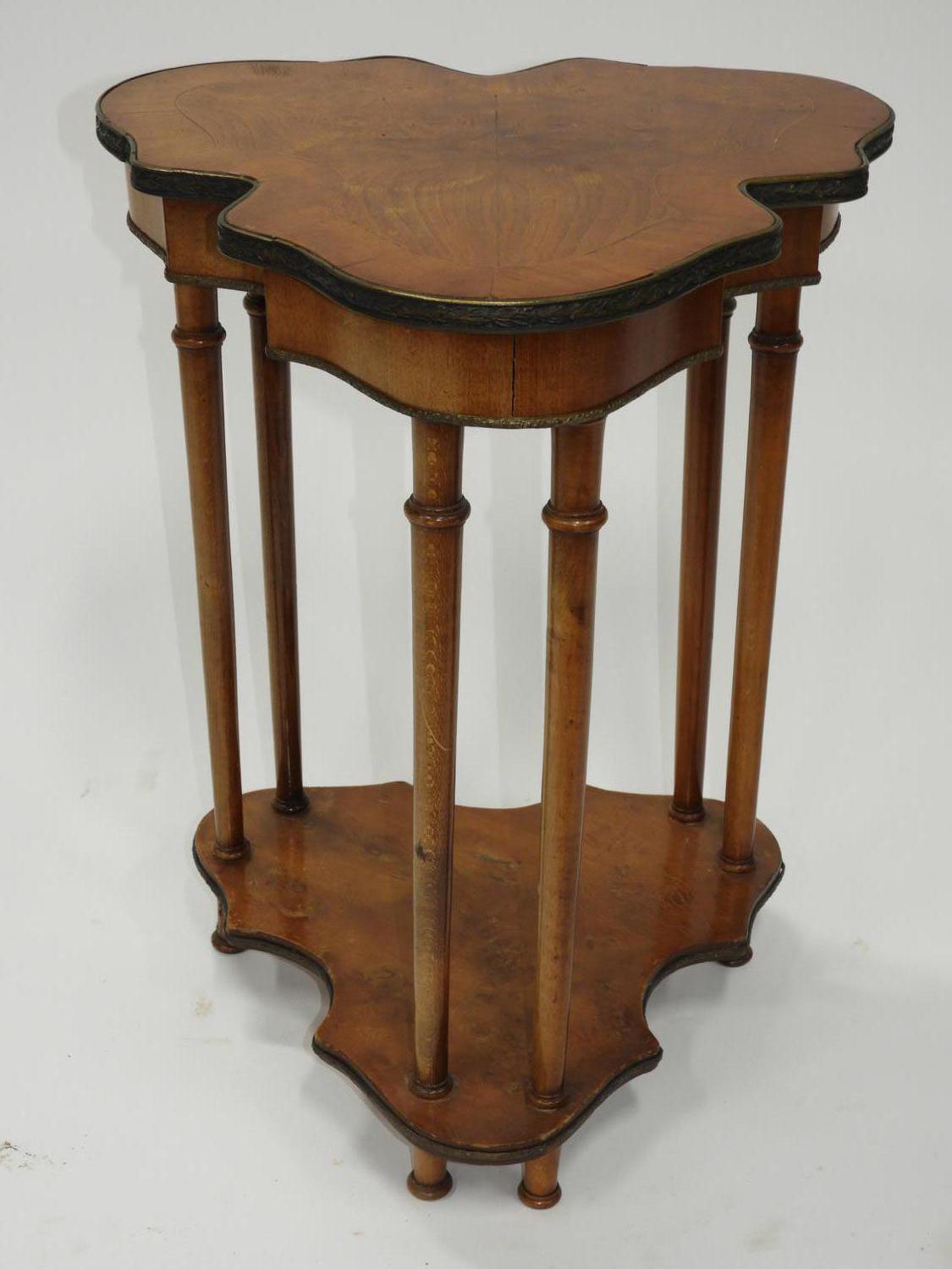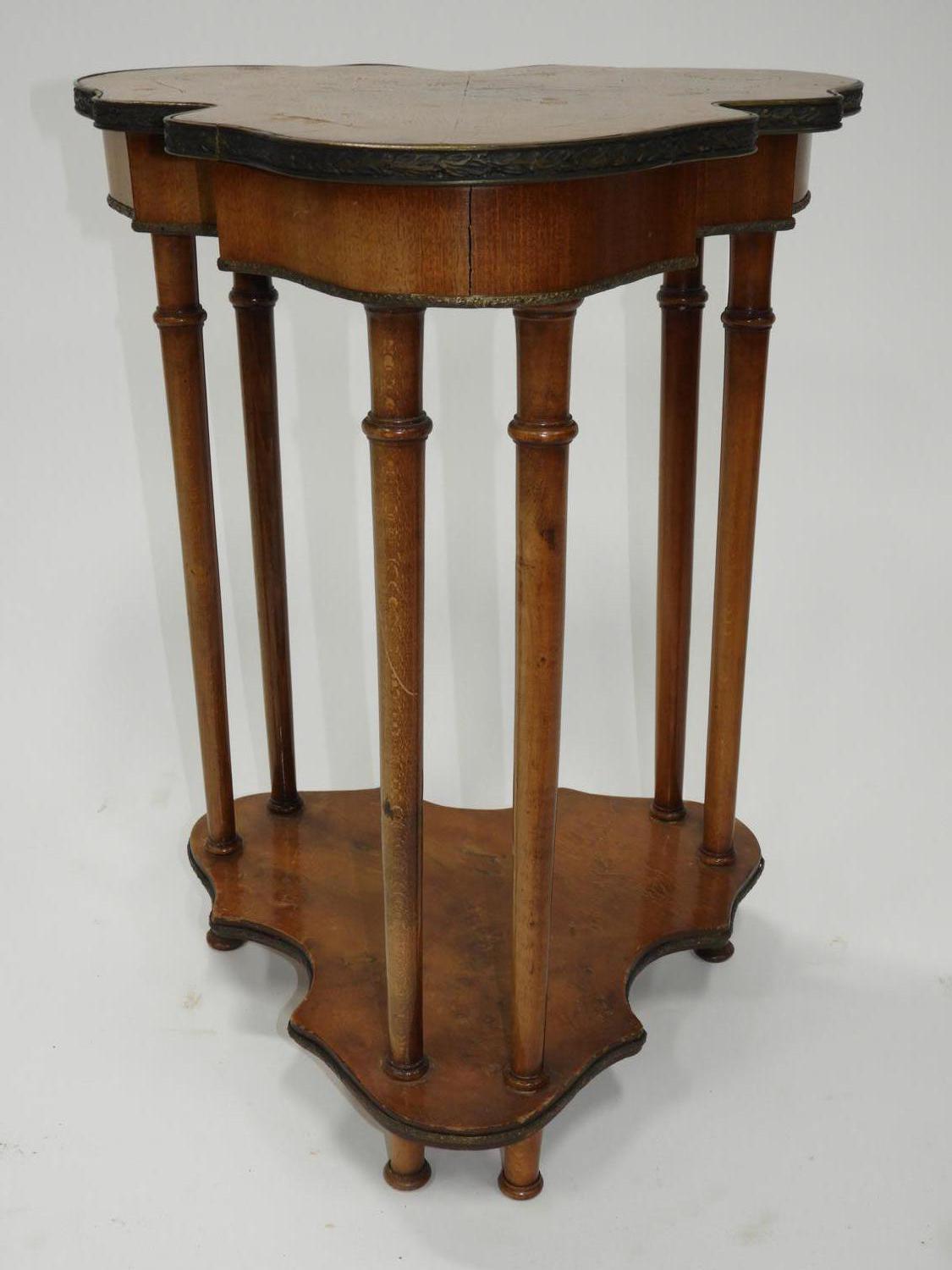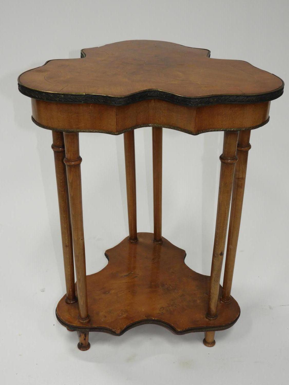 burlwood inlaid clover-form side table with brass trim and slender tapering turned supports, early 20th century, 24 1/2" x 19"