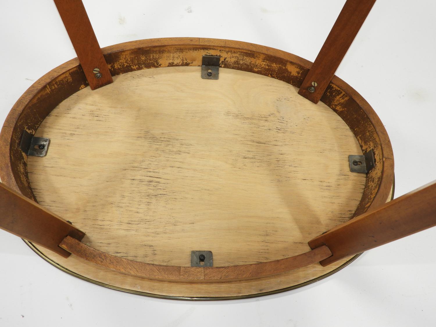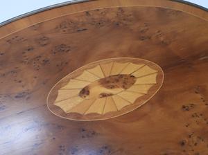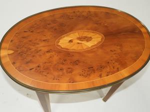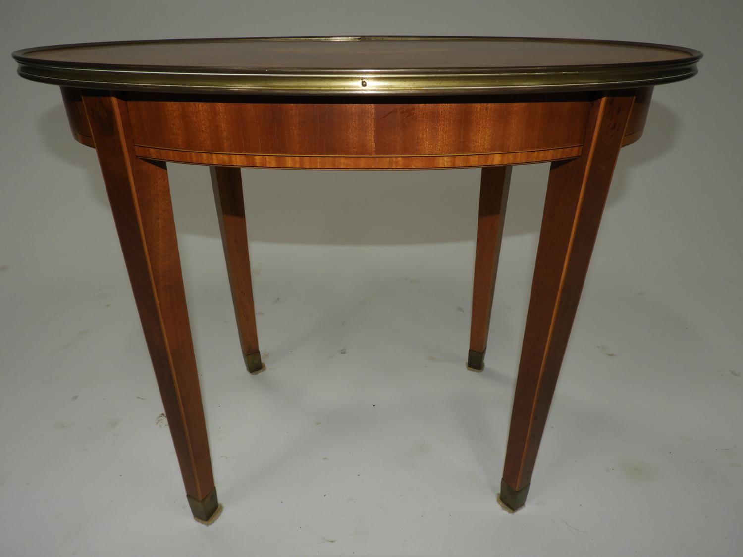 sheraton style yew, mahogany and rosewood inlaid side table with brass mounts, mid 20th century, 18" x 23" x 15 3/4"