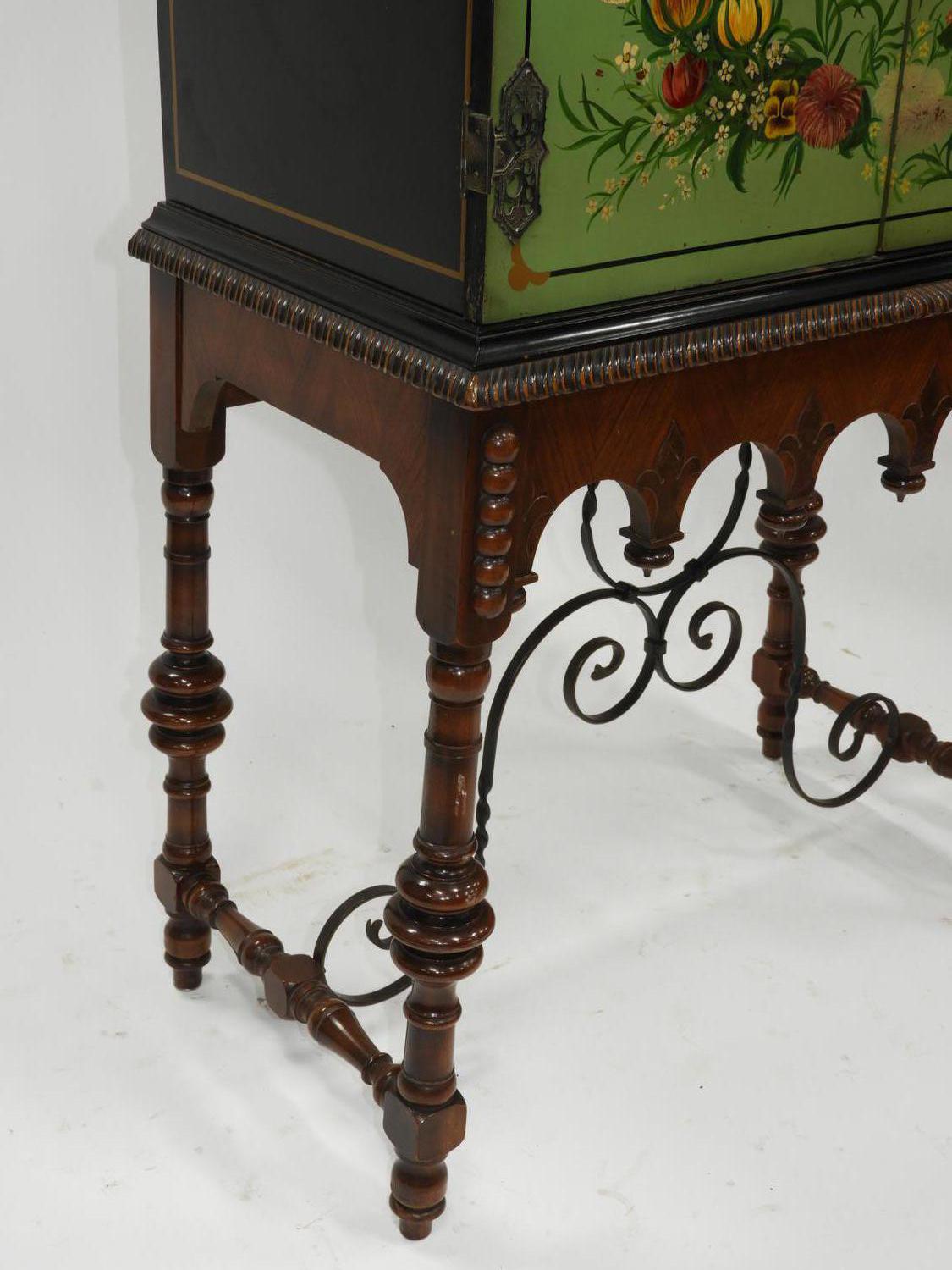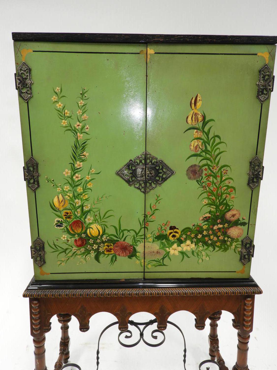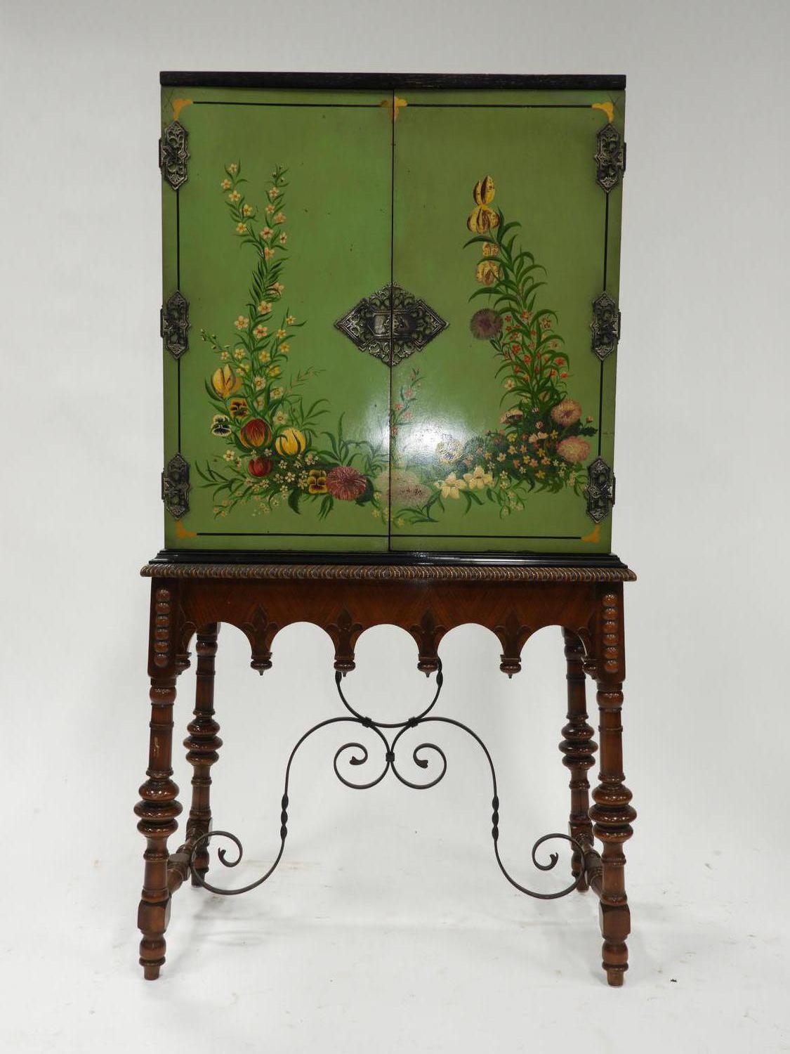 paint decorated walnut inlay and wrought iron secretaire chest on stand, c.1920, 57" x 31" x 17"