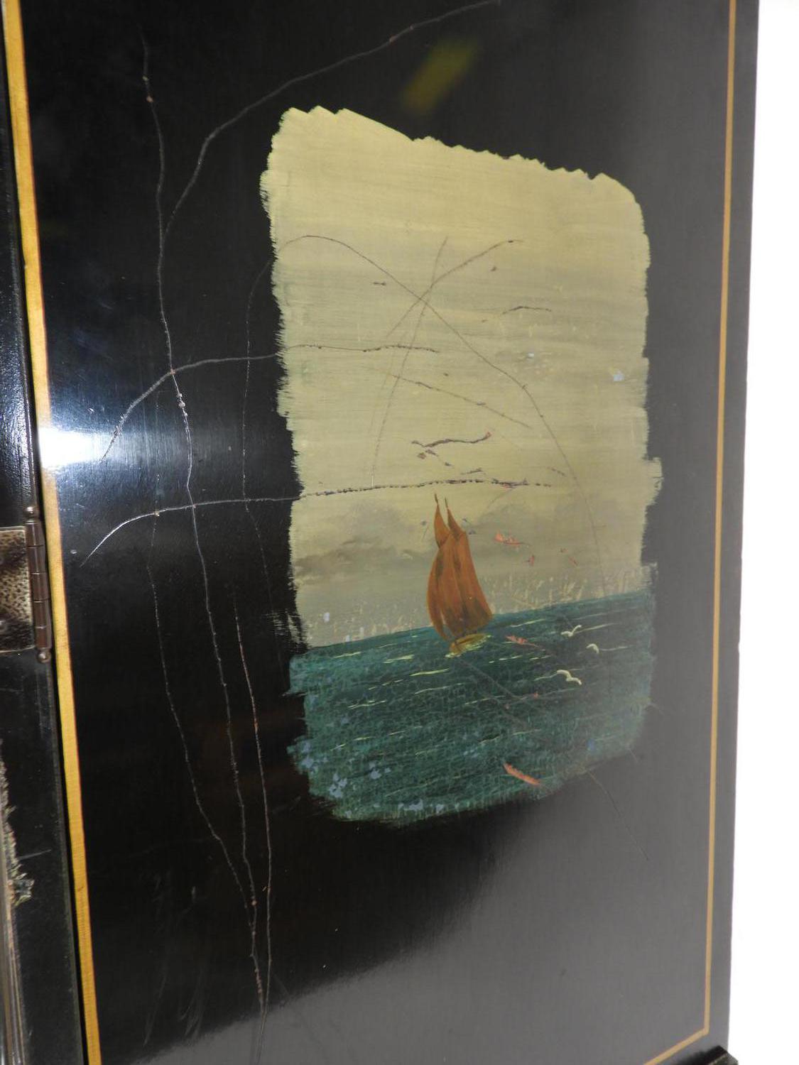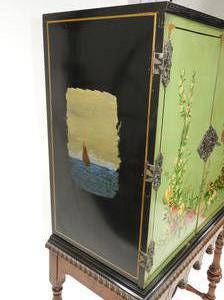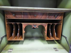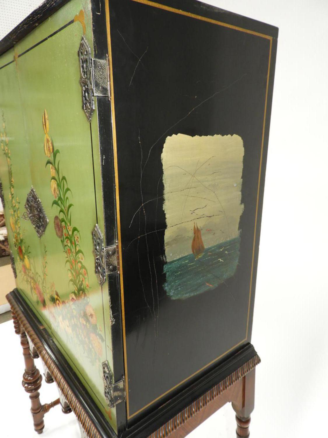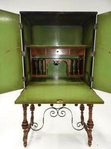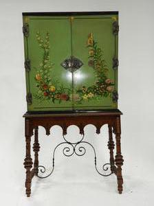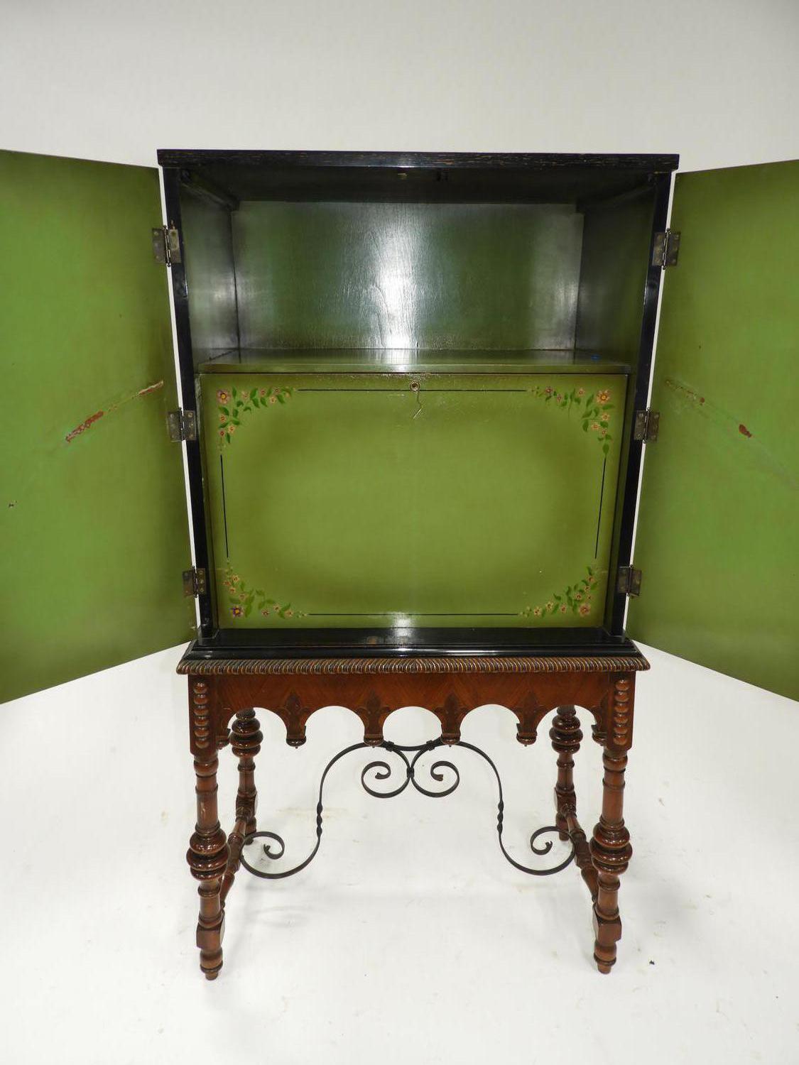 paint decorated walnut inlay and wrought iron secretaire chest on stand, c.1920, 57" x 31" x 17"