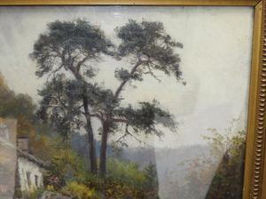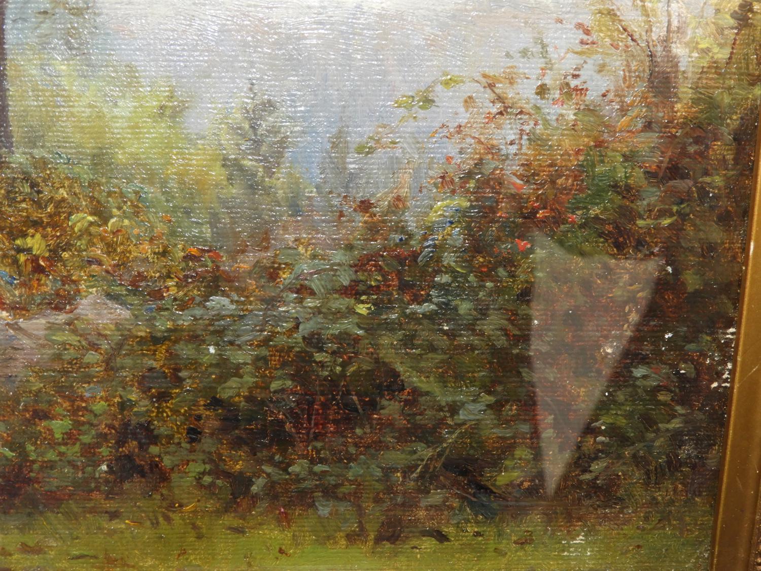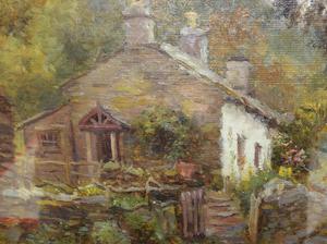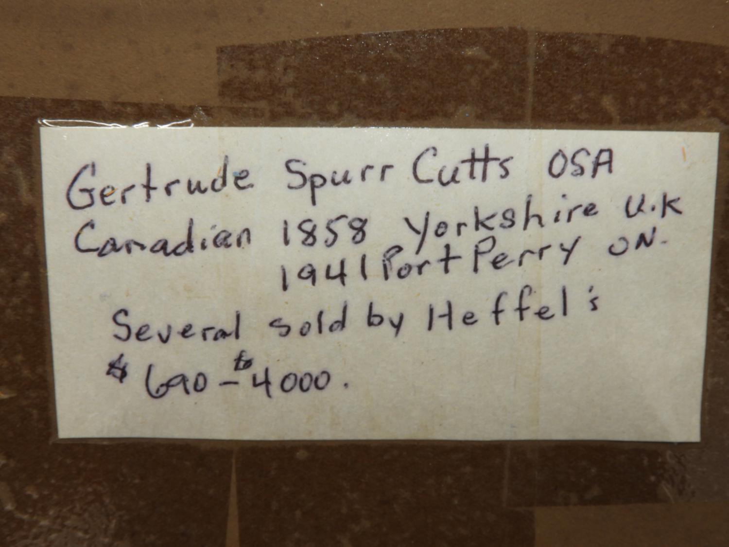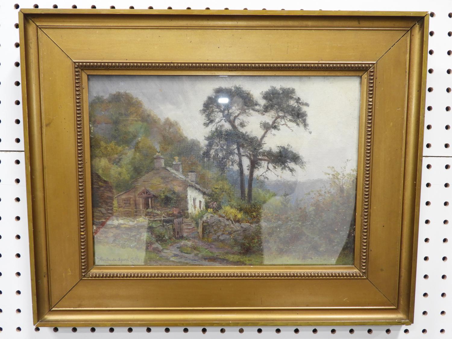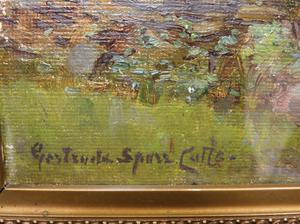 gertrude spurr cutts (1858-1941), oil on board, 10" x 14", "cottage with garden"