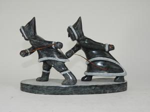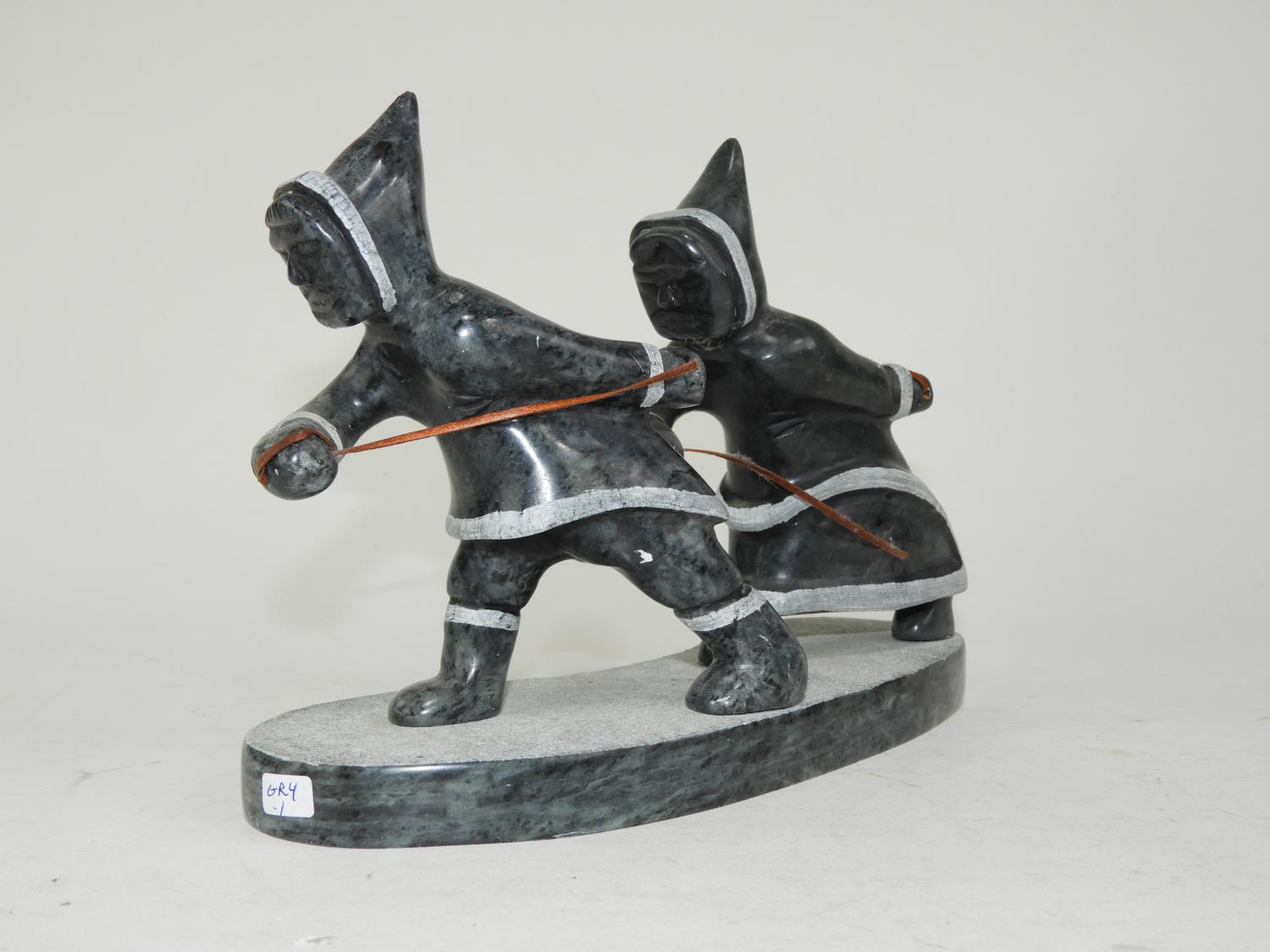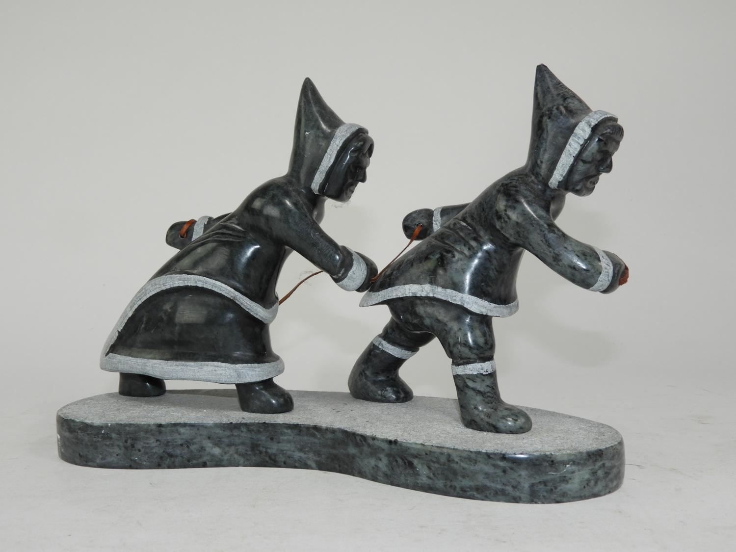 inuit carved soapstone of two figures in blizzard conditions, 7" x 10" x 4"