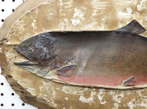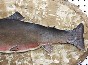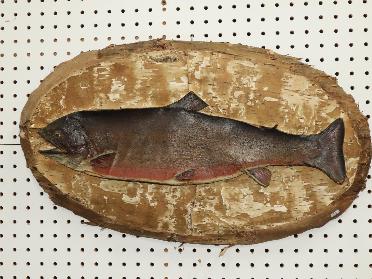 taxidery mounted 2d trout with hand colour on birch bark plaque, 24" x 14", early 20th century