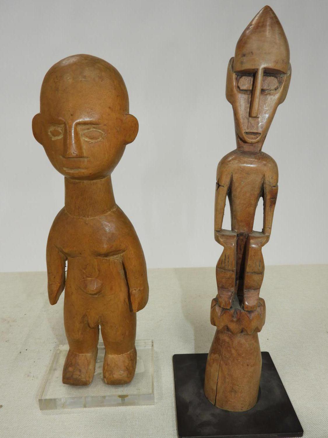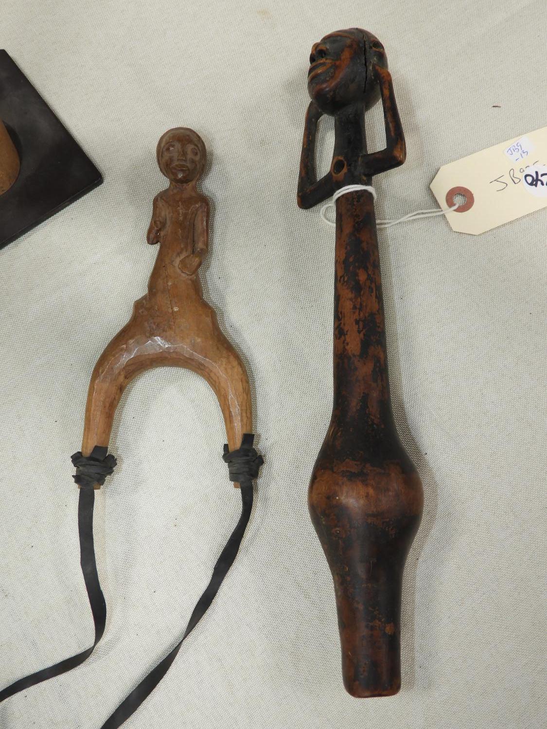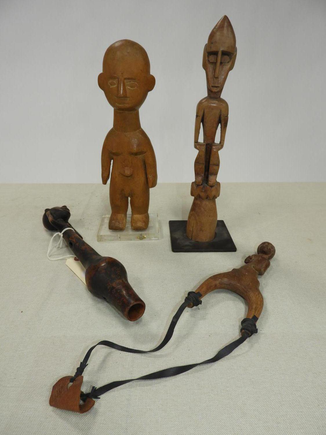 african figural flute, sling shot and two figures, length 12 1/4" and smaller