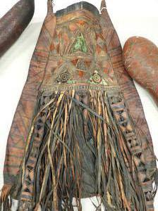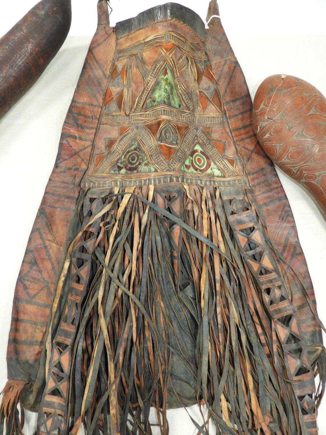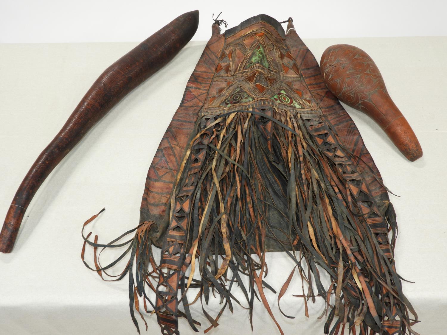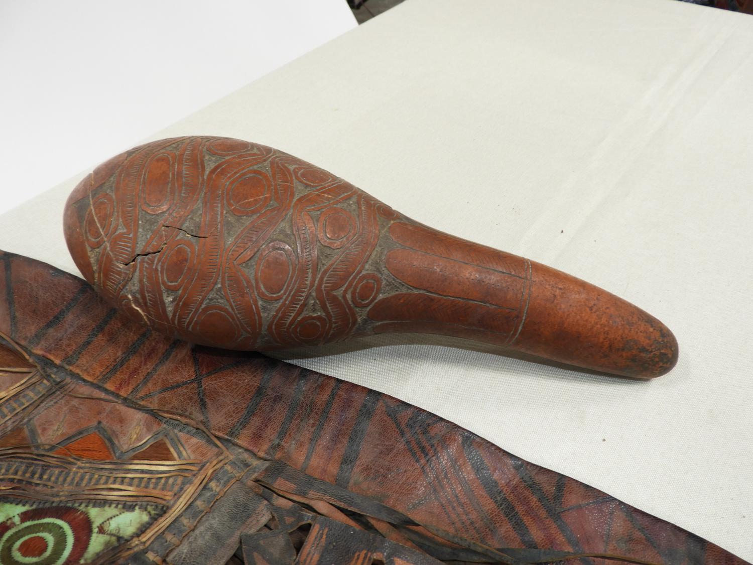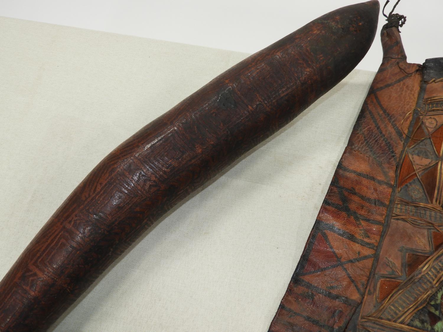 southern/eastern african leather bag together with two carved gourds, 20th century, length 36"