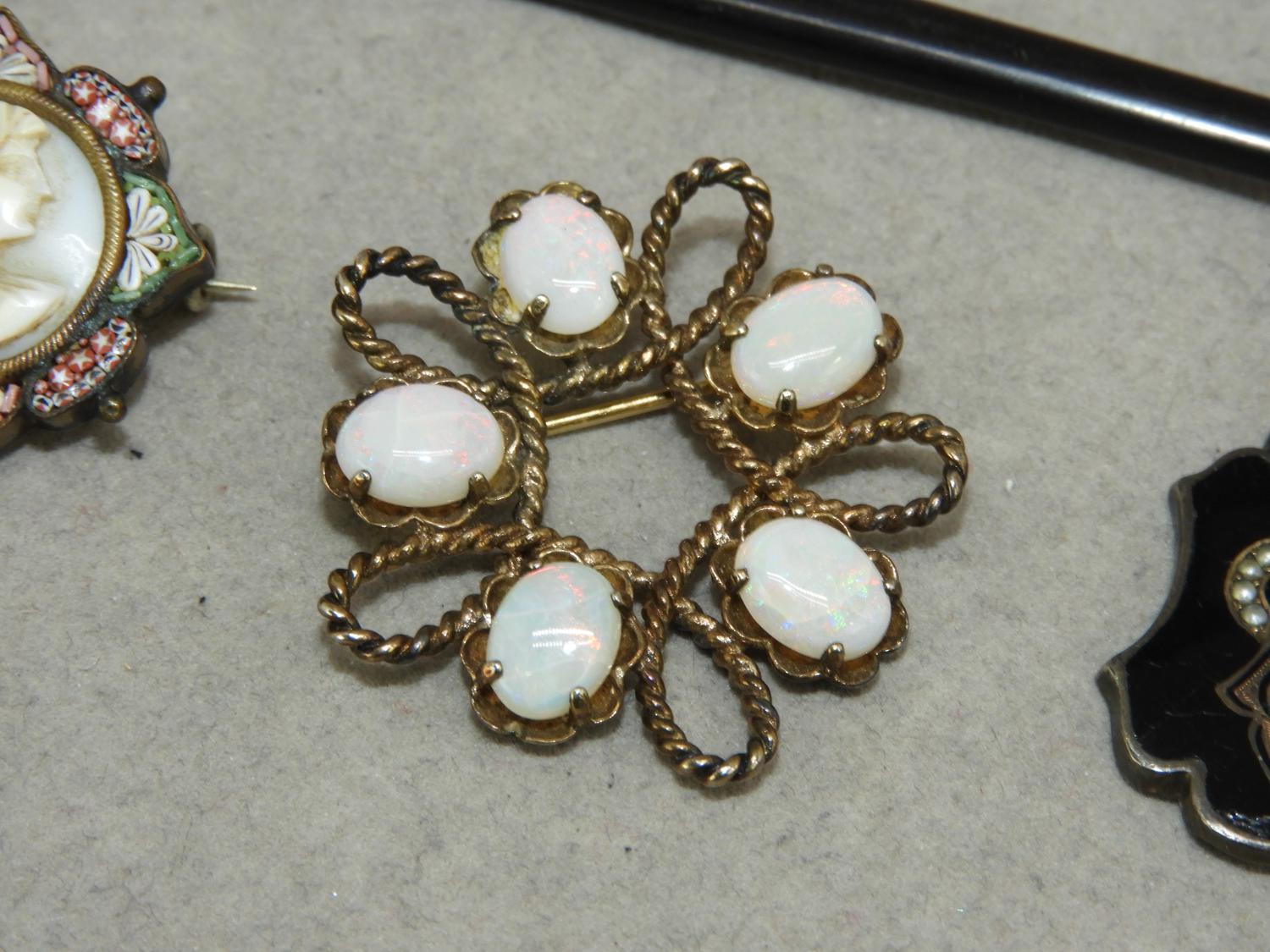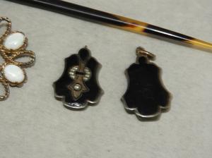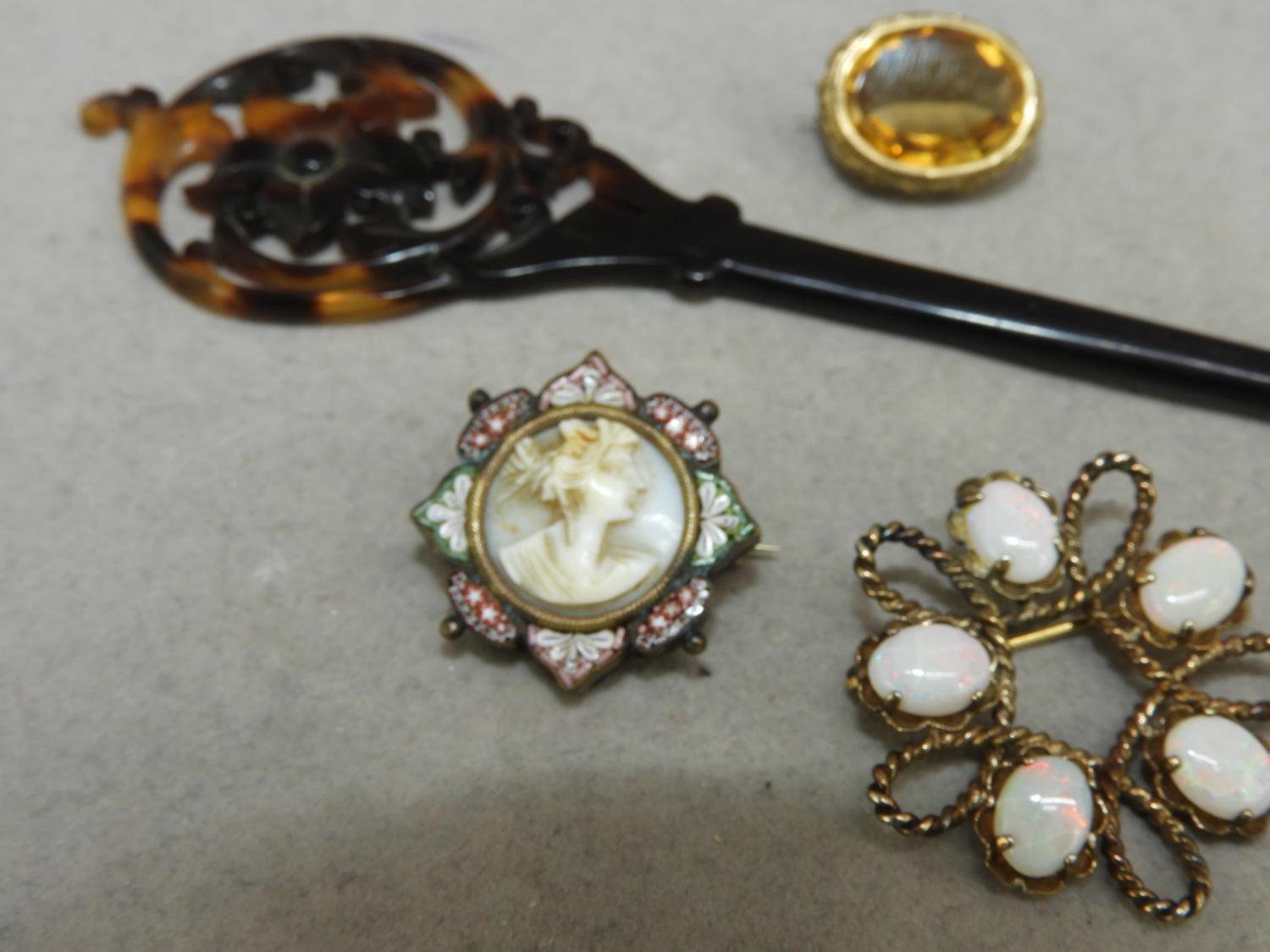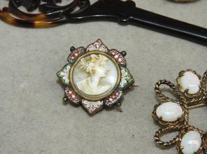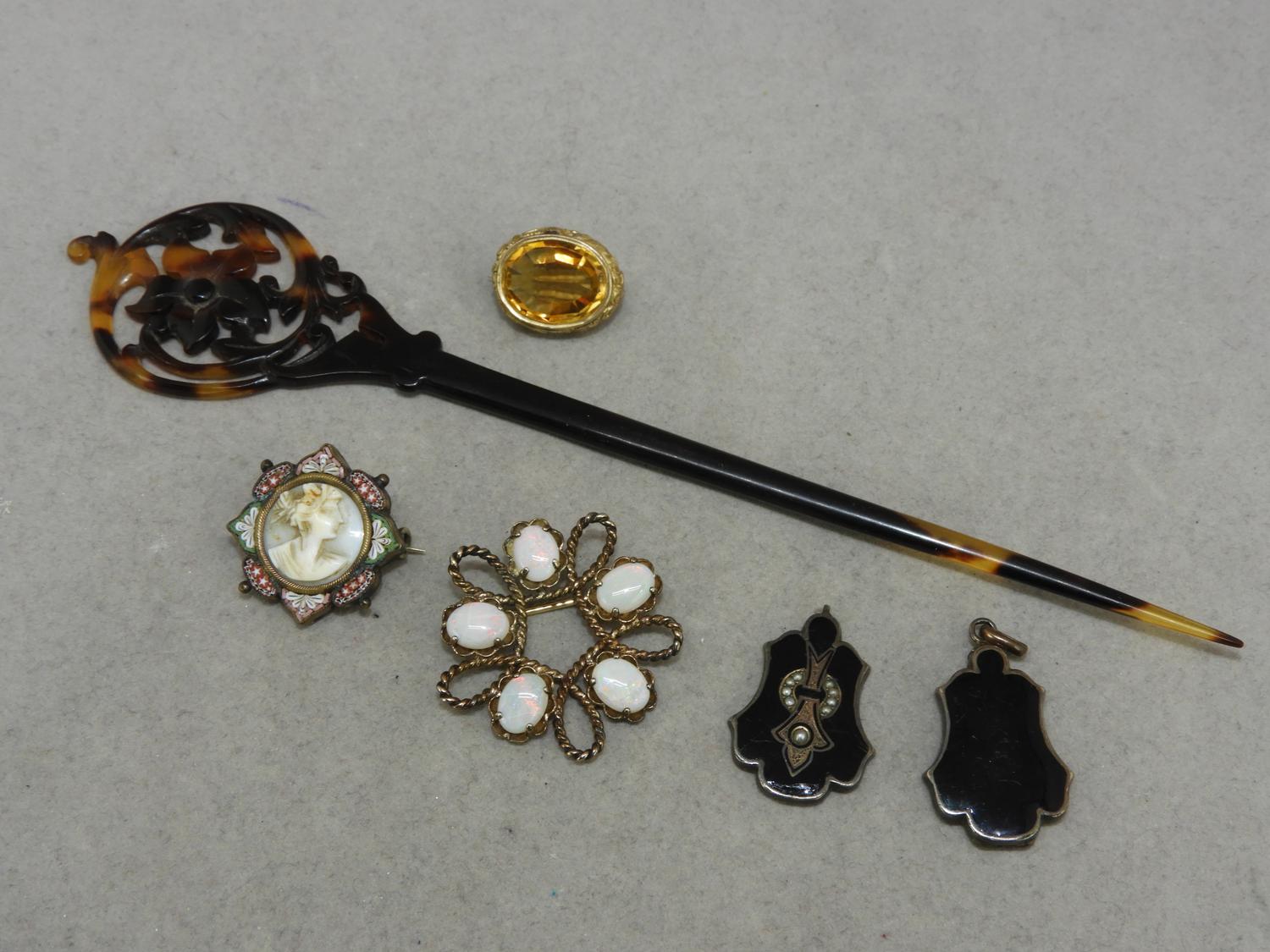 victorian cameo micromosaic pin, tortoise hair pin, enamel locket(as is), paste pin