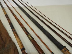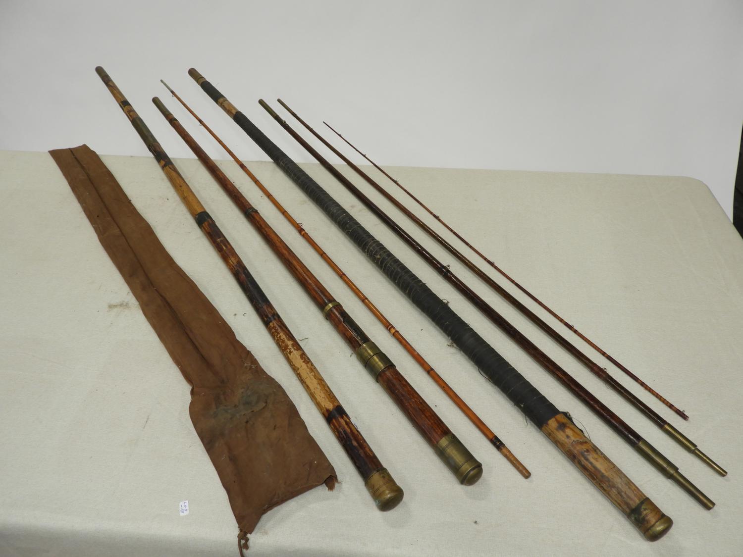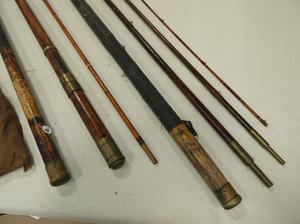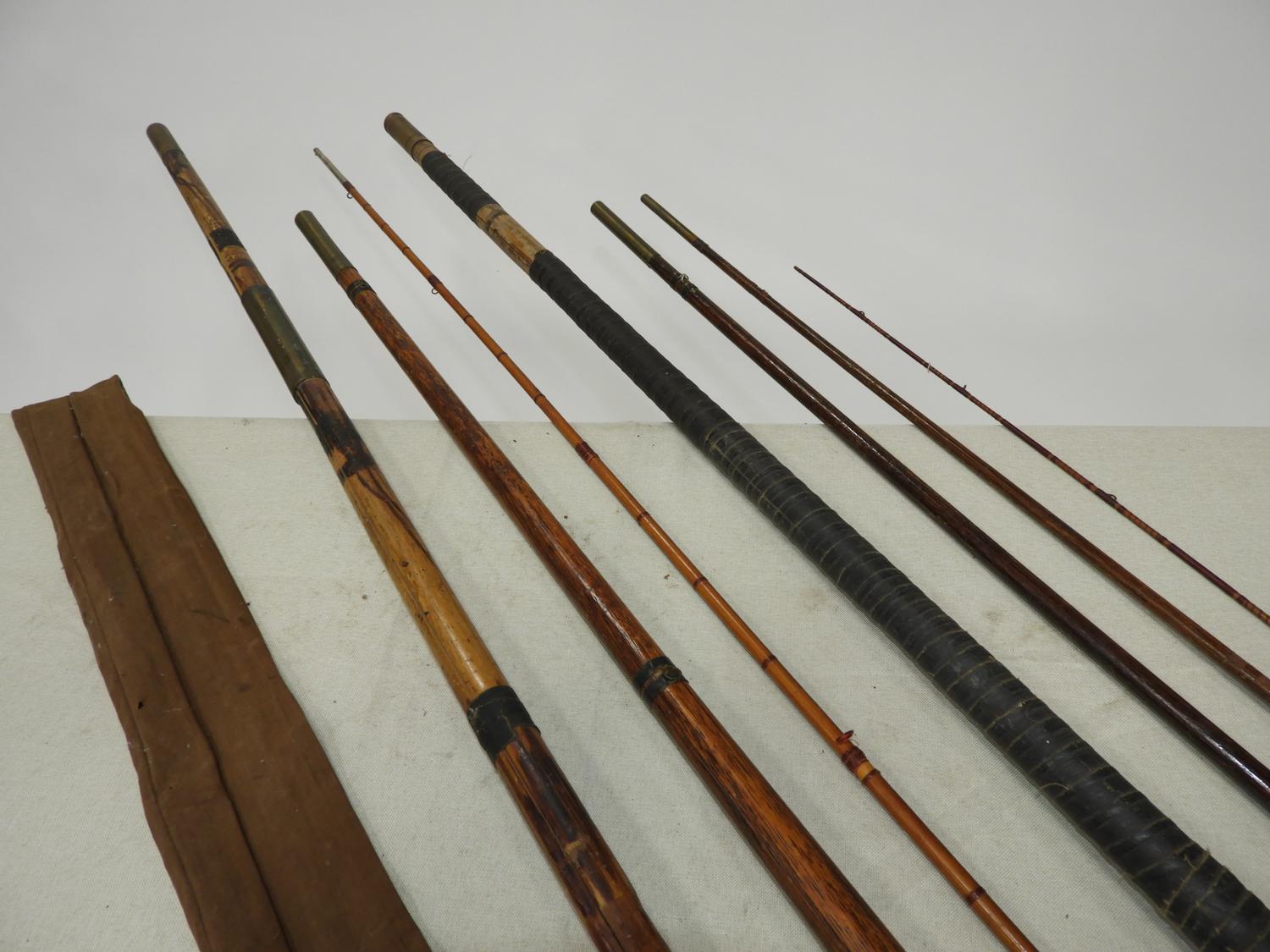 three vintage/antique bamboo fishing poles, incomplete with one case