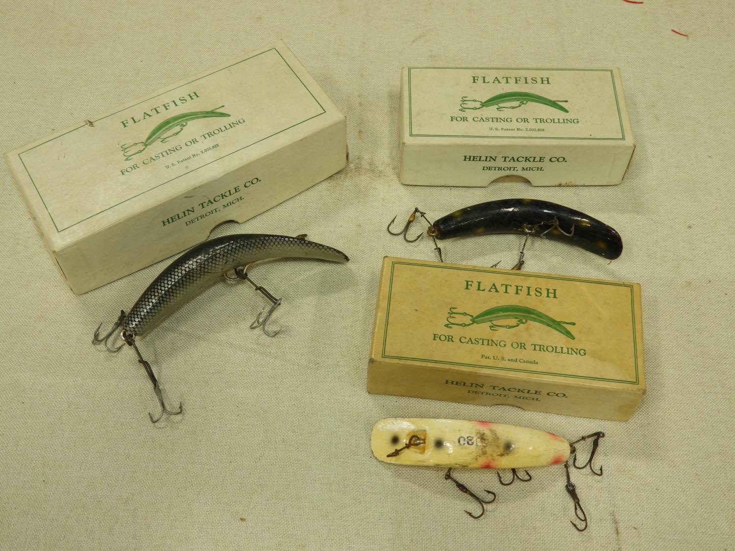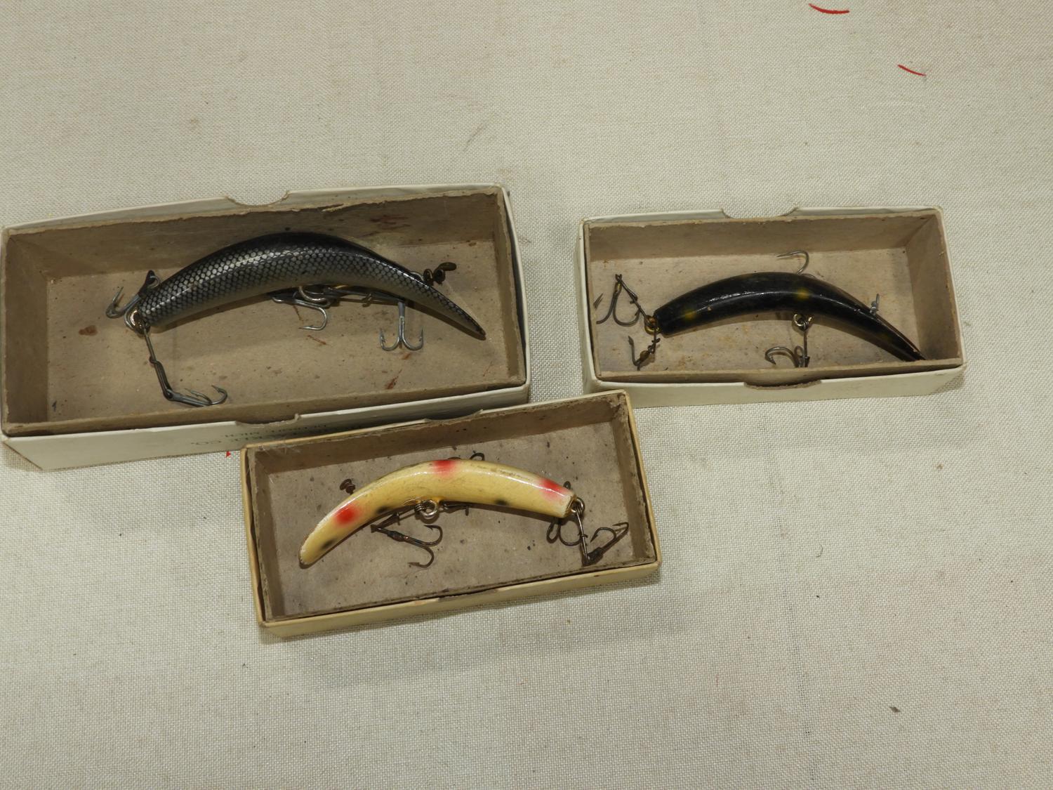 three vintage flat fish lures with boxes