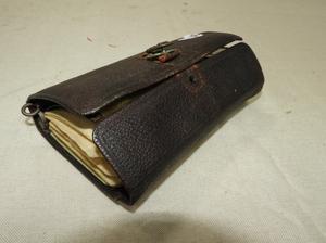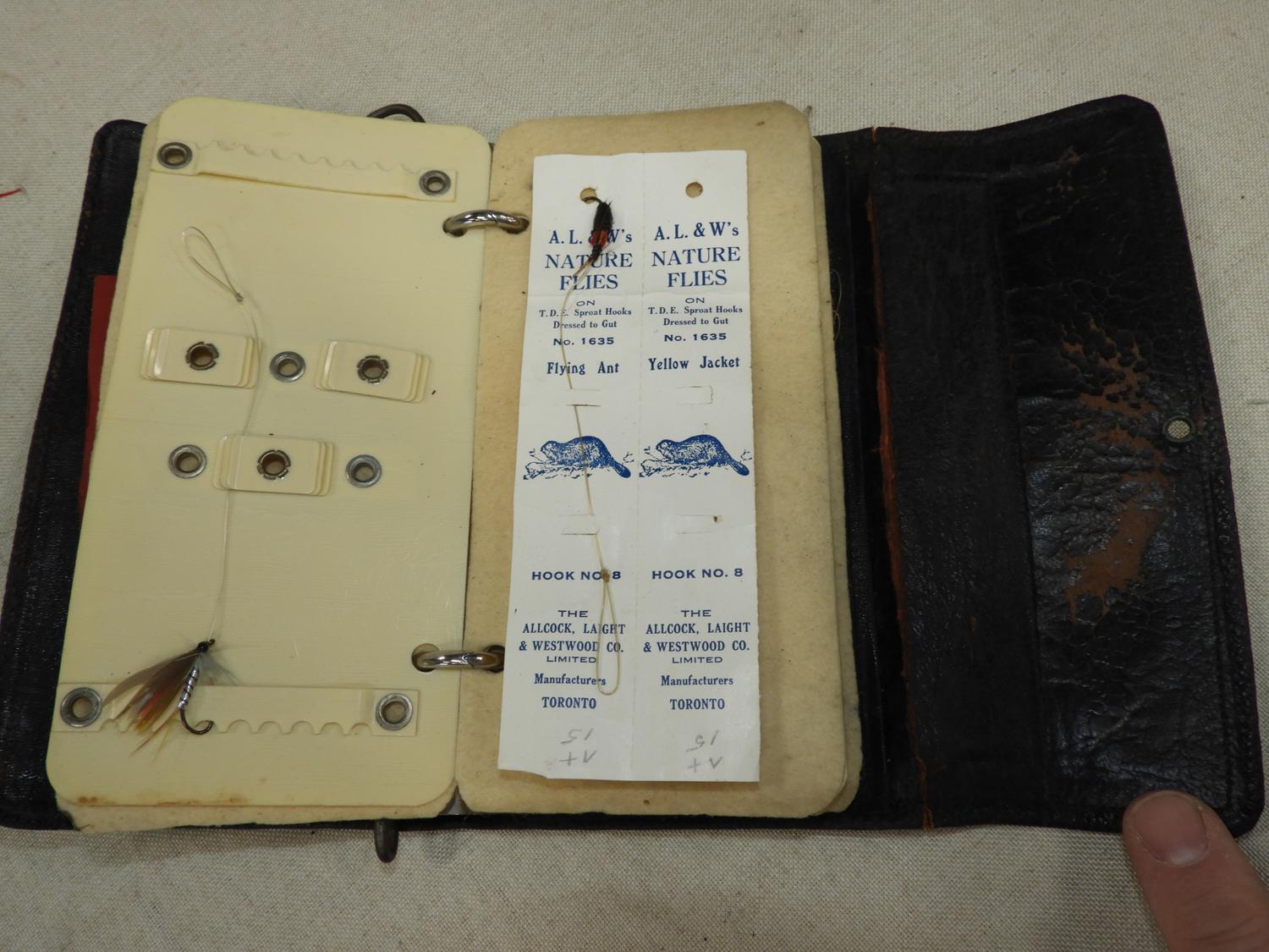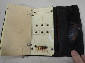 vintage leather cased fly organizer, length 7"