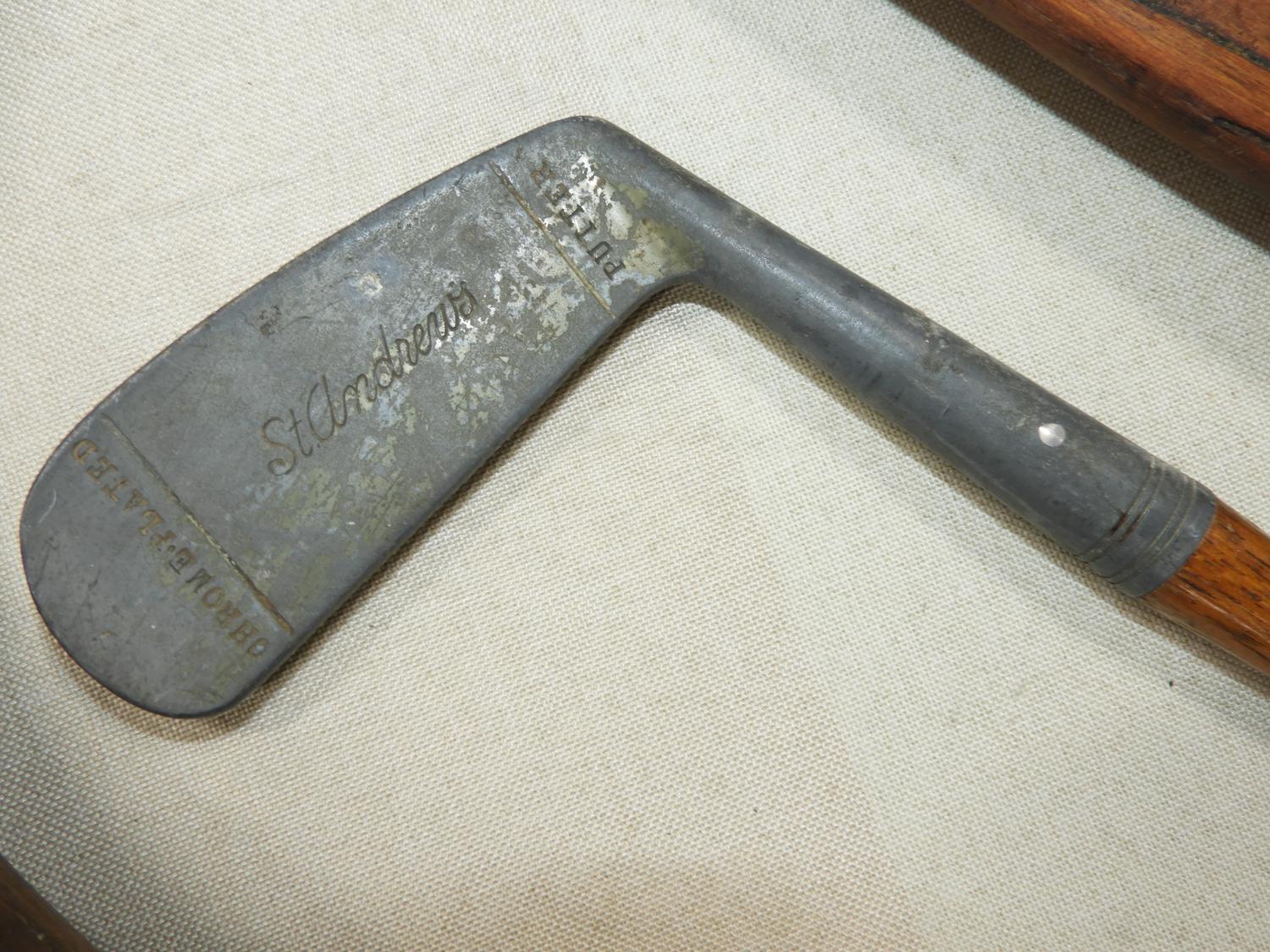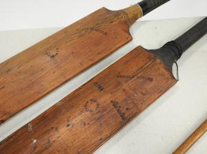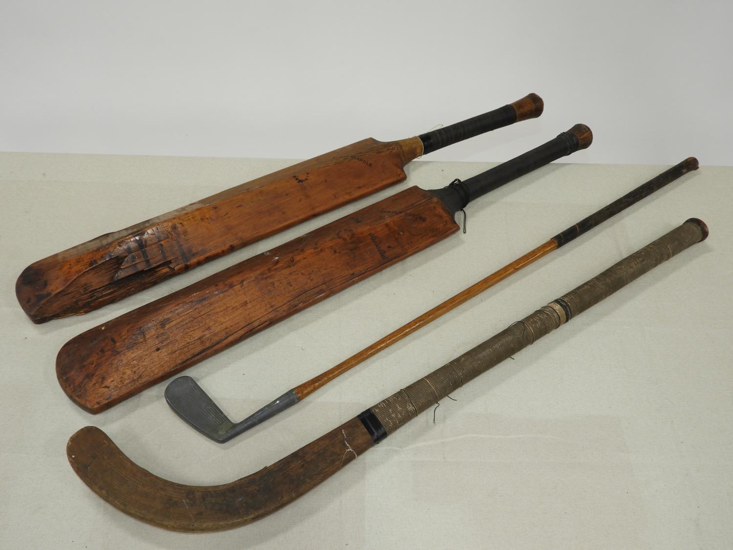 antique sporting lot, 2 cricket bats, one field hockey stick and one golf club