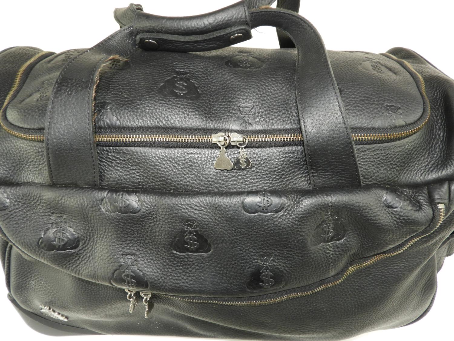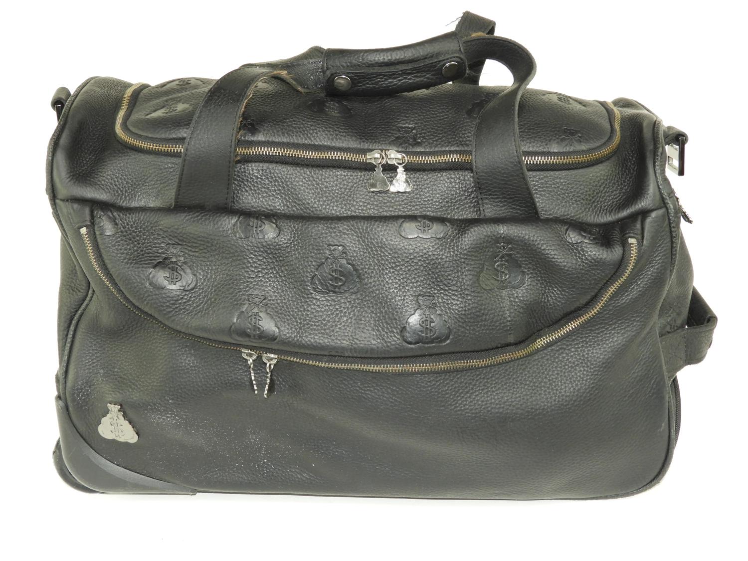 leather gene simmons money bag, money bag zipper pulls, great condition, wheels and handle