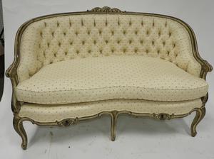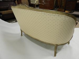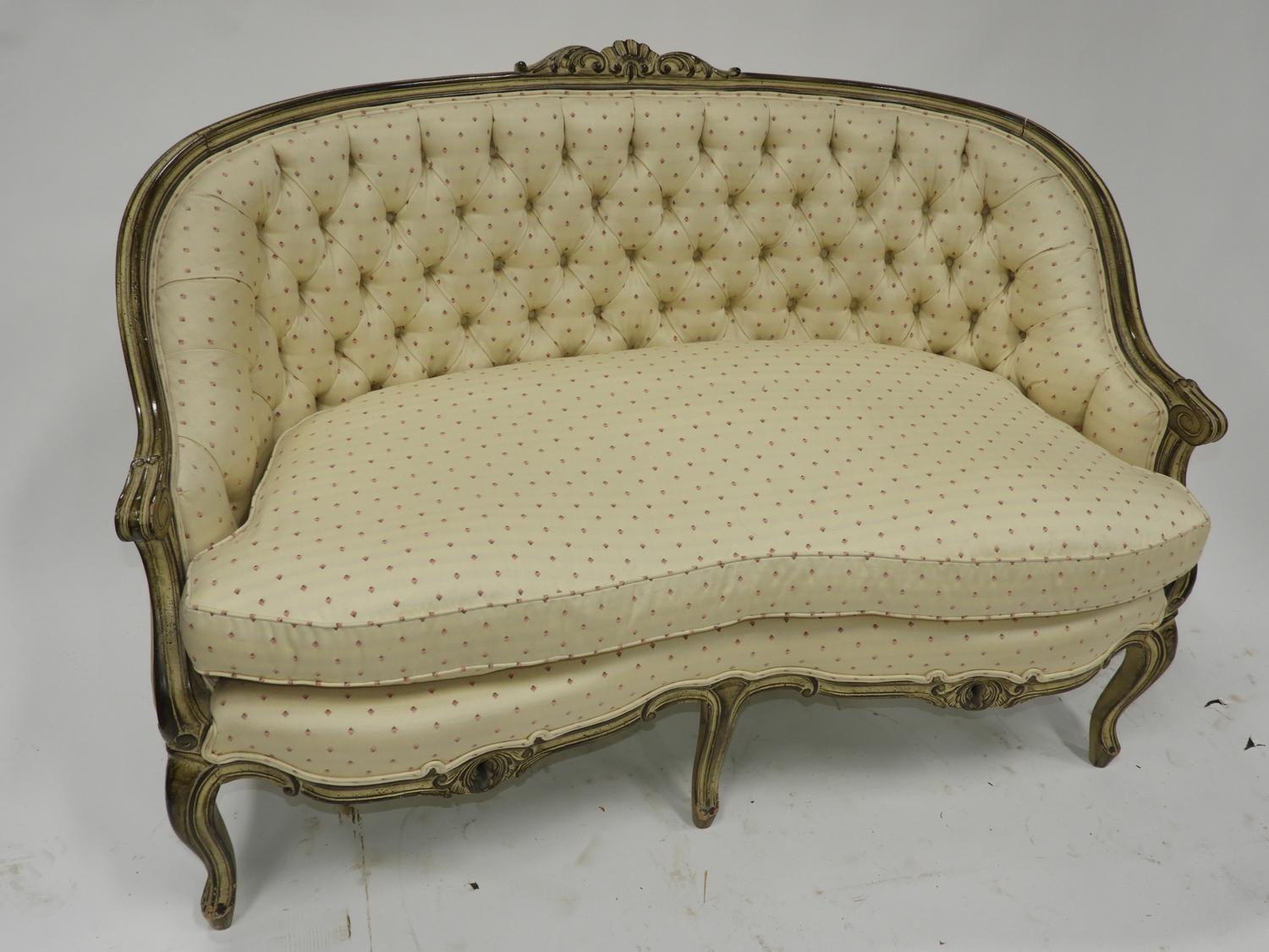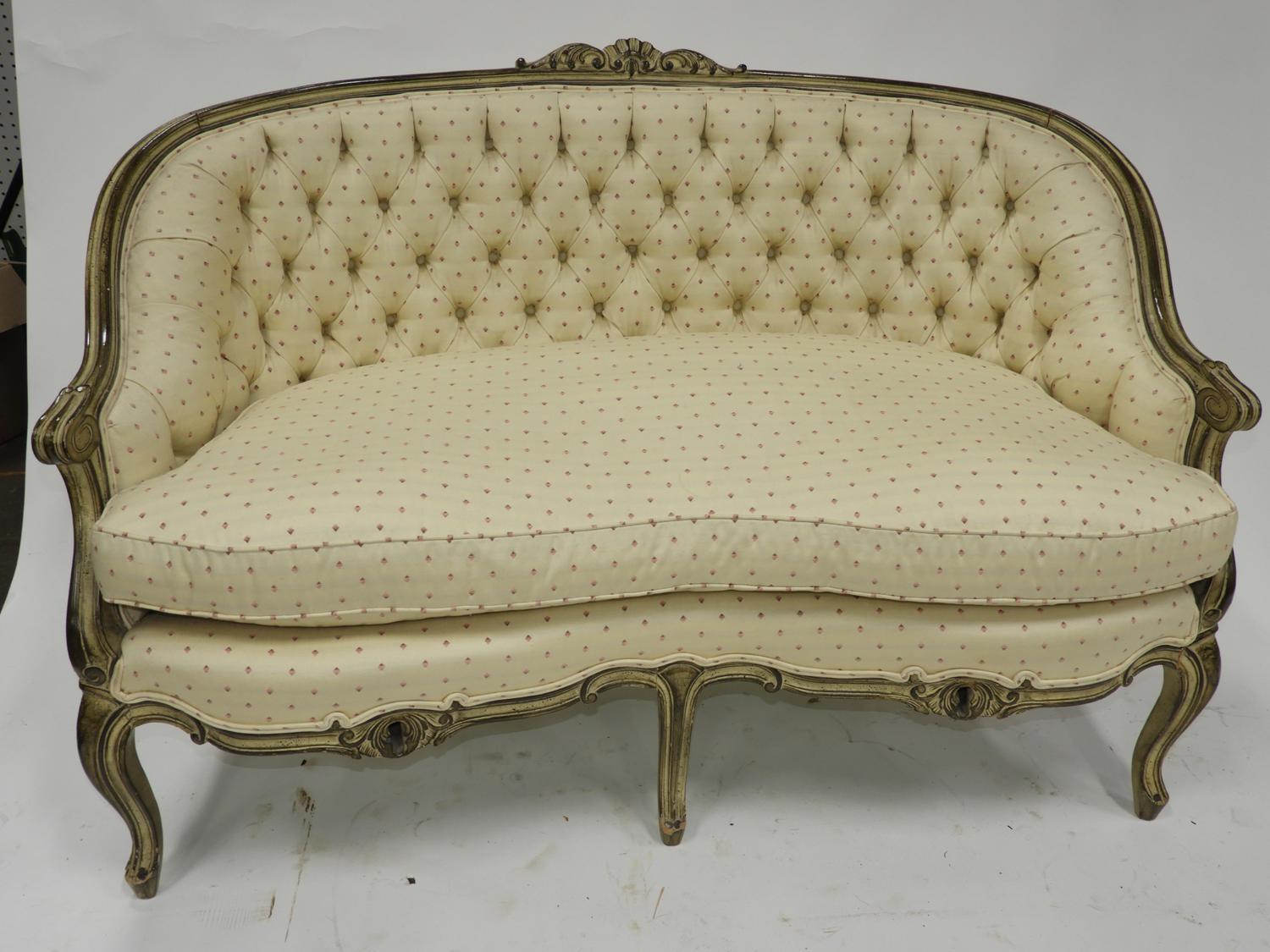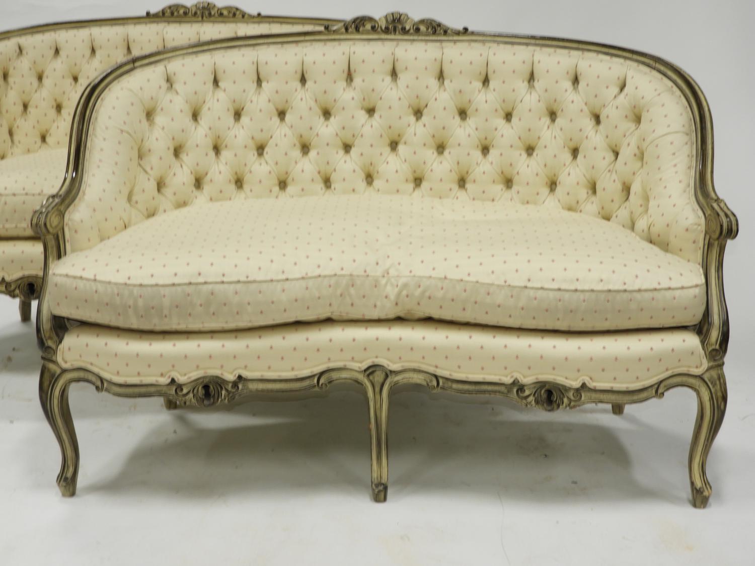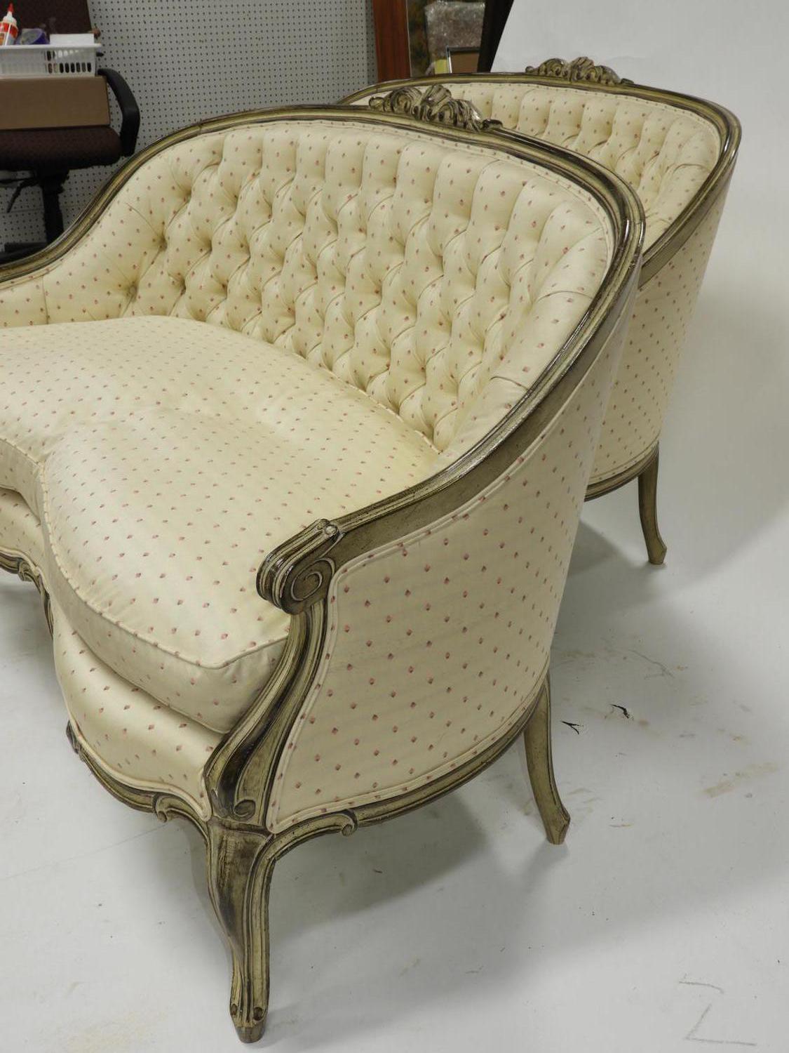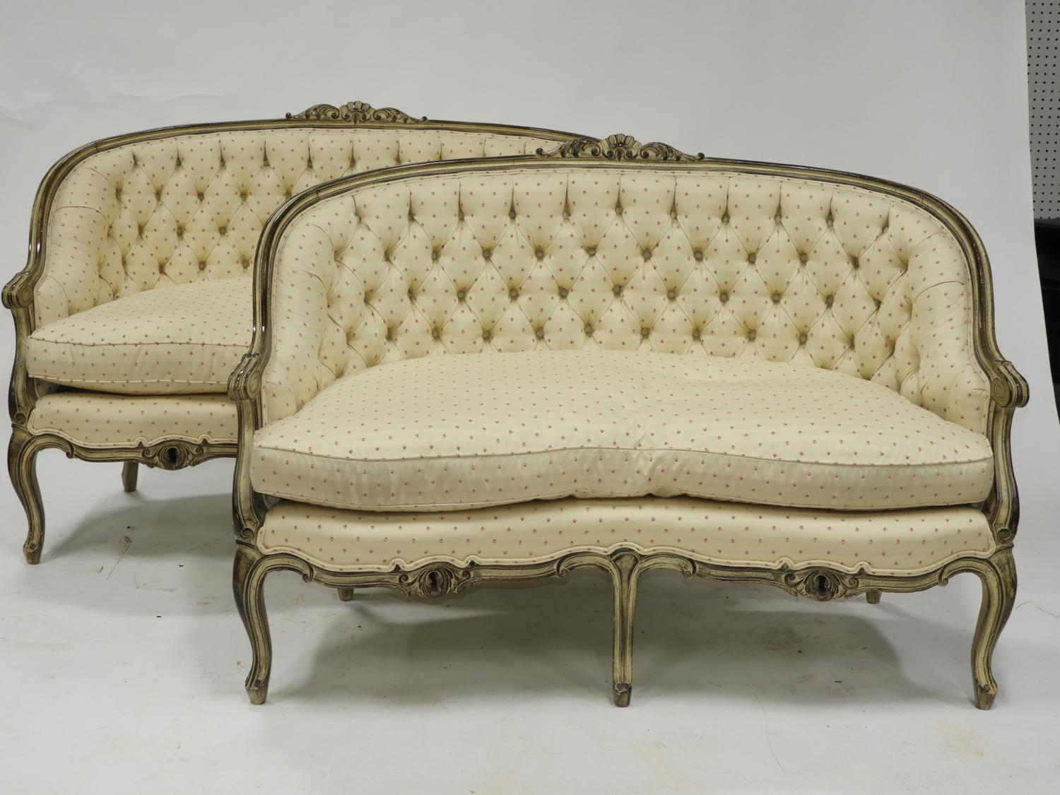 pair of louis xv-style upholstered love seats, mid 20th century, 35" x 53" x 30"