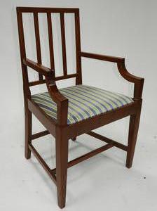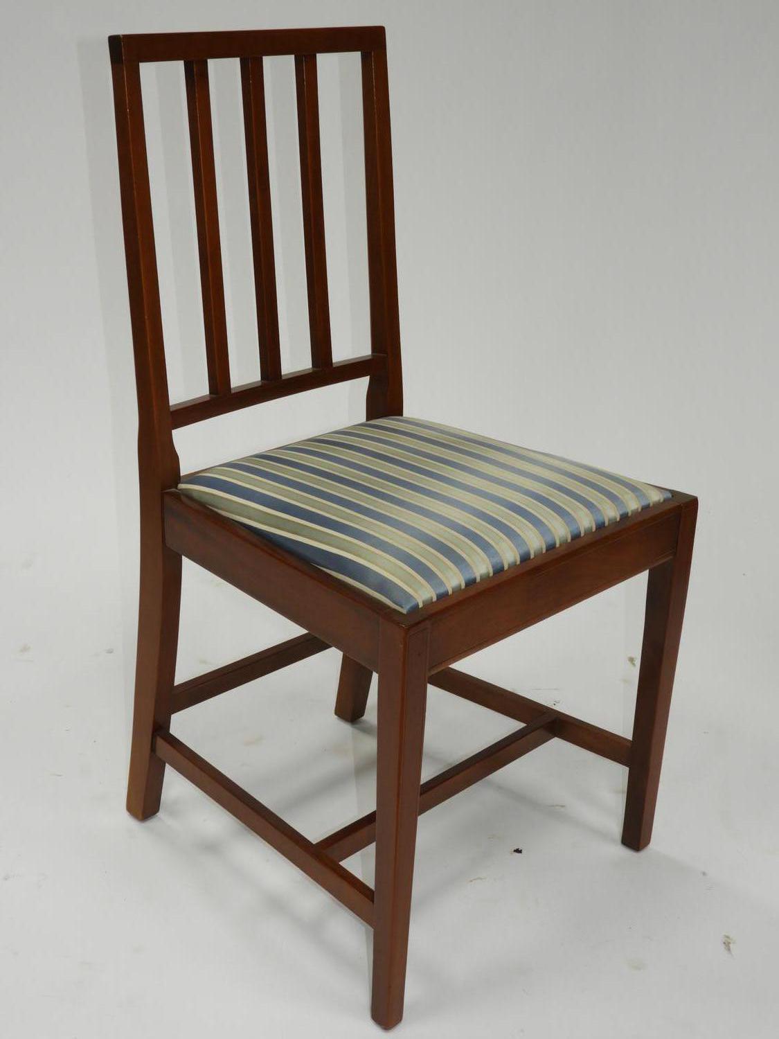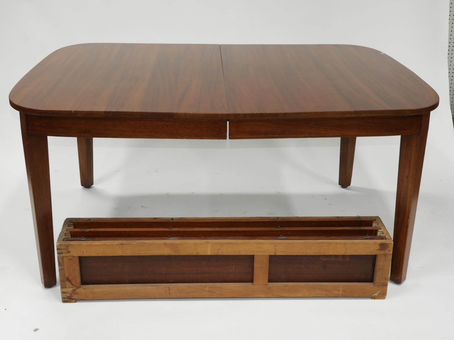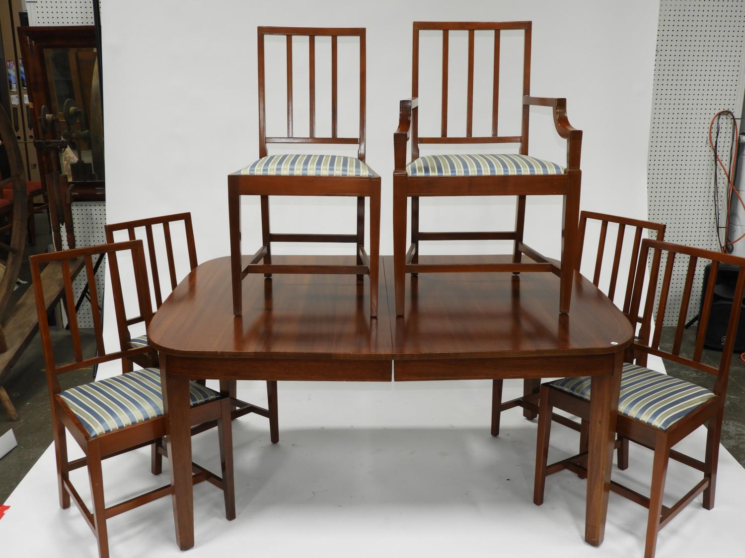 edwardian inlaid mahogany dining table with three leaves and six matching dining chairs