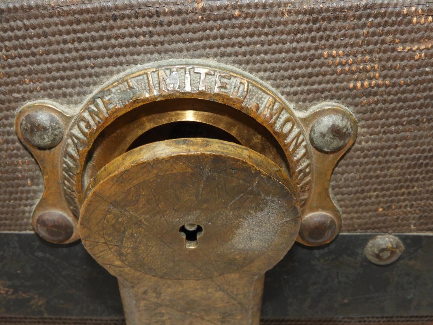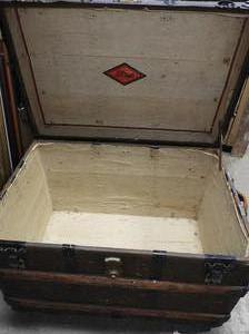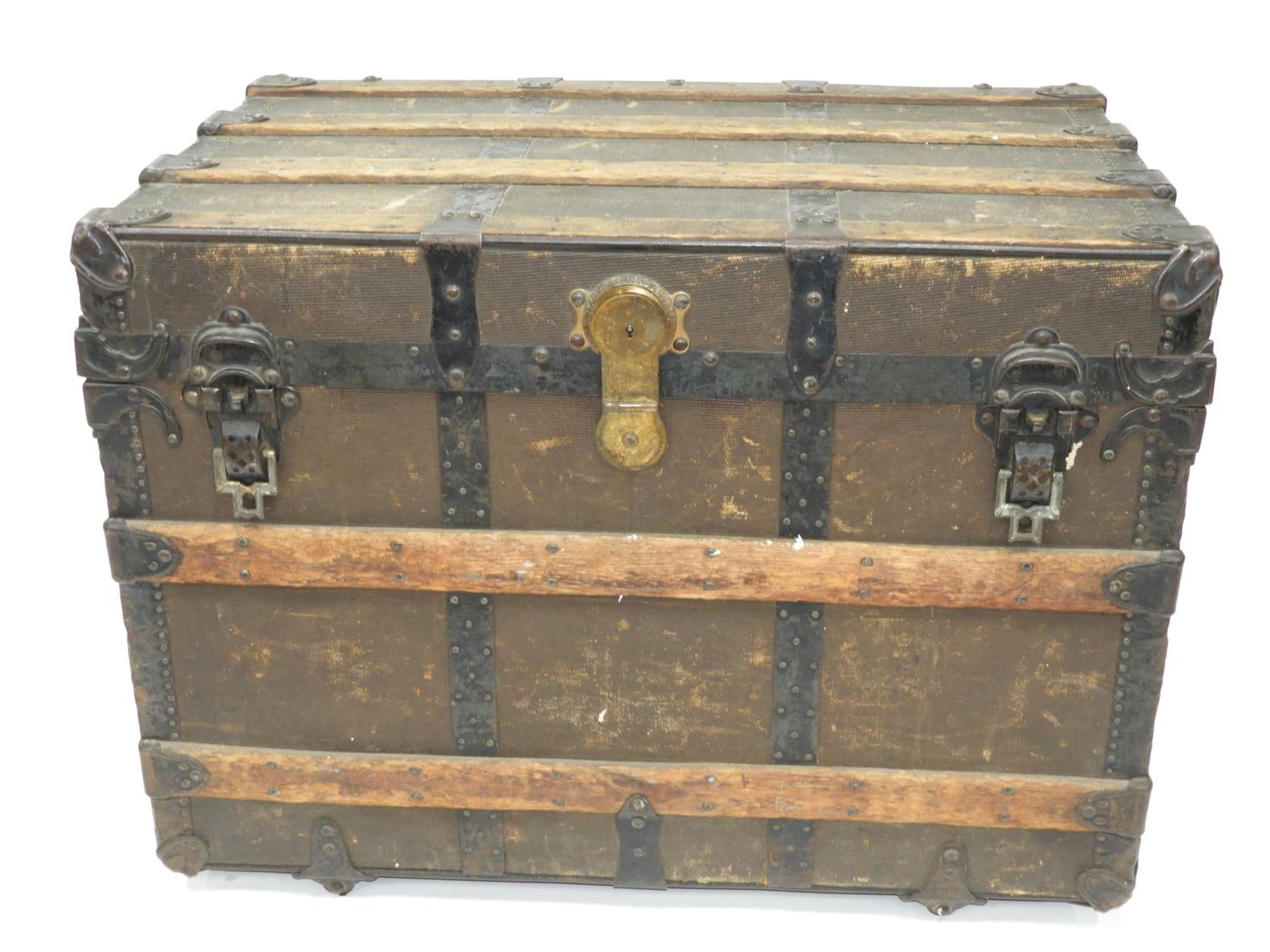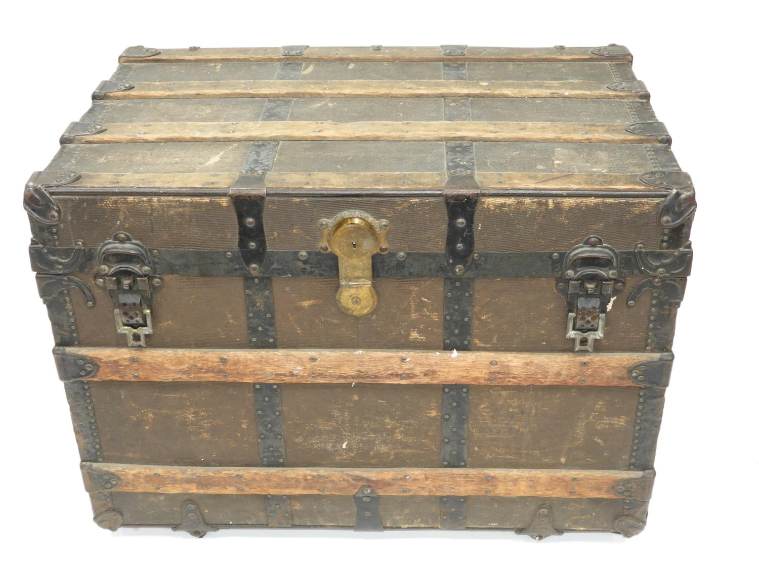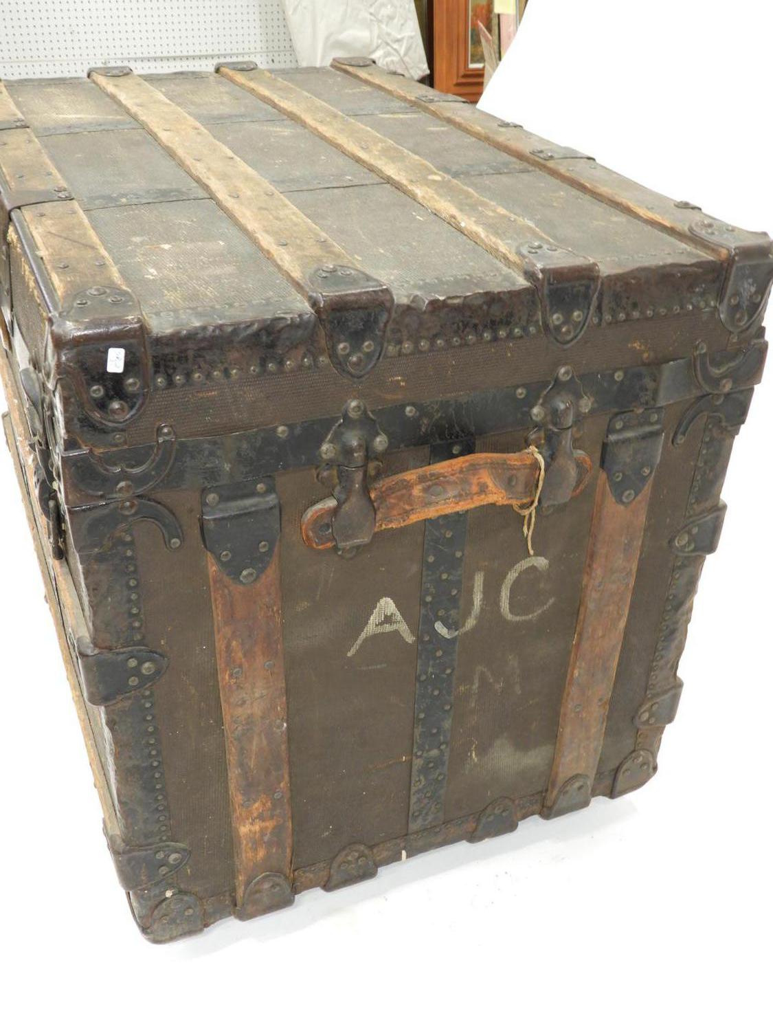 antique steamer trunk with oak strapping, 26" x 35" x 23"