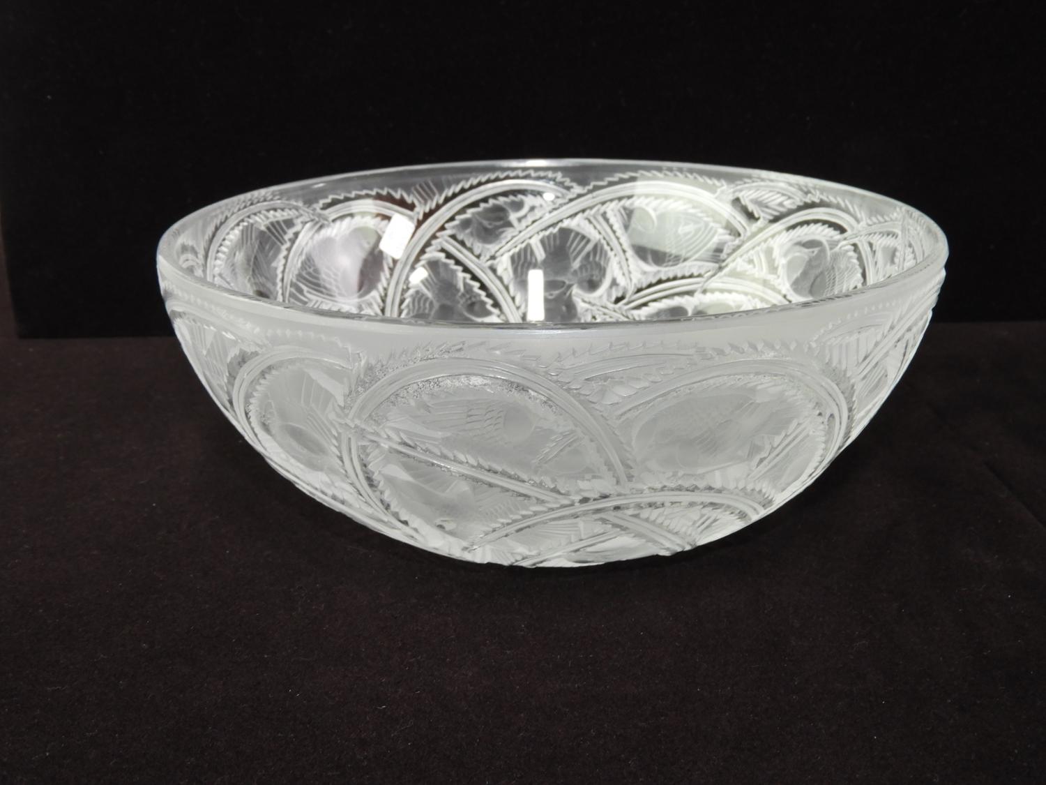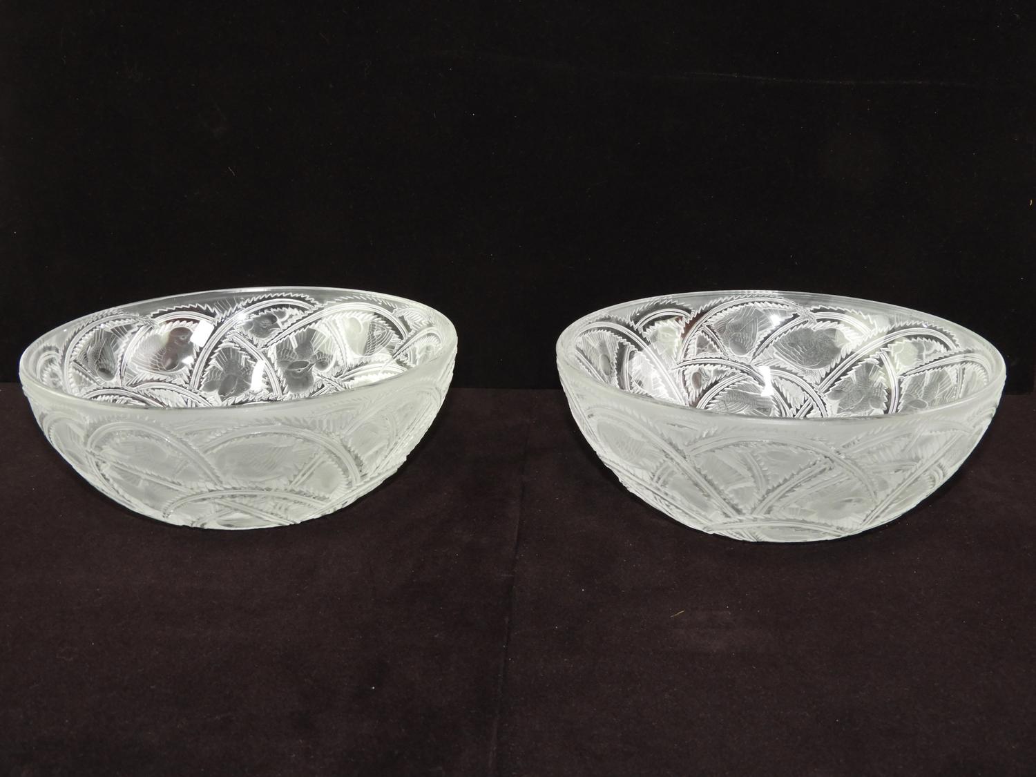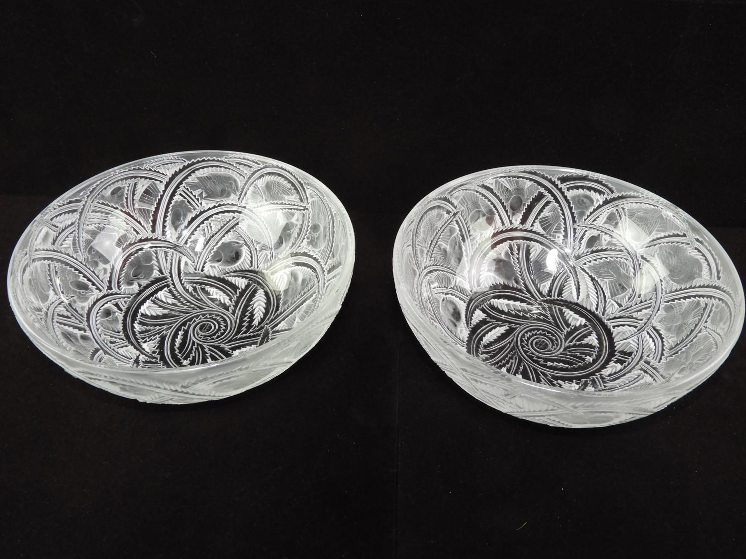 pair of signed lalique bird bowl pinsons, 9 1/4" x 3 3/4",