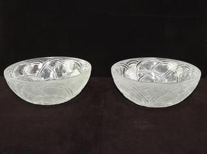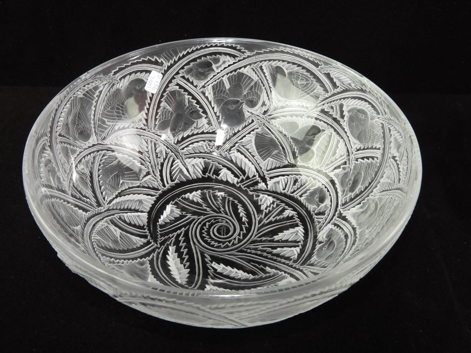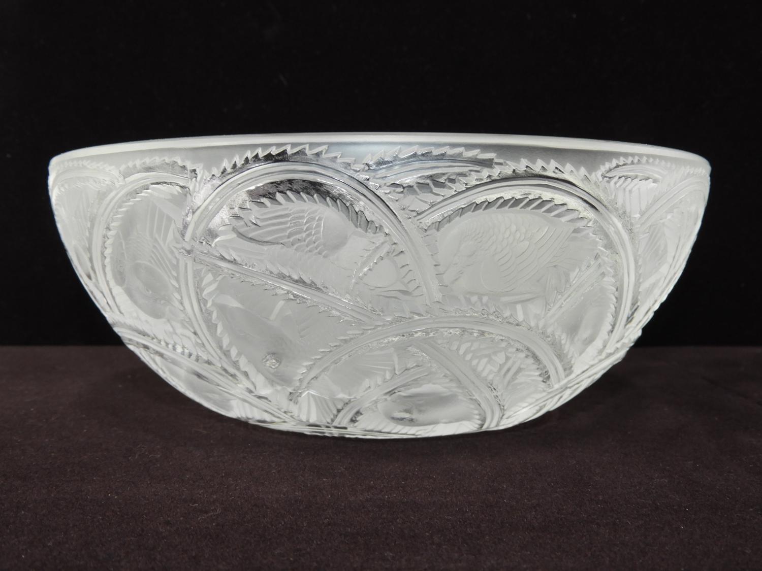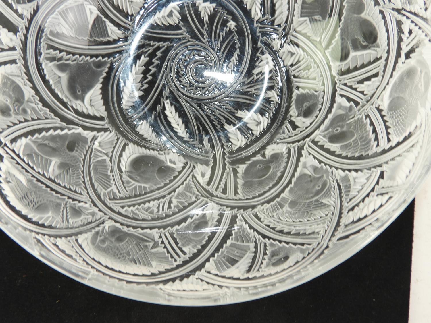 pair of signed lalique bird bowl pinsons, 9 1/4" x 3 3/4",