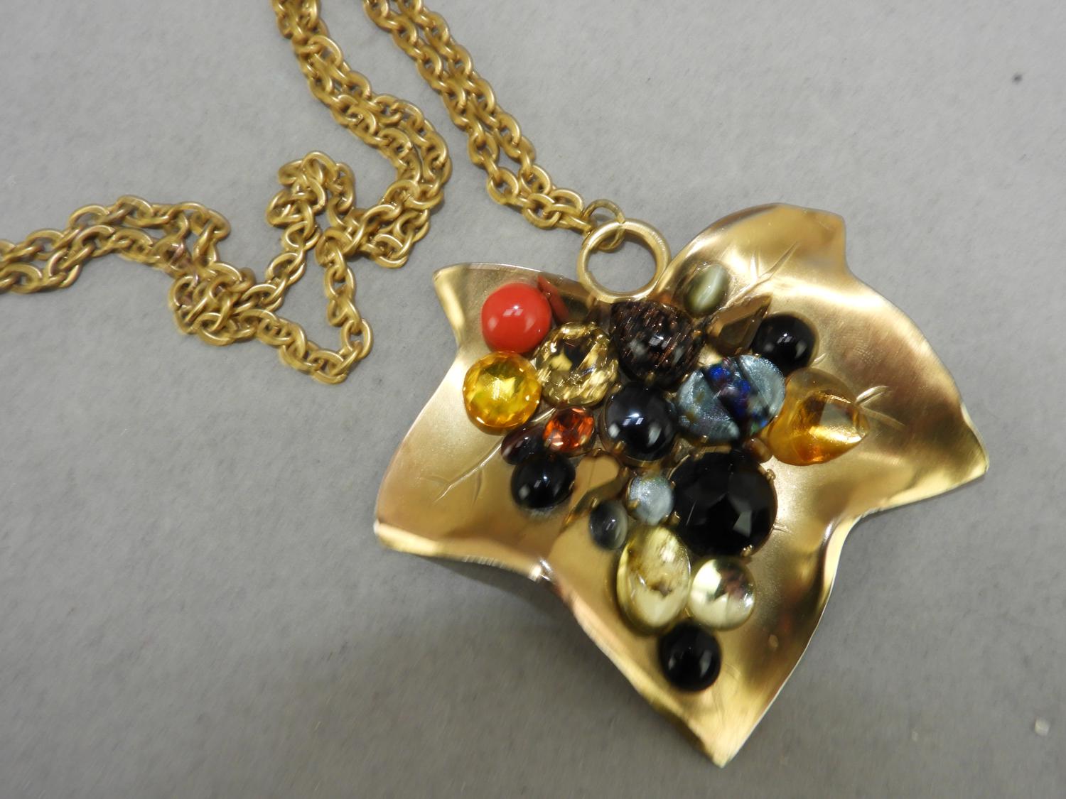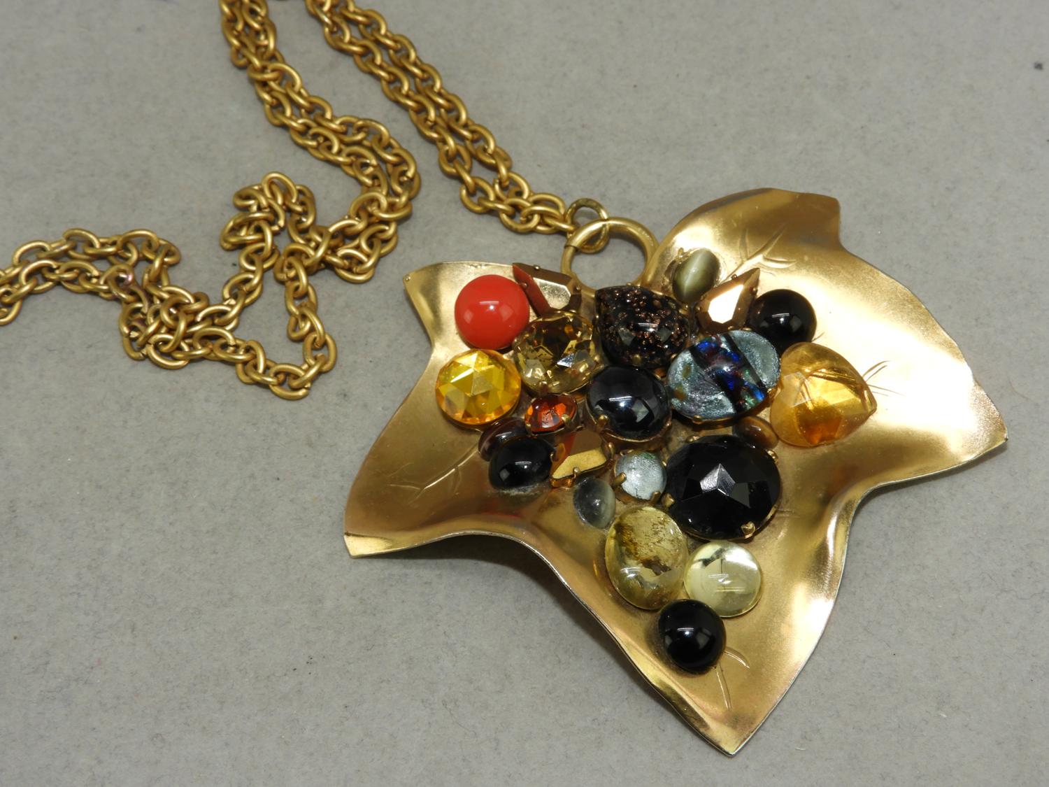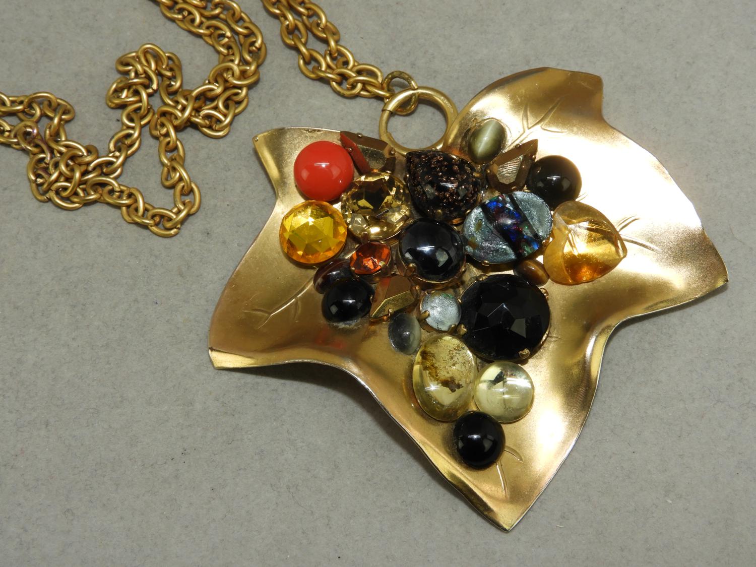 vintage poured glass cabochon, crystal leaf necklace, 3" pendant, 32" chain