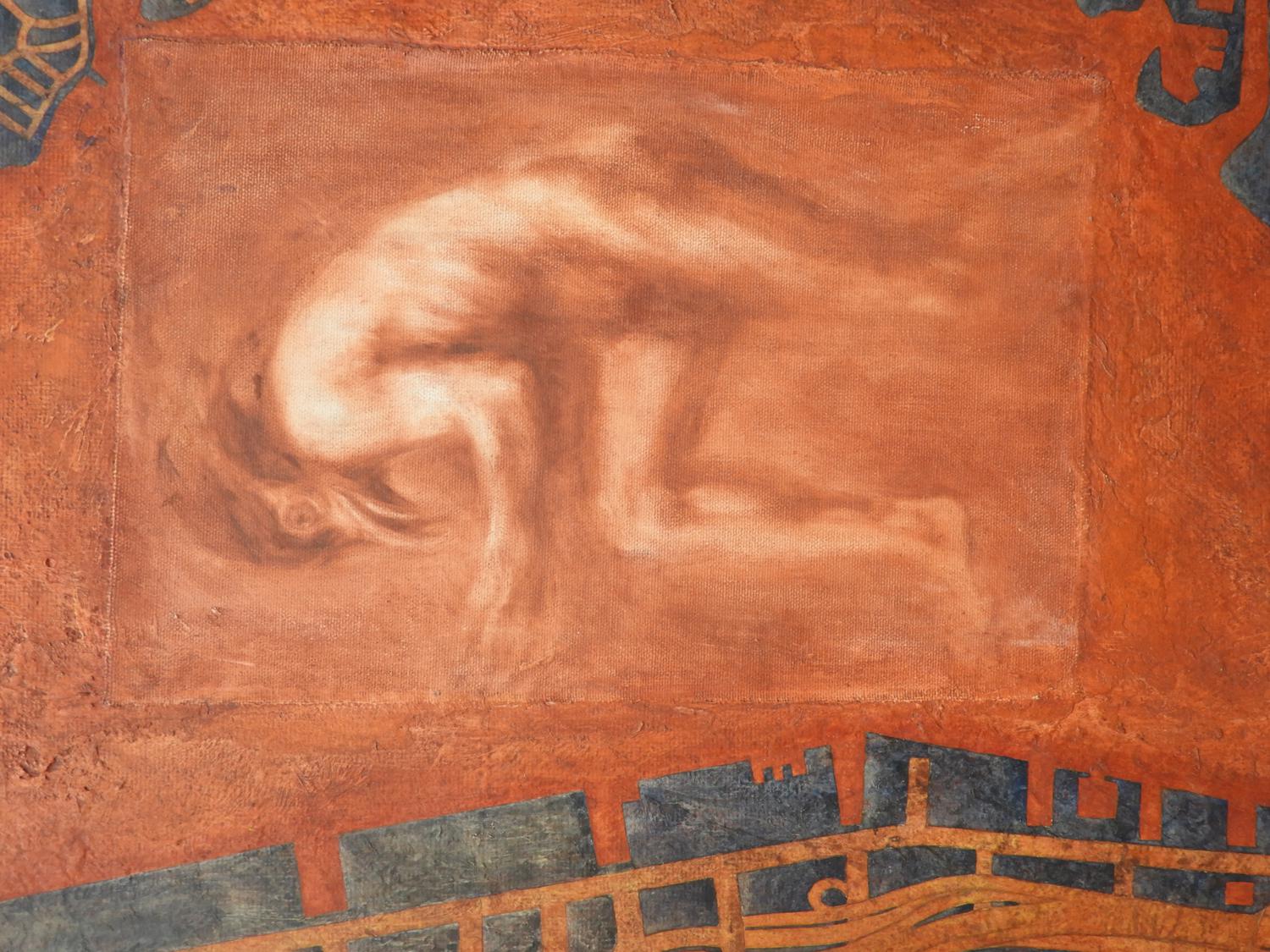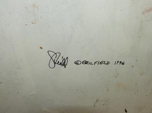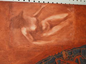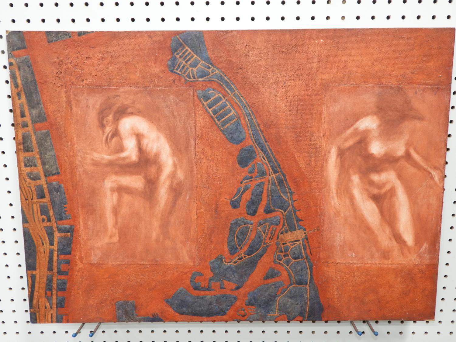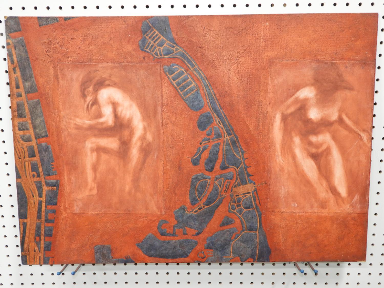 eric field, d.1996, oil on board, 21" x 30", "abstract with figures"