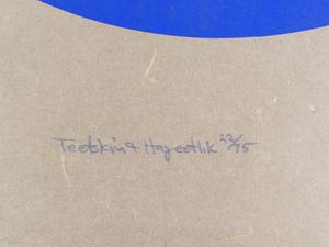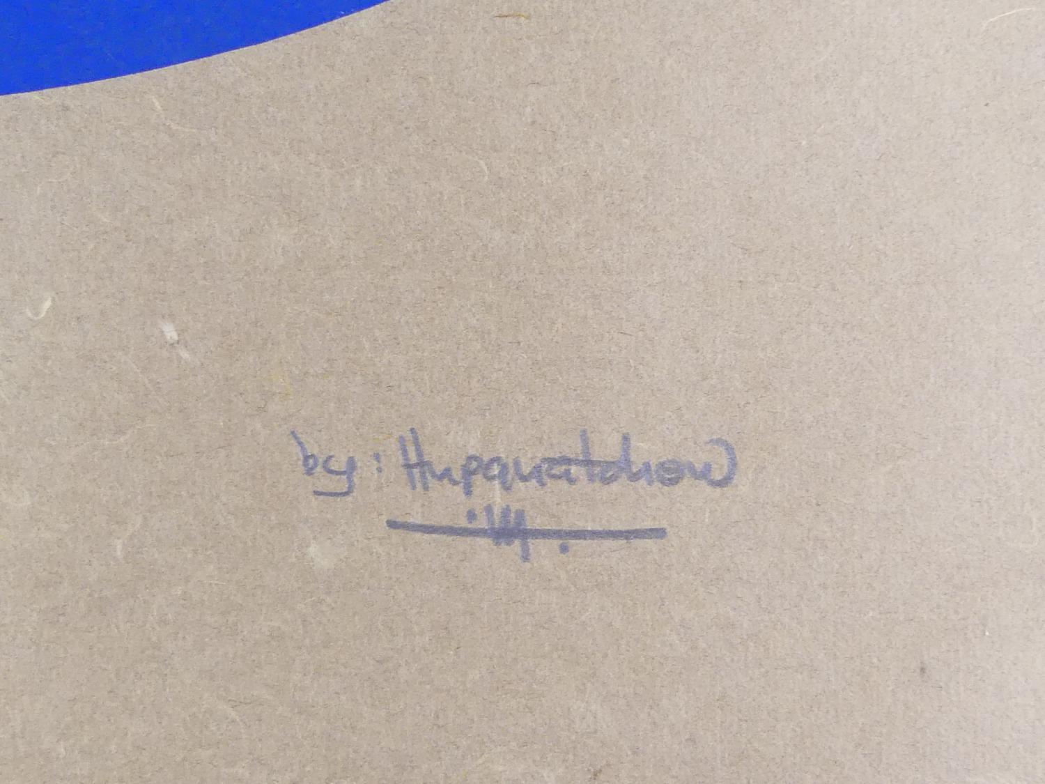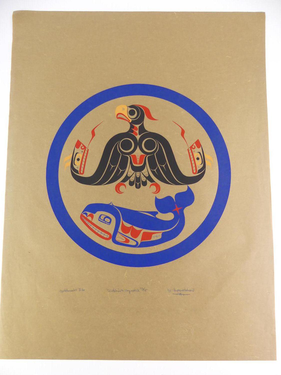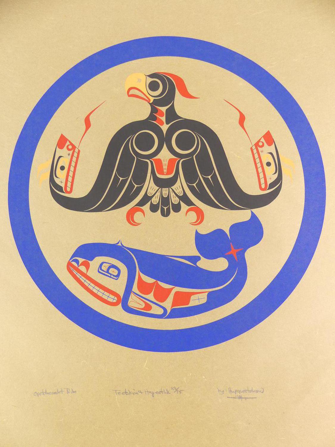 ron hamilton, hupacasath (b.1948), silkscreen, 22/75, c.1977, 32 3/4" x 24 3/4", "teetskin & hayitlik in the sky"