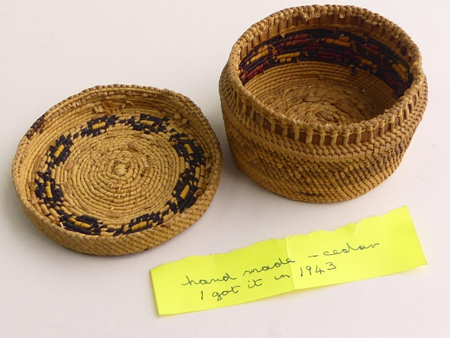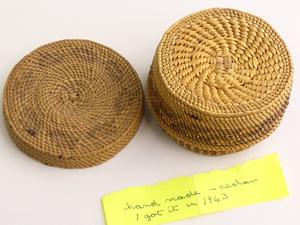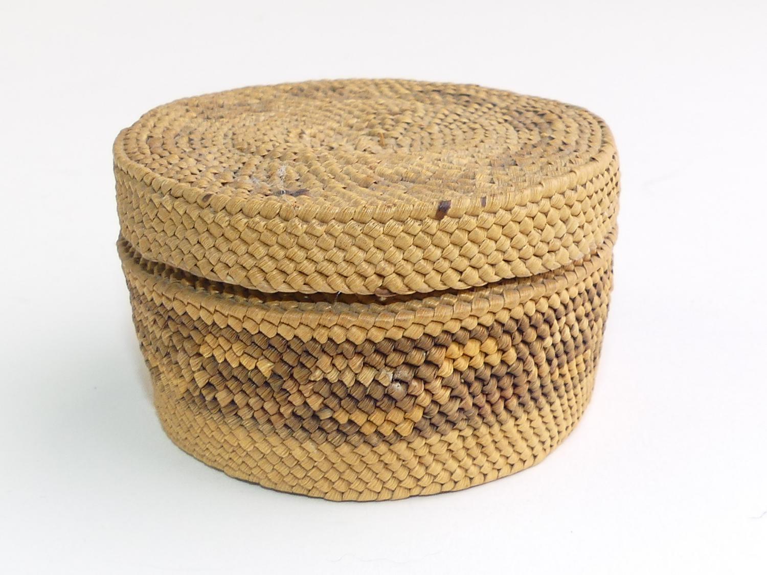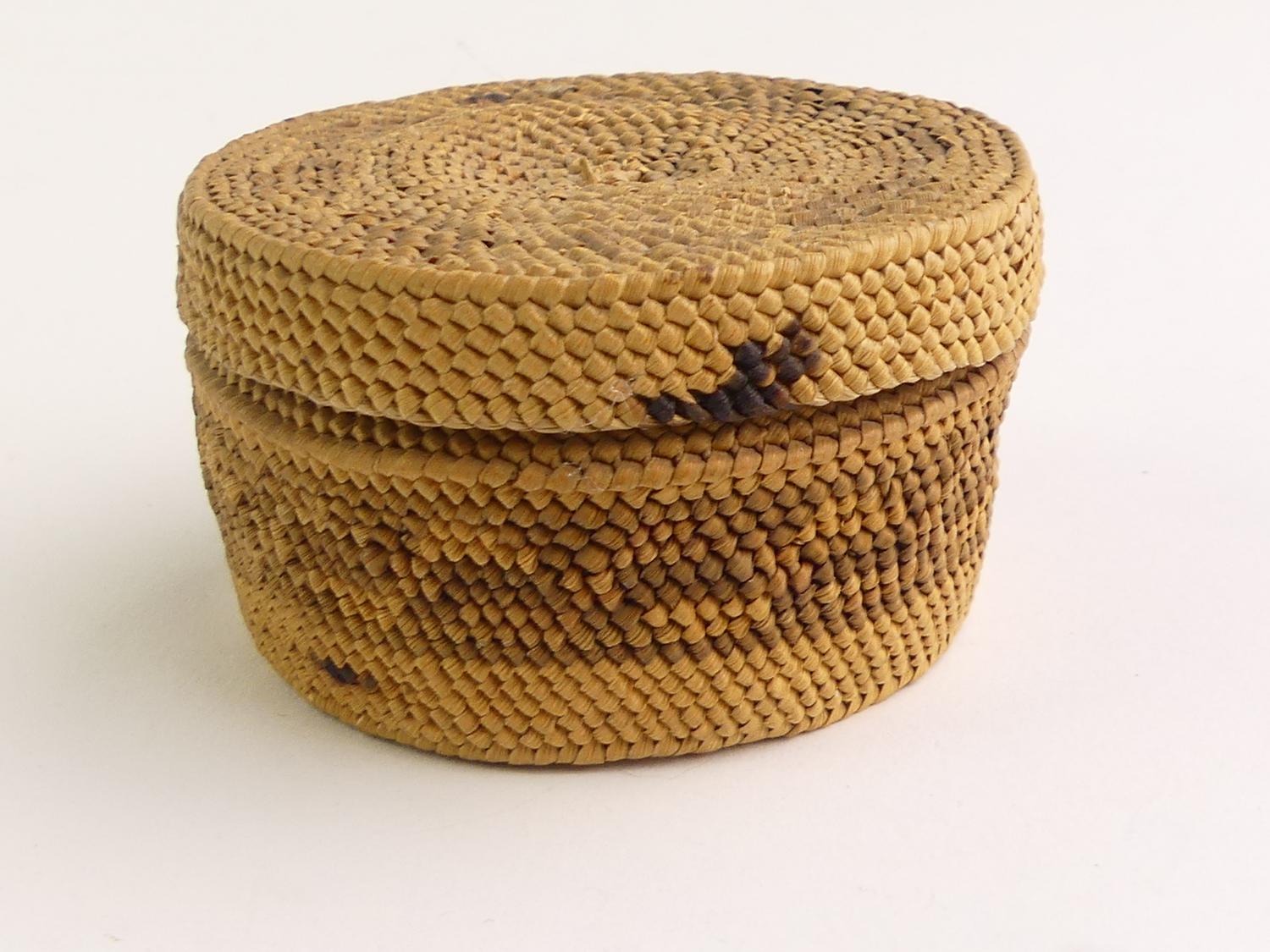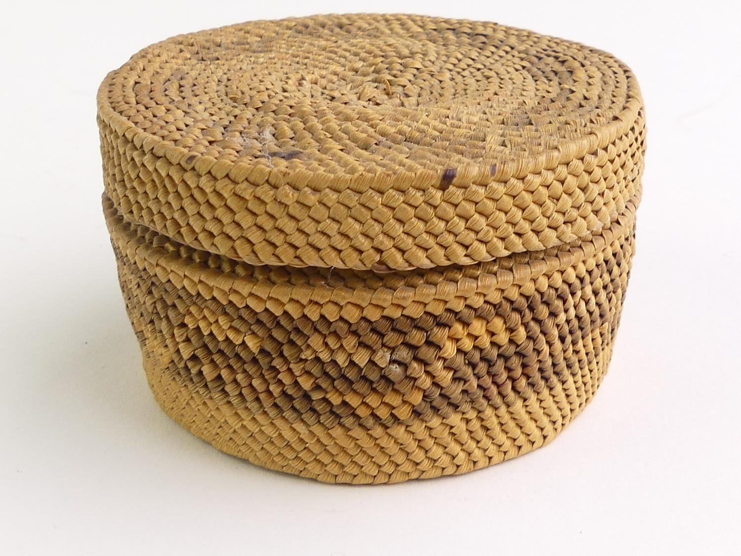 nuu-chah-nulth small circular covered basket, early 20th century, 1 1/2" x 2 1/2"