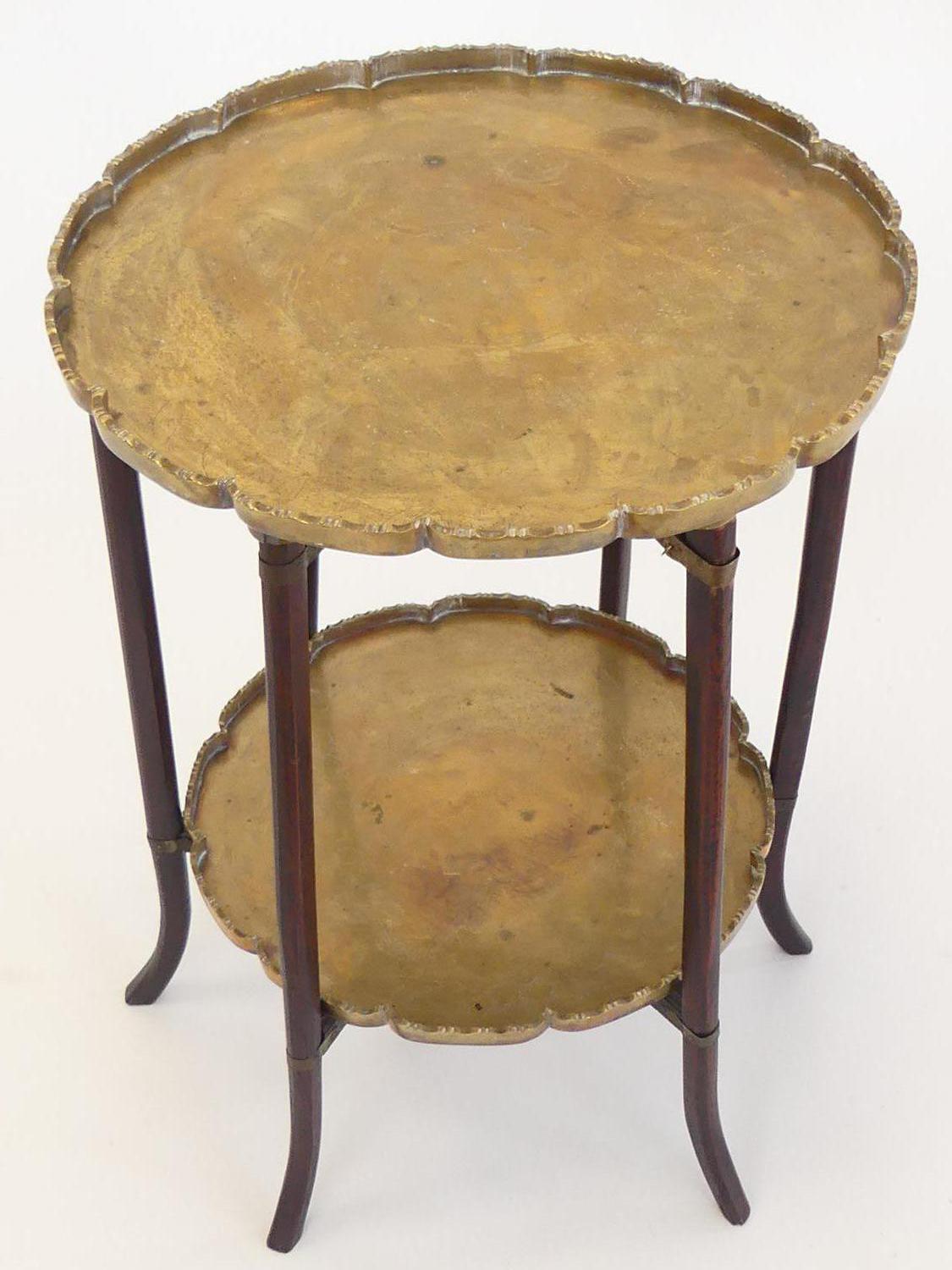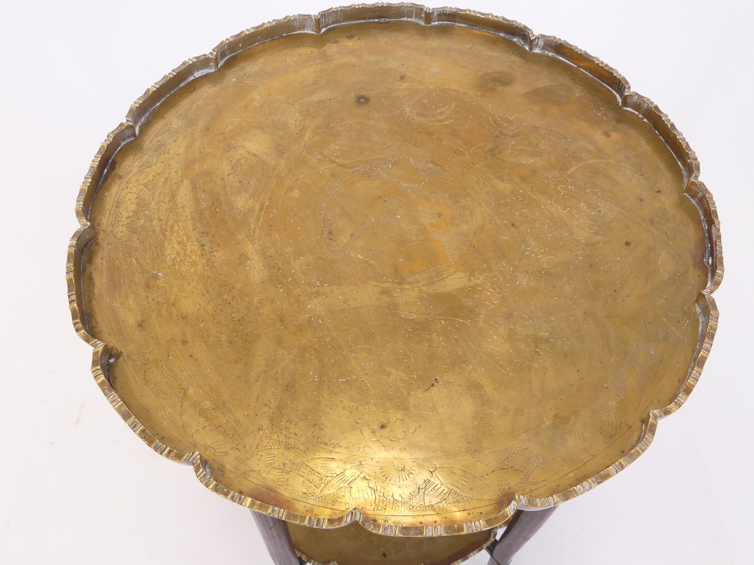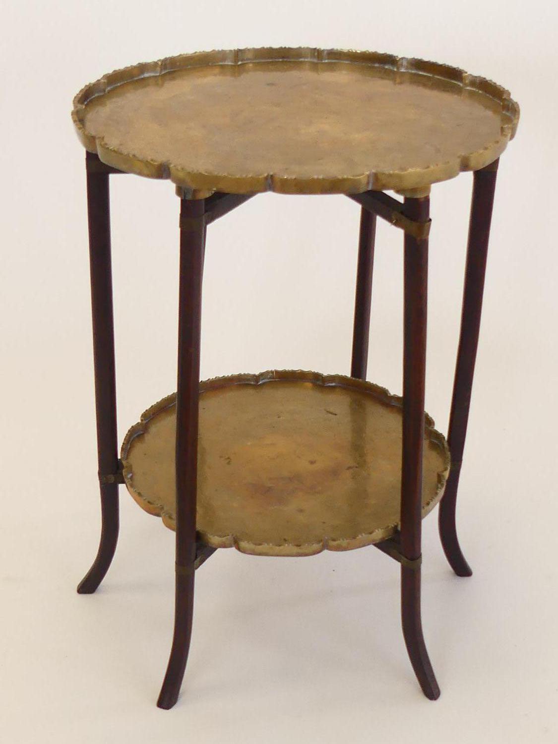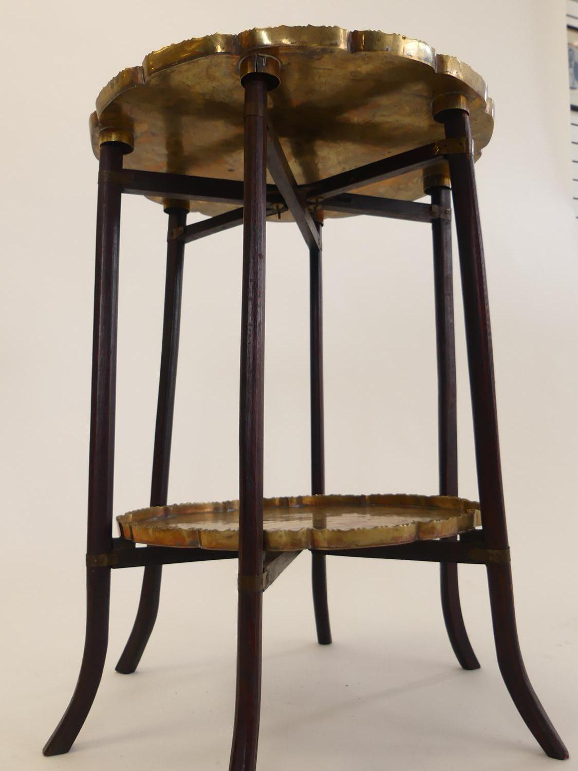 chinese two tier brass tray table with folding hardwood stand, early 20th century, 22" x 16"