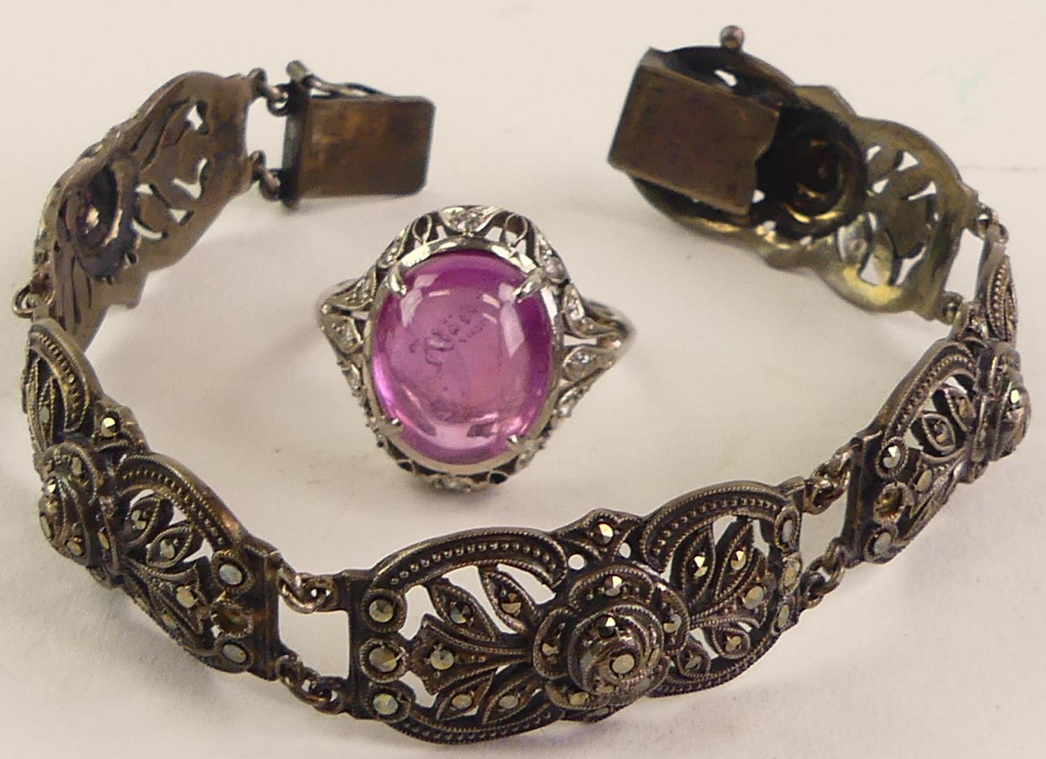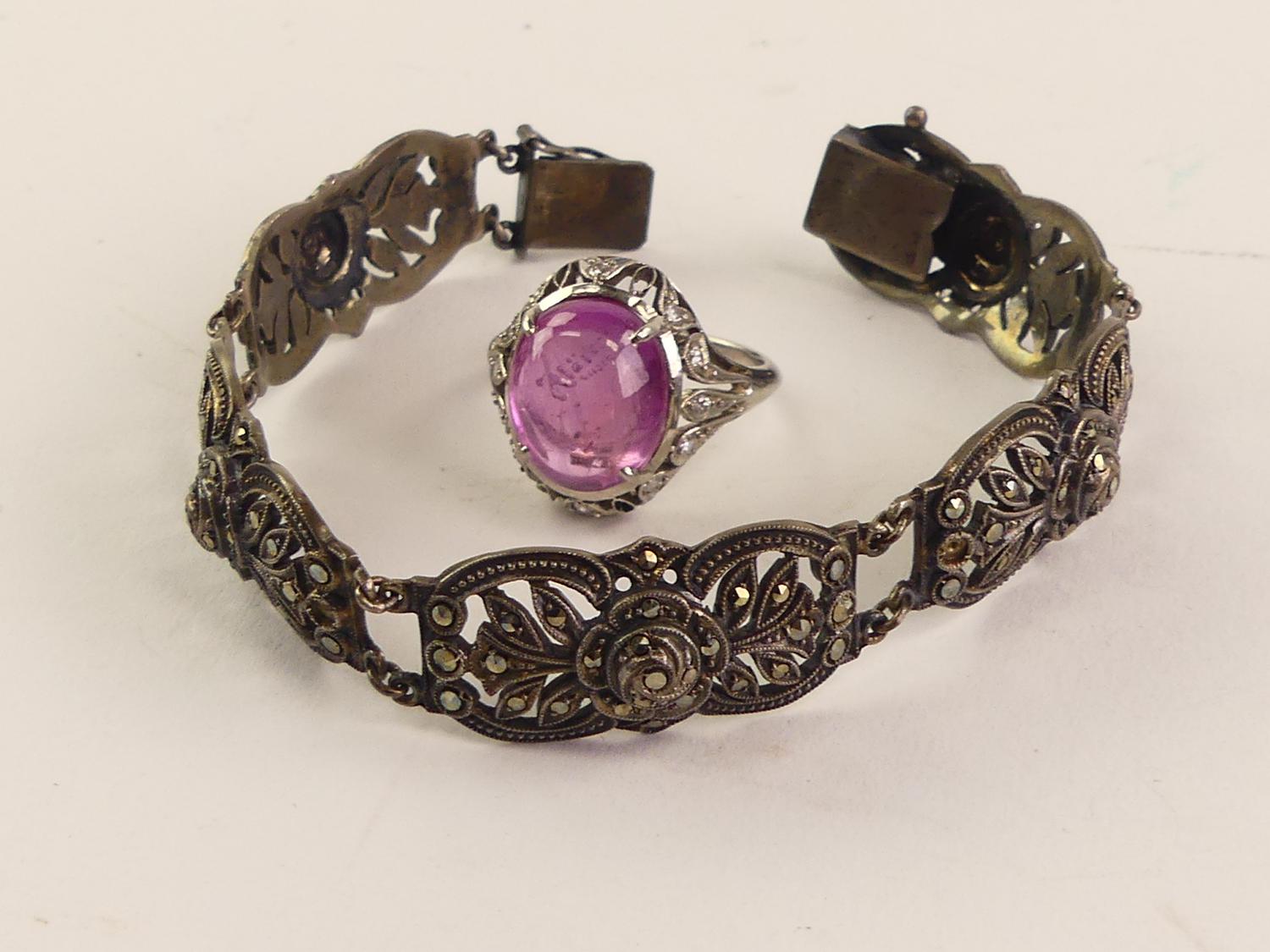 sterling silver marcasite panel bracelet, 6 1/2", with synthetic silver ring