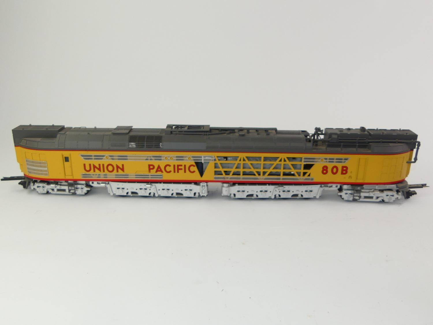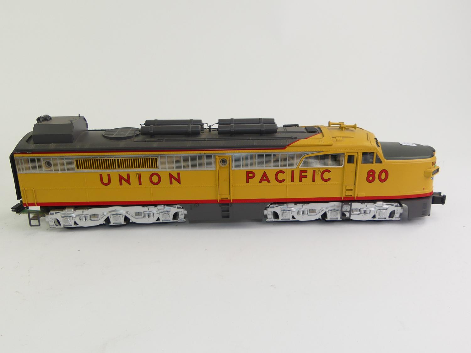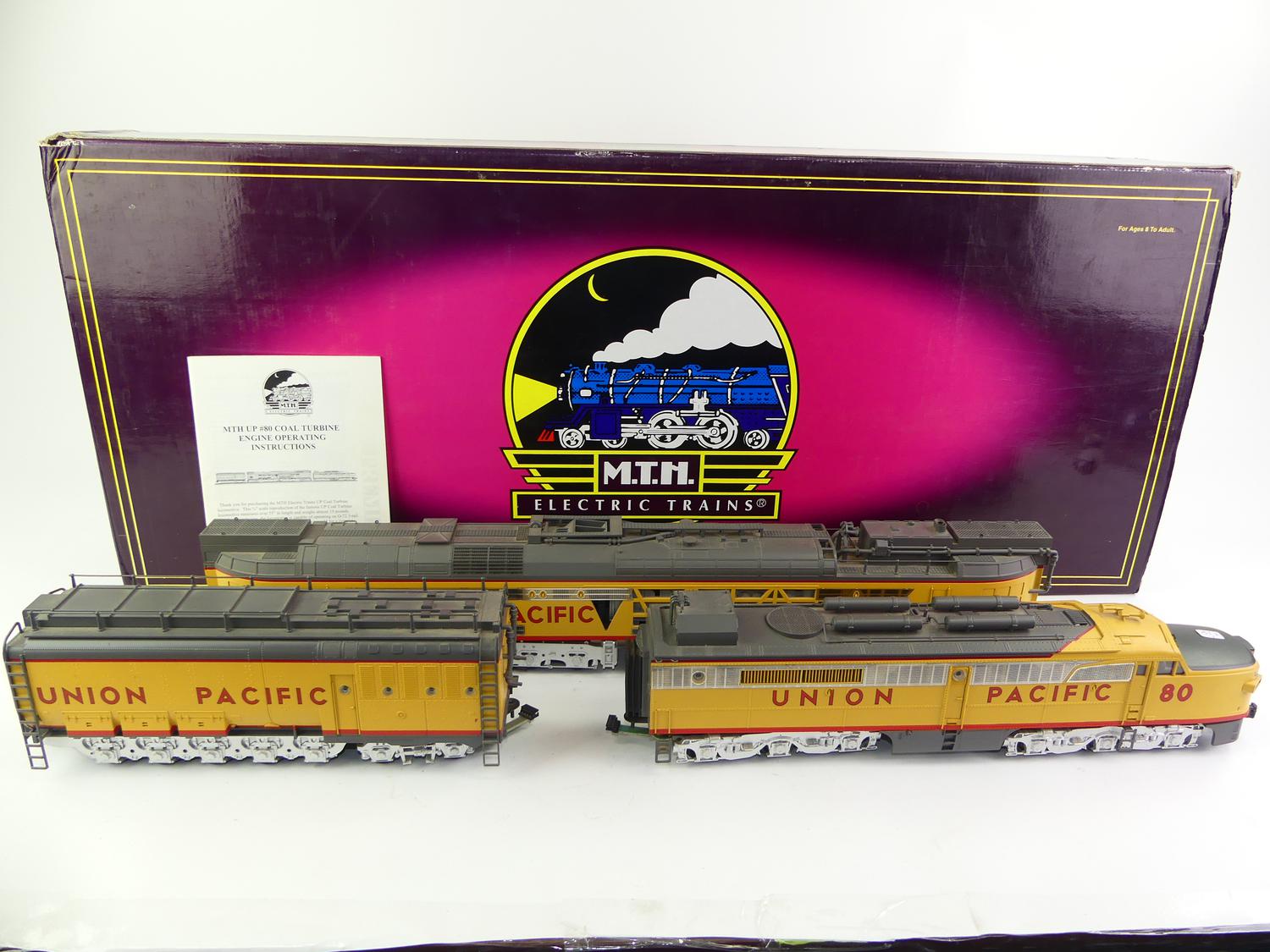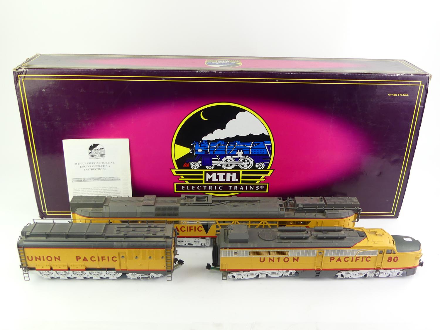 mth union pacific #80 coal turbine engine with protosound, o-scale 1/4", three section electric train with original box and manual