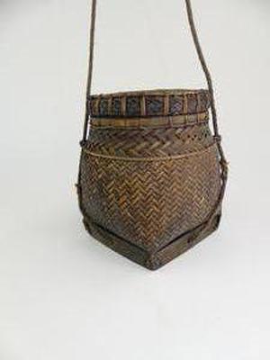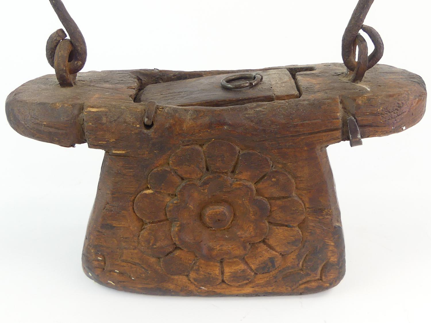 asian carved wood purse, basket, bust and figure (4 pcs)