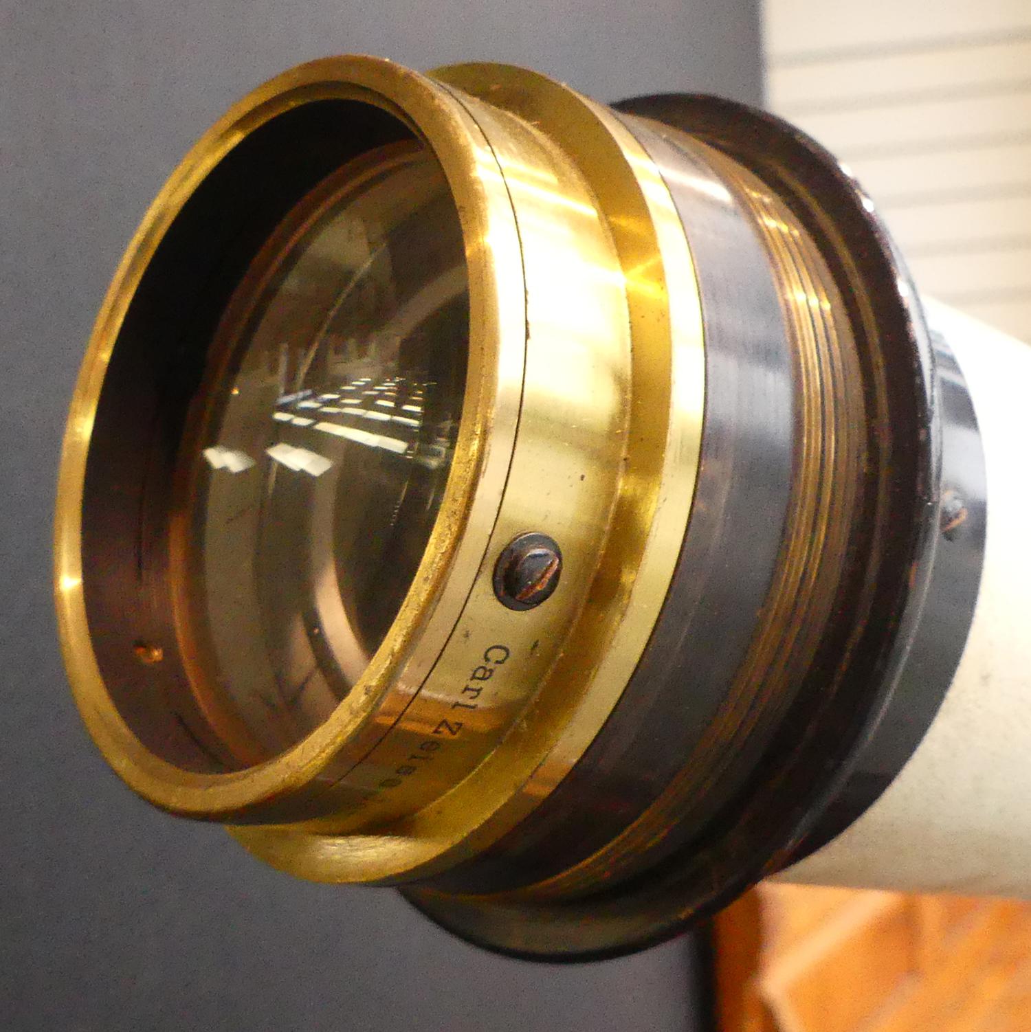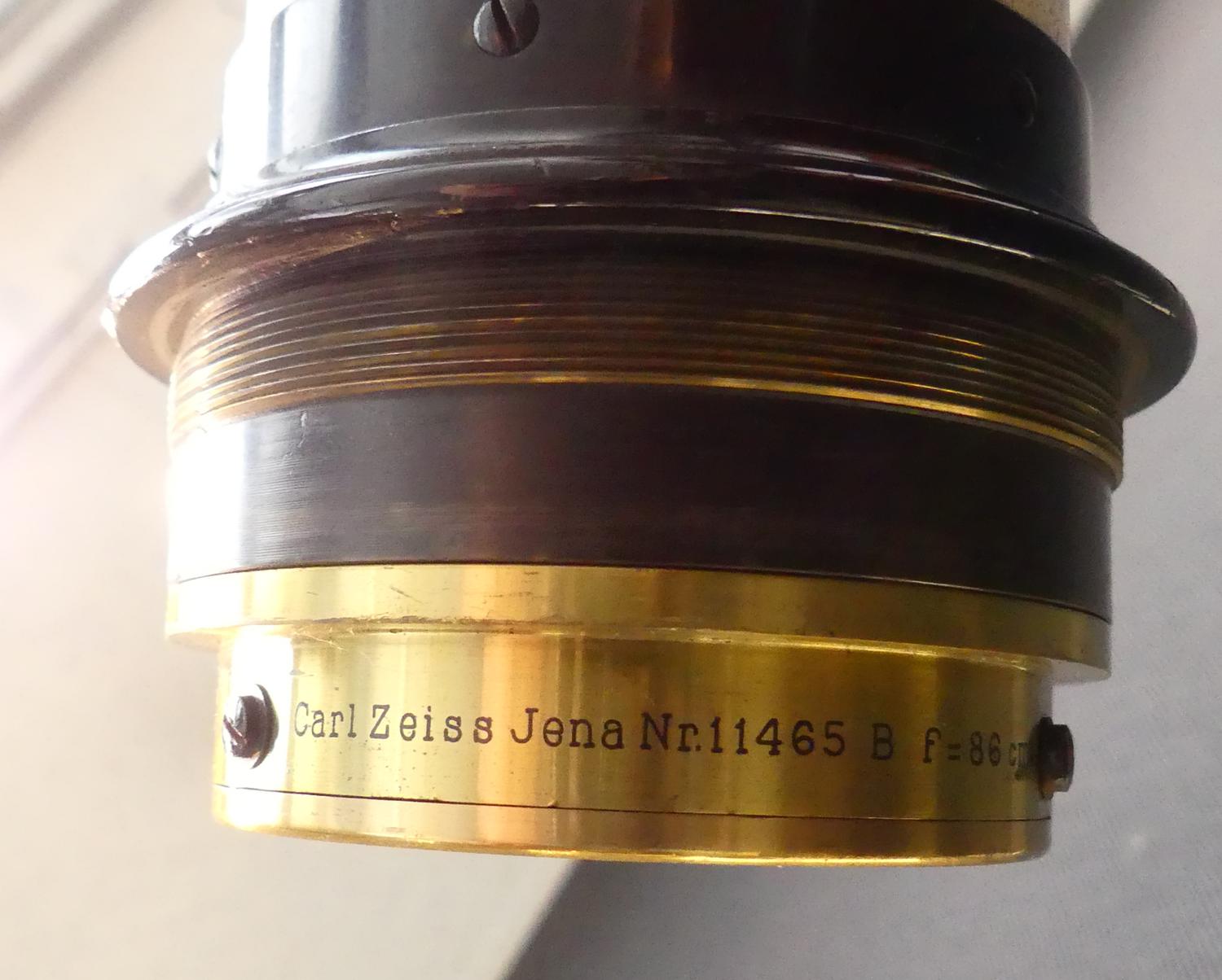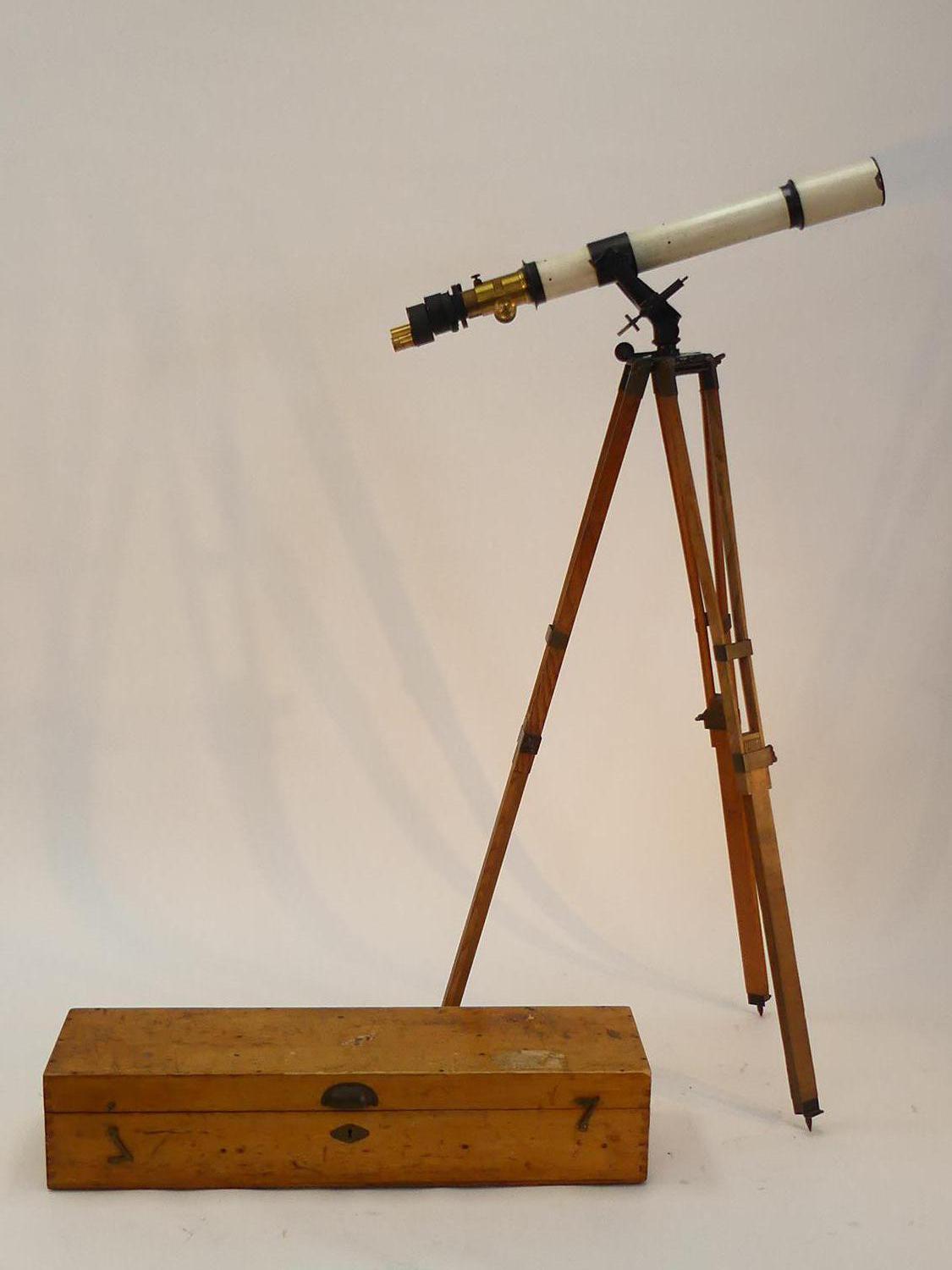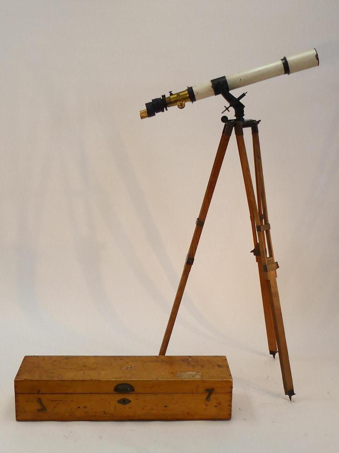 carl zeiss jena brass refractor telescope, serial #8019, with enamelled finish, original case filled with lenses and optics and tripod stand