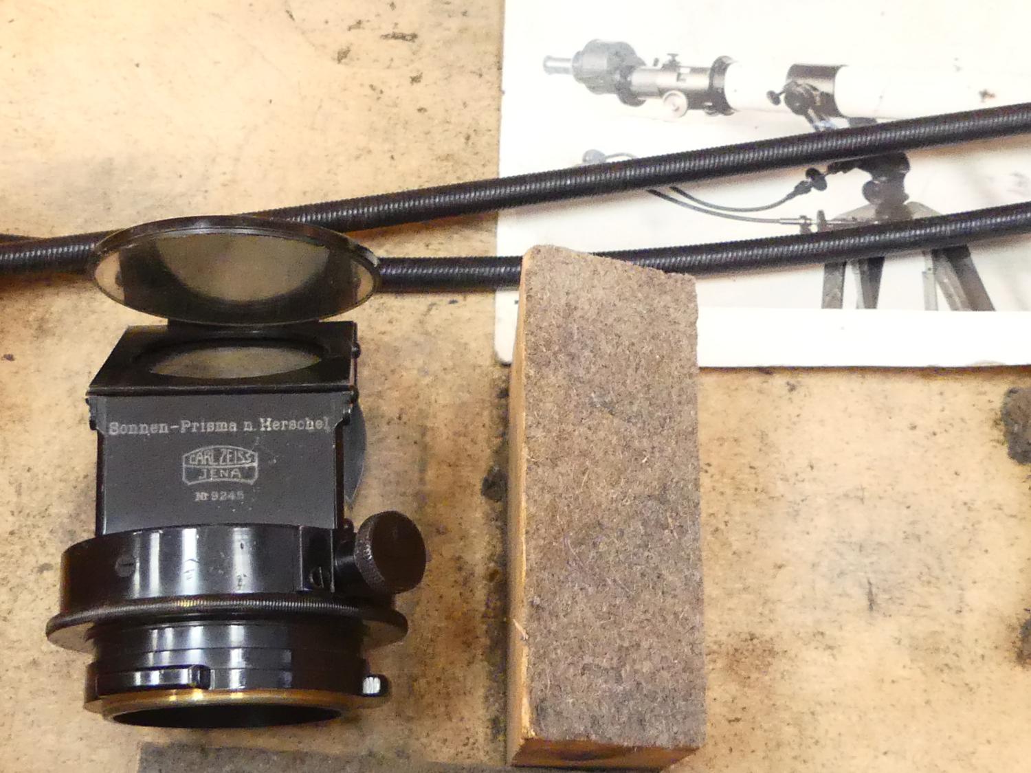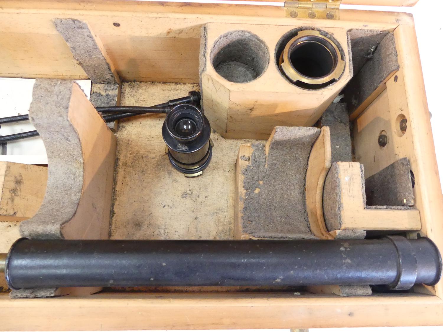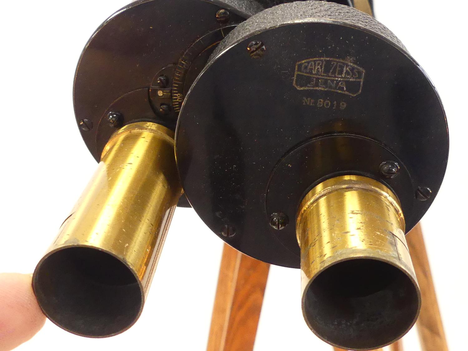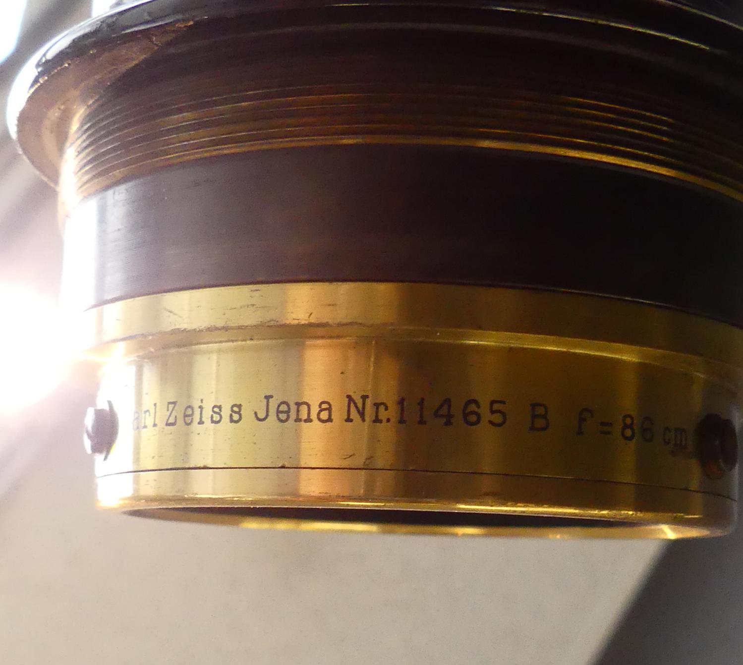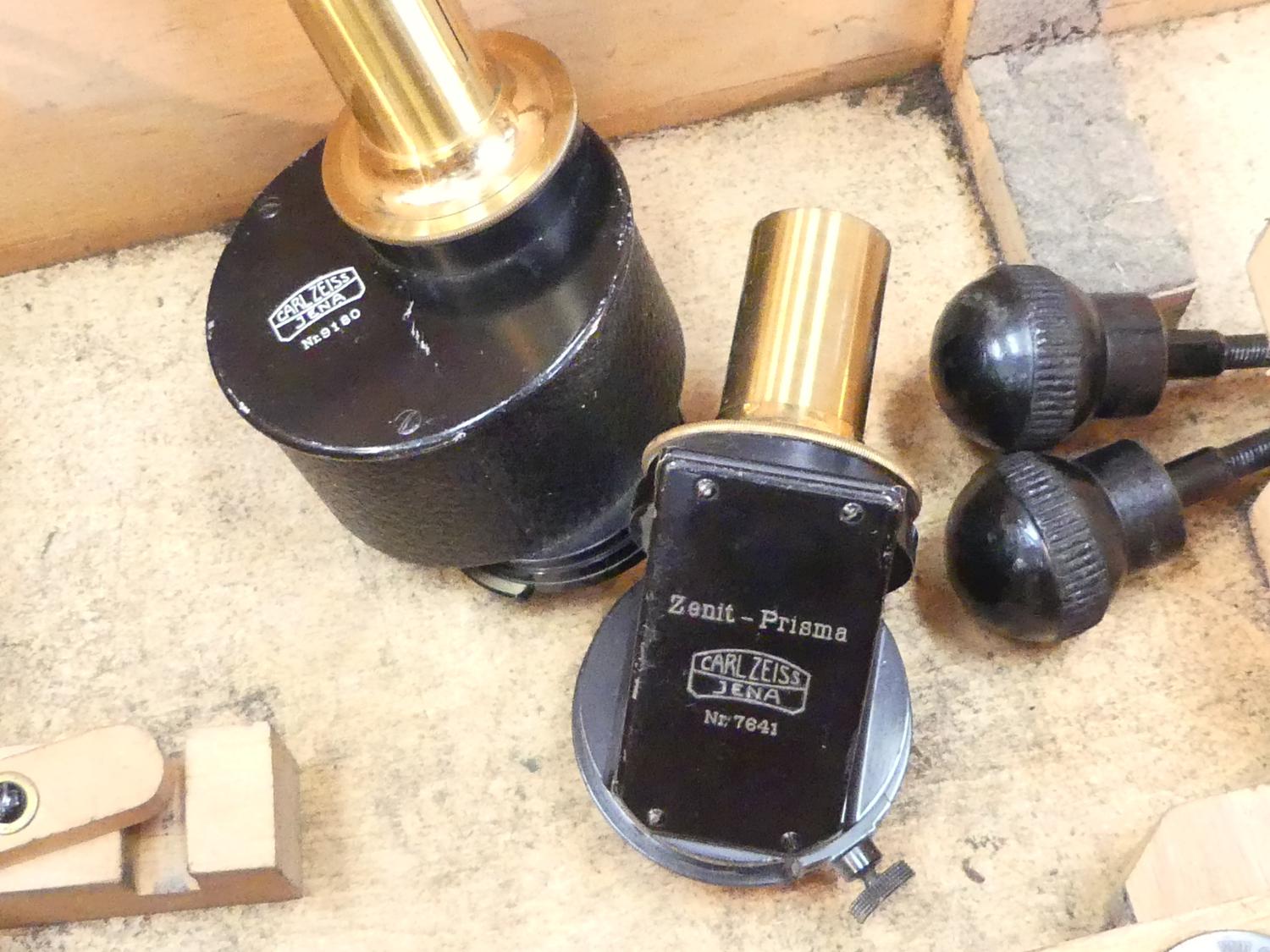 carl zeiss jena brass refractor telescope, serial #8019, with enamelled finish, original case filled with lenses and optics and tripod stand