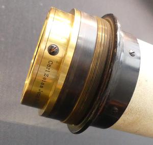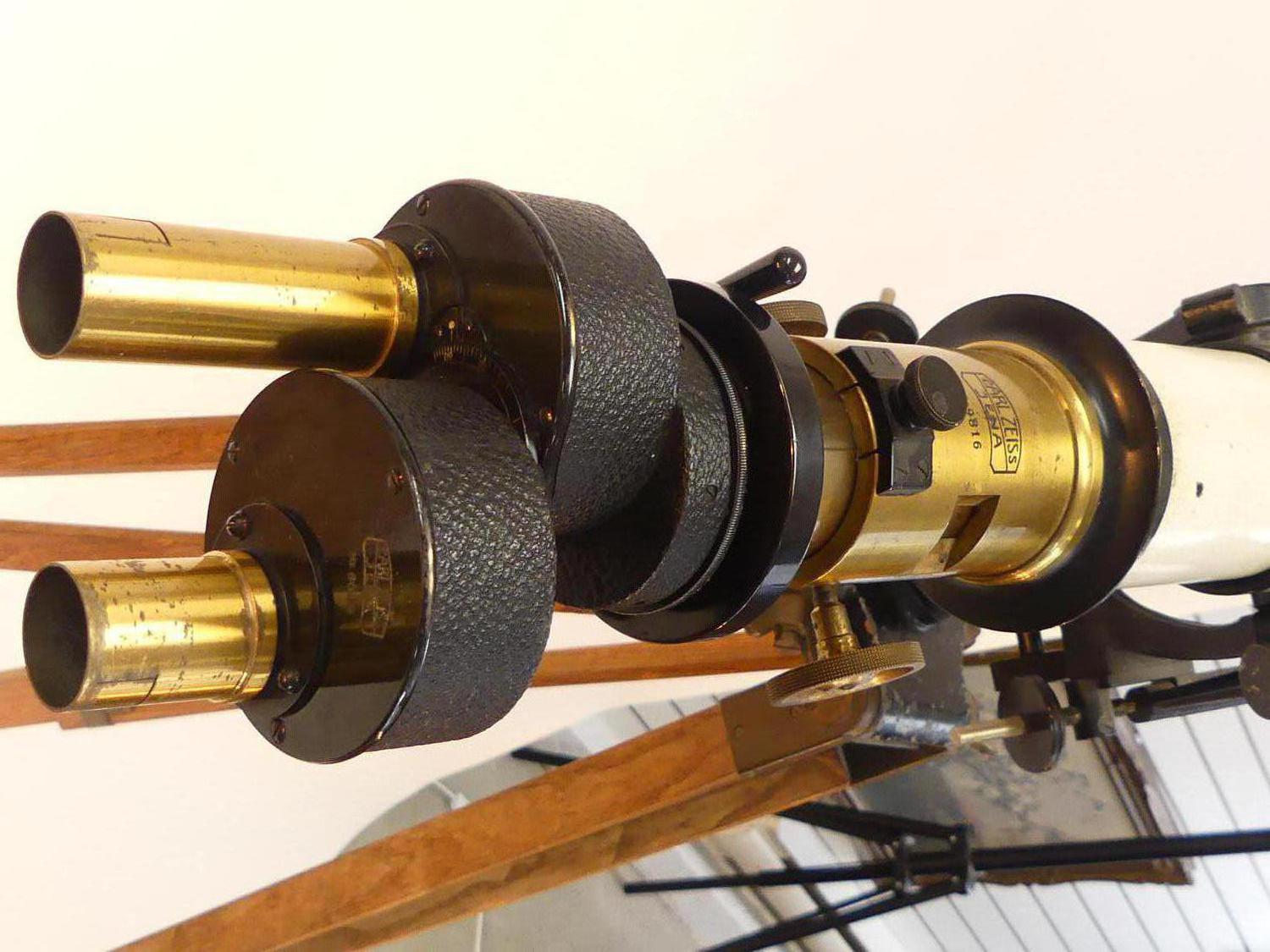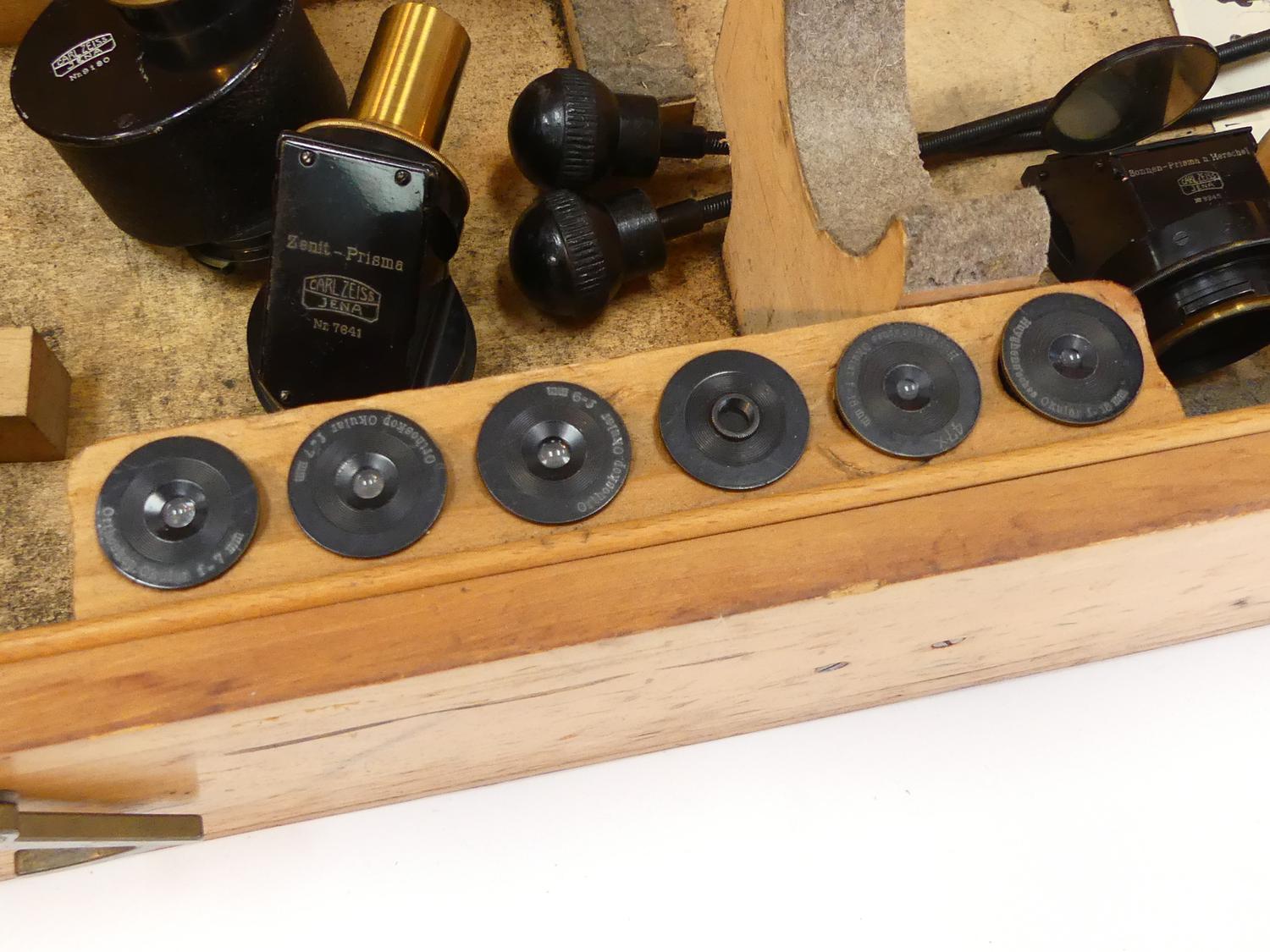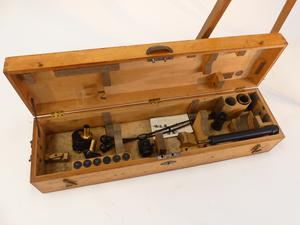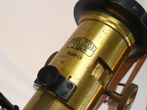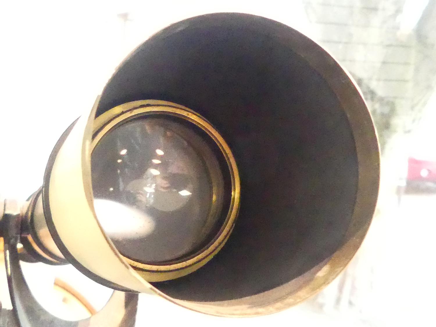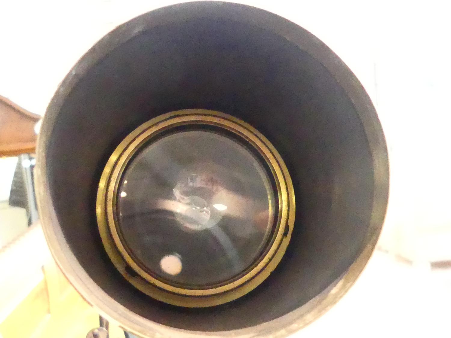 carl zeiss jena brass refractor telescope, serial #8019, with enamelled finish, original case filled with lenses and optics and tripod stand