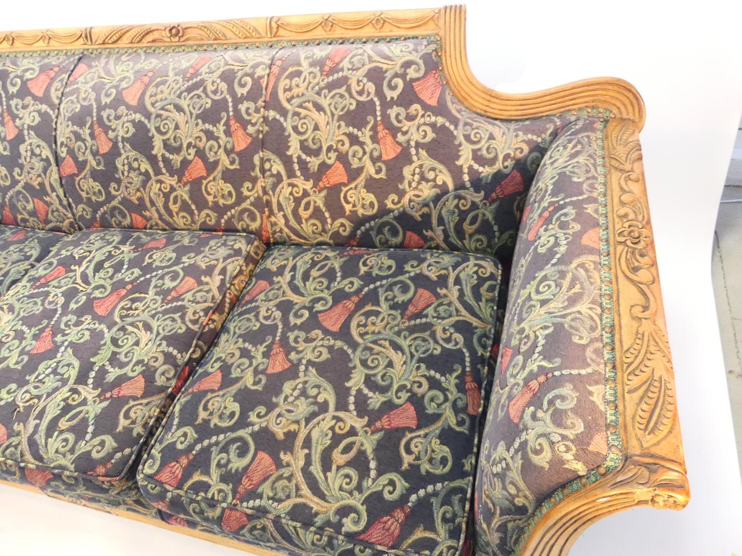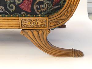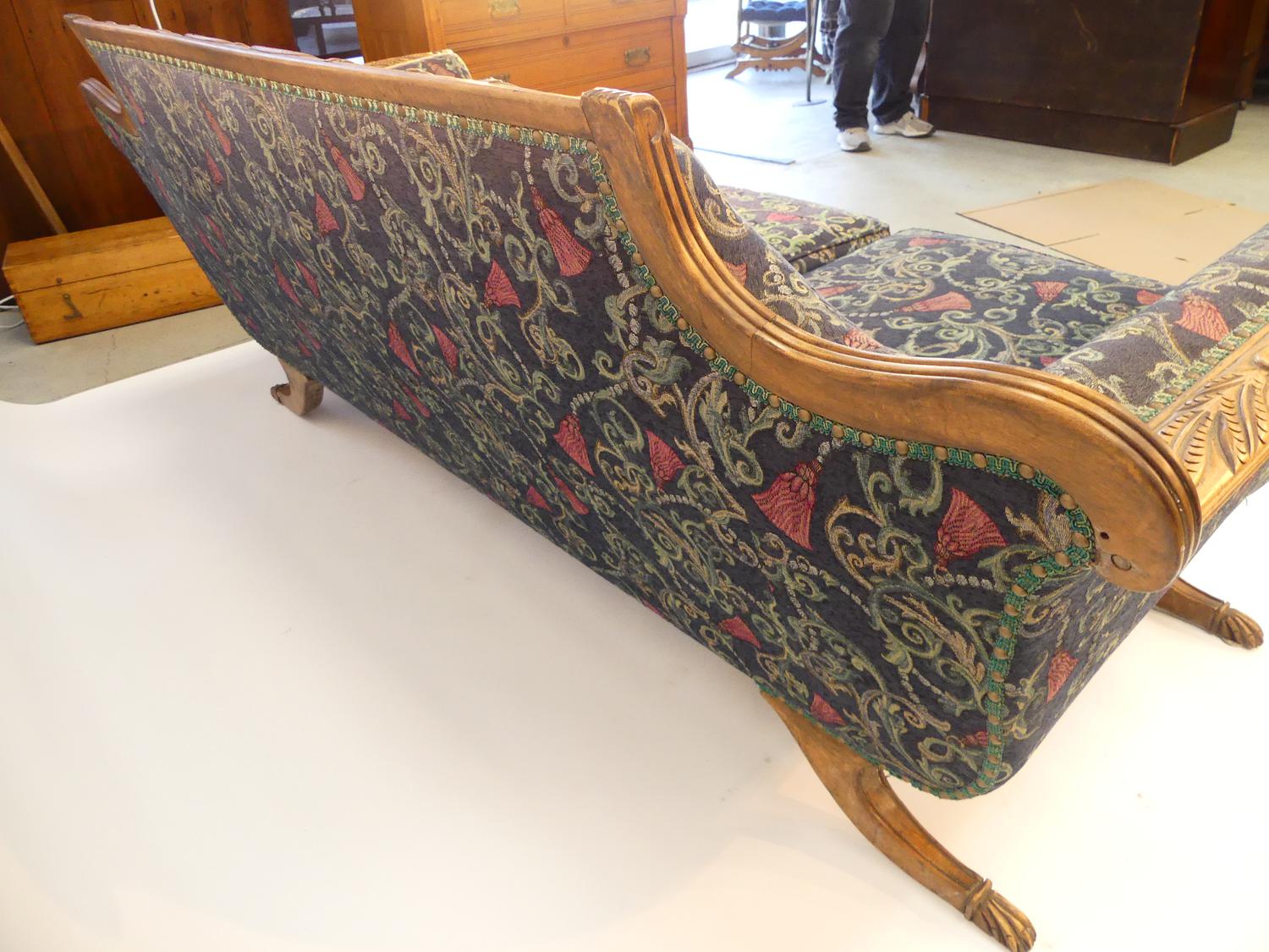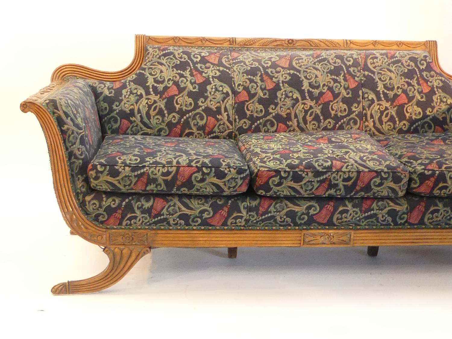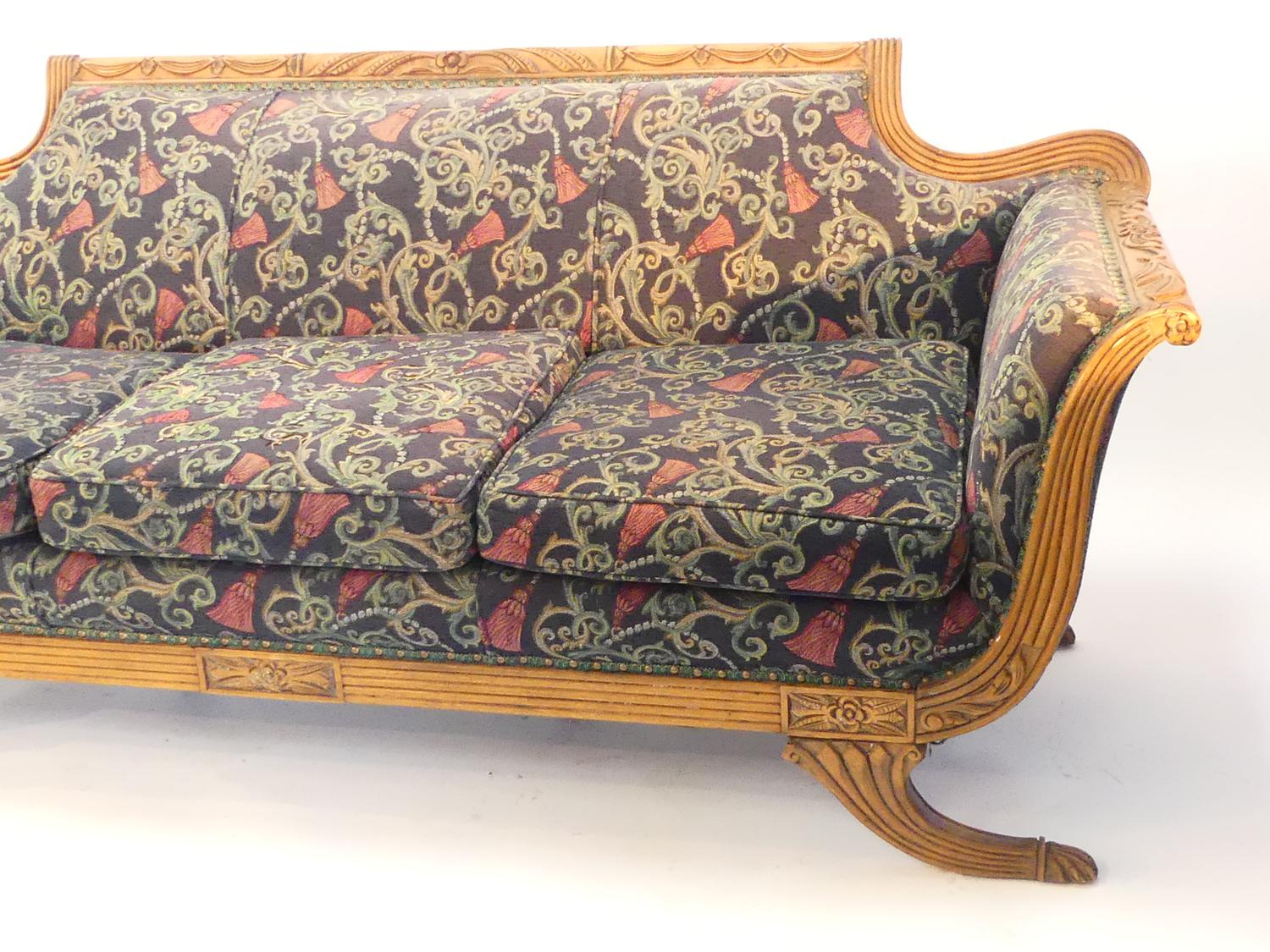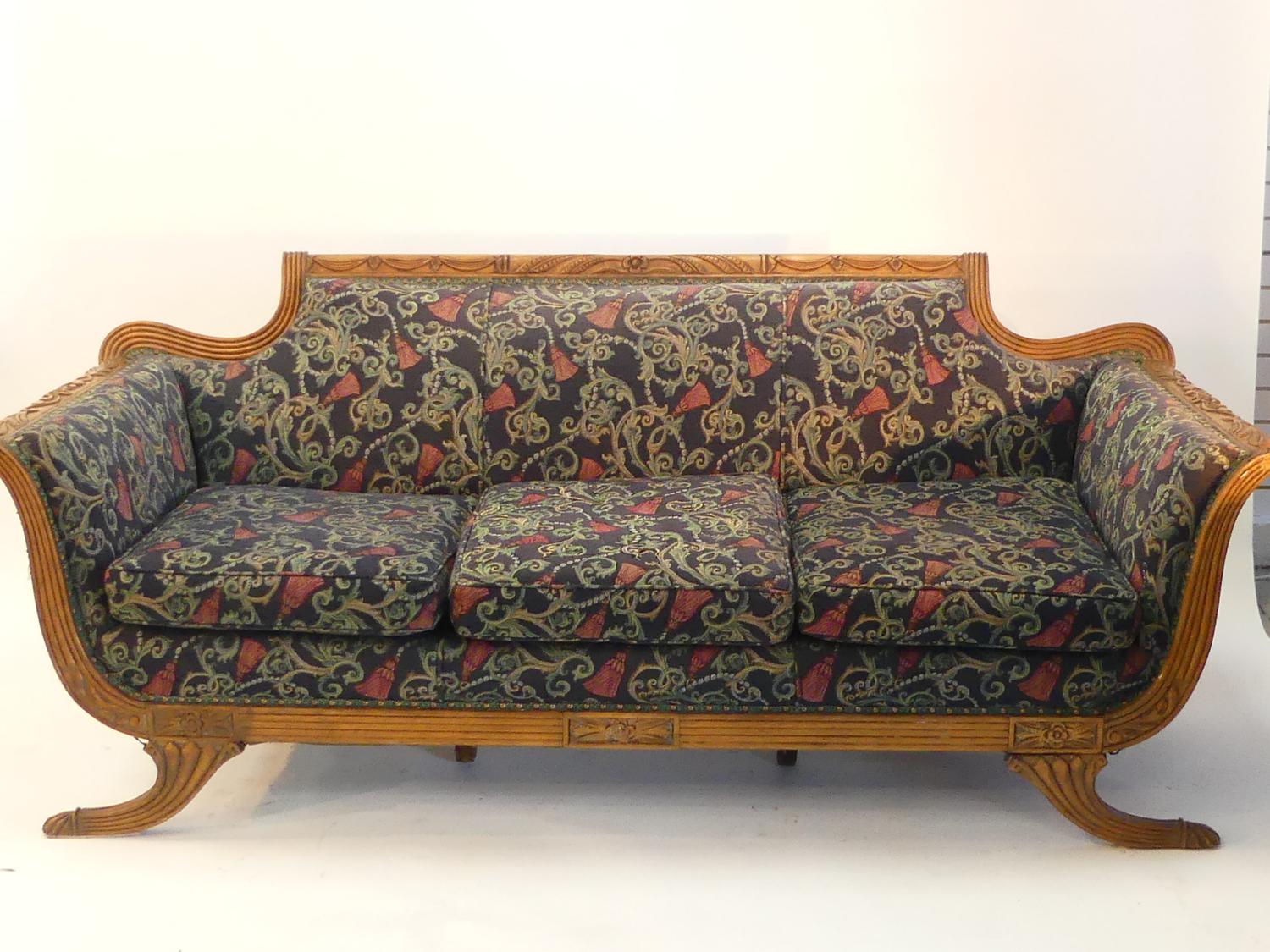 regency style carved mahogany upholstered settee, c.1900, 32" x 79" x 35"